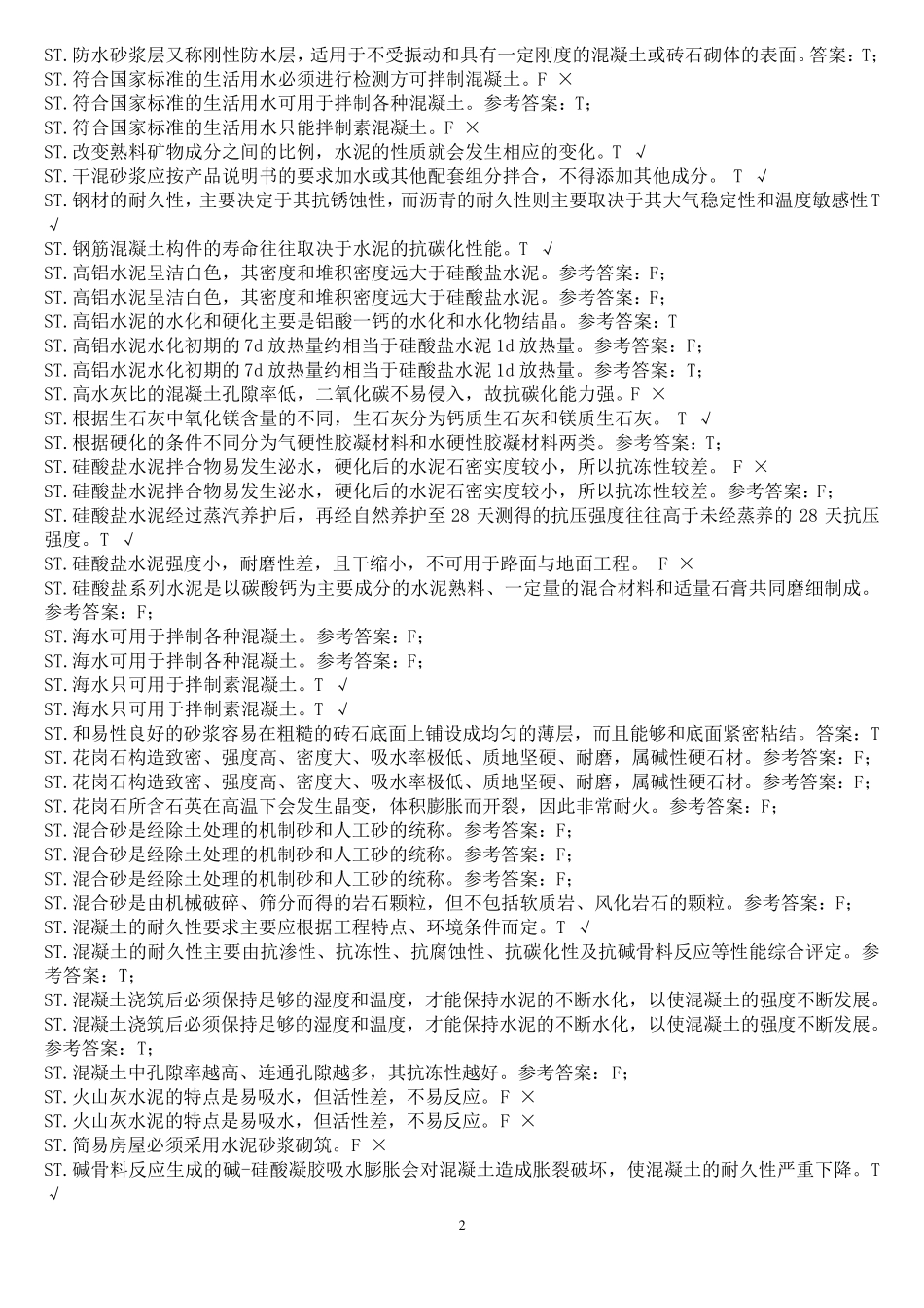 1 中 央 电 大 建 筑 施 工 与 管 理 专 科 《 建 筑 材 料 (A)》 期 末 机 考 题 库 说 明 : 试 卷 号 码 : 2342 课 程 代 码 ; 00855 适 用 专 业 及 学 历 层 次 : 道 路 桥 梁 工 程 施 工 与 管 理 、 工 程 造 价 管 理 和 建 筑 施 工 与 管 理 ; 专 科 考 试 方 式 及 成 绩 : 形 考 ( 50%); 终 考 机 考 ( 50%) 一 、 判 断 题 题 库 ST.按 其 性 能 和 用 途 不 同 , 可 将 水 泥 分 为 通 用 水 泥 、 专 用 水 泥 和 特 性 水 泥 三 大 类 。 参 考 答 案 : T; ST.按 其 在 建 筑 物 中 的 所 处 部 位 , 可 将 建 筑 材 料 分 为 基 础 、 主 体 、 屋 面 、 地 面 等 材 料 。 T √ ST.白 水 泥 和 彩 色 水 泥 主 要 用 于 砌 筑 建 筑 物 的 墙 体 。 T√ ST.拌 合 用 水 所 含 物 质 不 应 降 低 混 凝 土 的 耐 久 性 。 T√ ST.拌 合 用 水 所 含 物 质 不 应 影 响 混 凝 土 的 工 作 性 及 凝 结 。 参 考 答 案 : T ST.拌 合 用 水 所 含 物 质 不 应 影 响 混 凝 土 的 工 作 性 及 凝 结 。 参 考 答 案 : T; ST.必 须 采 取 严 格 有效的 控制措施 和 手段, 以保证混 凝 土 的 施 工 质 量。 T √ ST.材 料 的 矿物 组成 主 要 是指元素组成 相同 , 但分 子团组成 形 式 各异的 现象。 参 考 答 案 : T ST.材 料 的 矿物 组成 主 要 是指元素组成 相同 , 但分 子团组成 形 式 各异的 现象。 参 考 答 案 : T; ST.材 料 的 微观结 构主 要 是指材 料 在 原子、 离子、 分 子层 次 上的 组成 形 式 。 参 考 答 案 : T; ST.材 料 的 微观结 构主 要 是指材 料 在 原子、 离子、 分 子层 次 上的 组成 形 式 。 参 考 答 案 : T; ST.采 用 合 理 砂率可 以改善混 凝 土 拌 合 物 的 工 作 性 。 T √ ST.采 用 合 理 砂率可 以改善混 凝 土 拌 合 物 的 工 作 性 。 T √ ST.采 用 减水 剂、 引气剂、 缓凝 剂可 有效改...