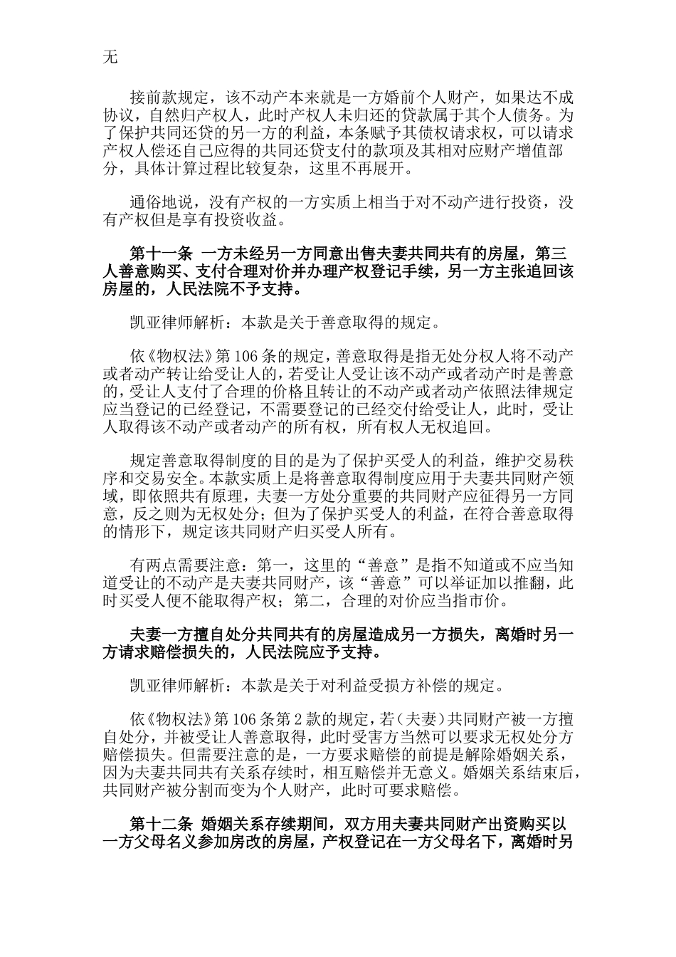 无凯亚律师解读《婚姻法》司法解释三(中)第七条婚后由一方父母出资为子女购买的不动产,产权登记在出资人子女名下的,可按照婚姻法第十八条第(三)项的规定,视为只对自己子女一方的赠与,该不动产应认定为夫妻一方的个人财产。凯亚律师解析:本款是关于于父母出资为子女买房情形,房屋产权认定的规定。依《婚姻法》第17、第18条的规定,夫妻在婚姻关系存续期间,受赠财产归夫妻共同所有;但是若赠与人明确只赠与一方的,受赠财产仅归一方所有。由此,为了避免产权纠纷,本款直接规定“产权登记在出资人子女名下的”就是赠与人“明确”不动产只赠与一方的意思表示,该不动产认定为夫妻一方个人财产。但是,仔细推敲,本款规定尚存瑕疵。因为登记是不动产物权变动的依据,一方父母虽然出资买房,但是为了避税,一般情况下会将房屋产权从卖方名下直接过户到己方子女名下,也即一方父母并没有拥有过房屋的产权,此时赠与的实质上是货币而非房屋,货币并非不动产,上述意思推定是否与《婚姻法》的规定有冲突值得商榷。由双方父母出资购买的不动产,产权登记在一方子女名下的,该不动产可认定为双方按照各自父母的出资份额按份共有,但当事人另有约定的除外。凯亚律师解析:本款是关于于双方父母出资为子女买房情形,房屋产权认定的规定。本款规定与前款规定的逻辑不同。前款规定认为,“产权登记在出资方子女名下”就是赠与人明确表示“只赠与一方”;本款规定认为,即使“产权登记在一方子女名下”,双方父母的意思也只是把自己那部分份额给自己的子女,双方子女也是按份共有。可见,前后两款规定都是为了避免可能产生的产权纠纷而推定当事人的意思。同样的问题,严格来讲双方父母赠与的是货币而非不动产,此时上述意思推定是否与《婚姻法》的规定有冲突尚待讨论。第八条无民事行为能力人的配偶有虐待、遗弃等严重损害无民事行为能力一方的人身权利或者财产权益行为,其他有监护资格的人可以依照特别程序要求变更监护关系;变更后的监护人代理无民事行为能力一方提起离婚诉讼的,人民法院应予受理。凯亚律师解析:本条是关于无民事行为能力人离婚的规定。无依《民法通则》第17条的规定,可担任无民事行为能力人监护人的人有:配偶、父母、成年子女、其他近亲属以及关系密切的其他亲属、朋友。这里要注意上述五类人有顺序,配偶是第一顺序,因此本款规定只有在配偶有严重损害无民事行为能力一方的人身权利或者财产权益的行为时,才能申请变更监护。注意,损害对象包括“财产权益”而非仅仅“人身权利”。第九条夫以妻擅自中止妊娠侵犯其生育权为由请求损害赔偿的,人民法院不予支持;夫妻双方因是否生育发生纠纷,致使感情确已破裂,一方请求离婚的,人民法院经调解无效,应依照婚姻法第三十二条第三款第(五)项的规定处理。凯亚律师解析:本条是关于生育权的规定。之所以不支持男方生育权的诉求,原因可能有二:其一,维护男女平等。任何违背女性意志的男性强权都会造成男女的不平等;其二,保护女性身体健康。女方在怀孕、生育和哺乳期间可能要承担很大艰辛和风险,所以要将决定权交给女方。但是,夫妻因是否生育而发生纠纷,其造成的后果很可能就是导致夫妻感情破裂。因此本条第二款规定,一方因此提出离婚的,人民法院若调解无效,应准予离婚。此时,因是否生育发生纠纷导致感情破裂的情形属于《婚姻法》第32条第3款第5项“其他导致夫妻感情破裂”的情形。第十条夫妻一方婚前签订不动产买卖合同,以个人财产支付首付款并在银行贷款,婚后用夫妻共同财产还贷,不动产登记于首付款支付方名下的,离婚时该不动产由双方协议处理。凯亚律师解析:本款是关于不动产权属的规定。依《婚姻法》第18条的规定,夫妻一方婚前财产属于个人财产。因此,一方婚前支付首付款,并将不动产(主要是指房屋)权登记在自己的名下,此时该不动产就属于其婚前个人财产。当然,如果离婚时拥有房产方想把婚前个人财产给另一方也没有问题,因此本款规定,不动产归属由双方协商处理。依前款规定不能达成协议的,人民法院可以判决该不动产归产权登记一方,尚未归还的贷款为产权登记一方的个人债务。双方婚后共同还...