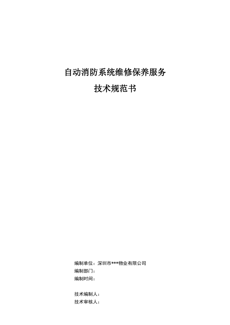 自动消防系统维修保养服务技术规范书编制单位:深圳市***物业有限公司编制部门:编制时间:技术编制人:技术审核人:自动防系统维修保养服务技术规范书自动消防系统维修保养服务技术规范书一、干系人说明·需求方----深圳市**物业有限公司**大厦管理处、**花园管理处,提出自动消防系统维修保养服务需求信息。·技术方案统筹编制方----***中心,负责收集需求信息、维修保养建议,统筹并编制技术规范书,并负责后期维修保养服务实施监管等工作。·技术评审方----***中心代表、需求方代表对技术规范书从安全、管理、技术等方面进行评审,确保其符合公司及集团要求。二、适用标准、法规本维修保养服务除符合原设计图纸要求外,必须符合现行国家、行业、广东省、深圳市的标准、法规,包括但不限于以下标准、法规:《火灾自动报警系统设计规范》(GB50116-2013)《火灾自动报警系统施工及验收规范》(GB50166-2007)《高层民用建筑设计防火规范》2005年版(GB50045-95)《建筑电气工程施工质量验收规范》(GB50303-2002)《建筑设计防火规范》(GB50016-2006)《建筑消防设施的维护管理》GA587-2005《建筑消防设施检测技术规程》GA503-2004《建筑给水排水设计规范》2009年版(GB50015-2003)《建筑给水排水及采暖工程施工质量验收规范》(GB50242-2002)《自动喷水灭火系统施工及验收规范》(GB50261-2005)《自动喷水灭火系统设计规范》(GB50084-2005)《室外给水设计规范》(GB50013-2006)《室外排水设计规范》2011年版(GB50014-2006)《建筑防腐蚀工程施工质量验收规范》(GB50212-2002)《建筑电气装置工程施工质量验收规范》(GB50303-2002)《电气装置安装工程电气设备交接试验标准》(GB50150-2006)《电气装置安装工程电缆线路施工及验收规范》(GB50168-2006)《机械设备安装工程施工及验收通用规范》(GB50231-2009)《压缩机、风机、泵安装工程施工及验收规范》(GB50275-98)《民用建筑设计通则》(GB50352-2005)《建筑内部装修设计防火规范》(GB50222-95)《非承重砌块墙体设计规范》(SJG13-2004)《中华人民共和国消防法》(20090501)《火灾自动报警系统组件兼容性要求》(GB22134)《汽车库、修车库、停车场设计防火规范》(GB50067-97)《通风与空调工程施工质量验收规范》(GB50243-2002)《气体灭火系统施工及验收规范》(GB50263-2007)《智能建筑设计标准》(GBT50314-2006)《采暖通风与空气调节设计规范》(GB50019-2003)其他:与自动消防系统有关的维修保养标准、法规。三、维修保养服务项目概况1、项目名称和地点序号项目名称项目地点自动消防系统投入/改造使用时间12345672、项目参数序号建筑名称建筑用途建筑层数建筑面积建筑高度1写字楼地上30层/地下3层46313m298m2写字楼地上20层16246m286m3写字楼地上6层/地下2层10108m231.2m4住宅地上17层/地上30层及地下一层115773m260m/100m5住宅地上36层/地下2层84634m297.4m6住宅多层/高层/地下2层359513.4m27写字楼南楼40层/北楼24层/地下3层158830m2南楼176m/北楼107m四、维修保养服务范围1、自动消防系统维修保养服务范围包括:火灾自动报警系统、火灾联动控制系统、自动喷水灭火系统、室内外消火栓系统、消防专用电话系统、消防紧急广播兼背景音乐系统、气体灭火系统(七氟丙烷、二氧化碳、泡沫)、可燃气体报警系统、防火卷帘门系统(与消防系统联动的部分)、防烟及排烟系统(消防专用部分)、消防联动系统及其图文中心、电气火灾自动报警系统、消防水炮系统、火灾事故照明及疏散指示系统等。2、自动消防系统与各专业的界定:线路、模块,末端至各专业的控制箱/柜的继电器(不含继电器)。与供配电系统管理界面:各消防设备、设施(含专用控制柜和箱)配电开关的下接线点为界,以上归供配电系统管理,以下归自动消防系统管理。与空调通风系统管理界面:消防专用的正压送风、排烟系统归自动消防系统管理;自动消防系统与空调通风系统共用的防烟、排烟和送风系统,从消防回路模块至空调通风系统控制柜...