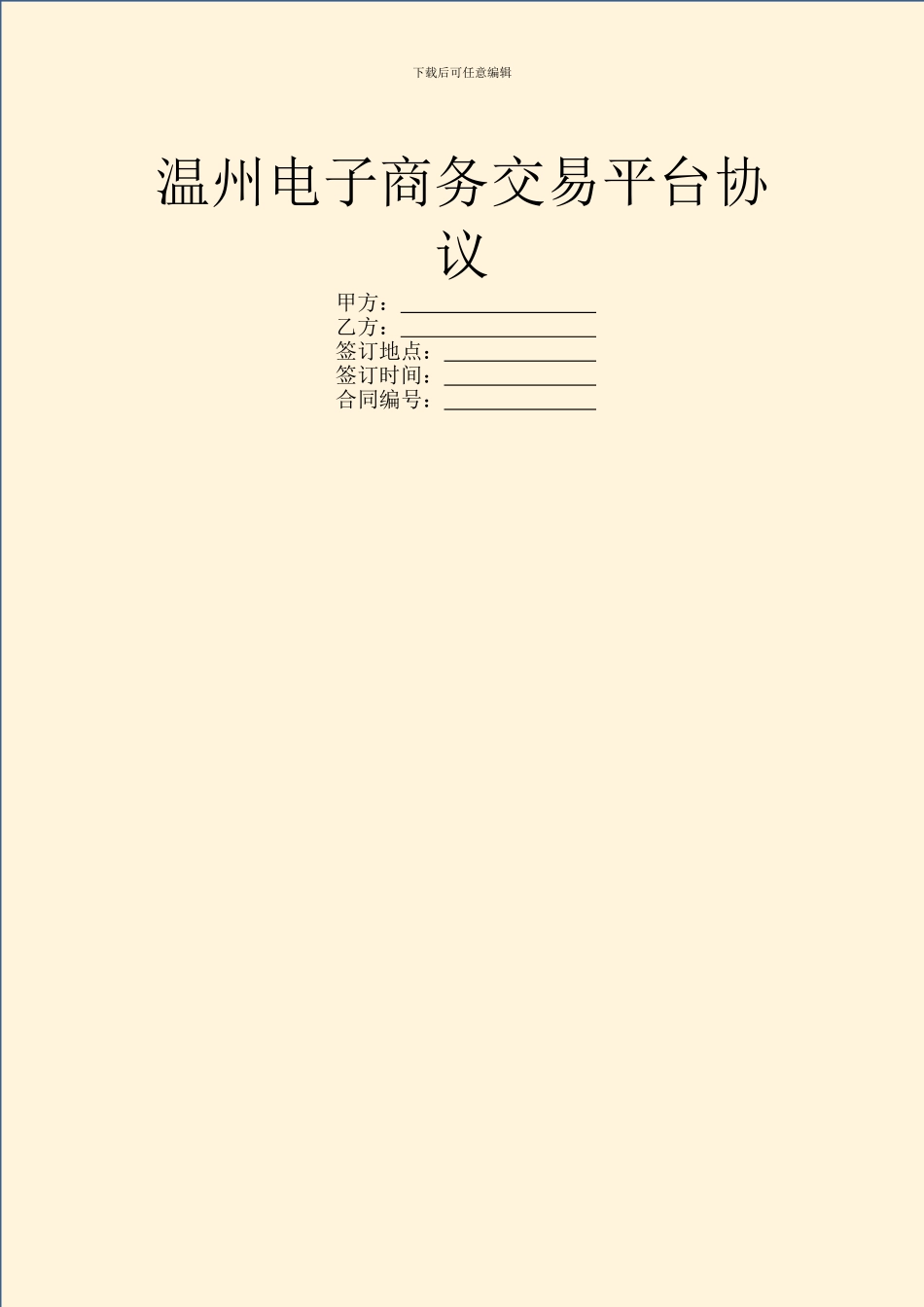 下载后可任意编辑温州电子商务交易平台协议甲方: 乙方: 签订地点: 签订时间: 合同编号: 下载后可任意编辑甲方:_______________乙方:_______________鉴于甲方作为零售商、乙方作为供给商,双方存在商品购销/代销关系;鉴于甲方初步开发建设了_________电子商务交易平台;鉴于双方同意通过_________电子商务交易平台进行包括订货、补货、退货、销售及库存等信息查询在内的业务活动。经过友好协商,双方就下列事宜达成全都看法:一、电子商务交易平台的使用1.本协议生效后,在系统运行初期,原来的传真联系方式仍然有效,当系统运行一段时期后,经甲方发出通知,将停止原传真往来模式的使用,彻低执行本协议的规定。2.甲方天天定时向乙方传送数据信息,乙方应在甲方传送数据信息后的 2-3 个小时内立即进行反馈:甲方于天天上午 11:00、下午 3:00 分离两次在电子商务交易平台上发布订单等数据信息;乙方在天天下午的 2:00 和 5:00 以前进行两次反馈操作。二、使用要求1.甲方负责电子商务交易平台系统的维护、运行,提供天天 24 小时的不间断服务。2.甲方负责对乙方的系统维护人员进行培训,并对乙方在实际操作与运用中的技术问题提供技术询问服务。3.乙方应遵守《_______________》,根据该手册的规定登录平台、维护机构信息、进行订单、退货单、对帐单的网上接收、查询和反馈。4.甲方更新手册应准时通知乙方,乙方应遵守更新后的使用手册。5.双方应确保数据信息的精确性与准时性。三、使用环境1.乙方必需配备一台可以顺当登录互联网的计算机、并配备一名系统维护人员(详细要求见手册)。2.乙方使用电子商务交易平台时,甲方向乙方提供用户名、密码,下载后可任意编辑乙方应准时更改初始密码,作好用户信息的保密工作。四、相关费用的支付乙方应向甲方支付下列费用:1.系统开通费:签署本协议时,乙方一次性向甲方支付人民币_________元。2.系统服务费与培训费:乙方按人民币_________元/季的标准,于每季度开头 5 日内向甲方交纳系统服务费与培训费(系统开通第一年,乙方支付系统开通费后免交第一年系统服务费与培训费)。3.信息分享与使用费:库存、销售等信息的查询与分享功能开通使用后,乙方按当年交易额_________%的标准,于每年度终了接到甲方通知后 5 日内向甲方交纳信息分享与使用费。五、保密一方对另一方的数据信息负有保密义务,不得泄露给第三方(包括各方内部未被授权的人员),并应实行相应的保密措施保证数据...