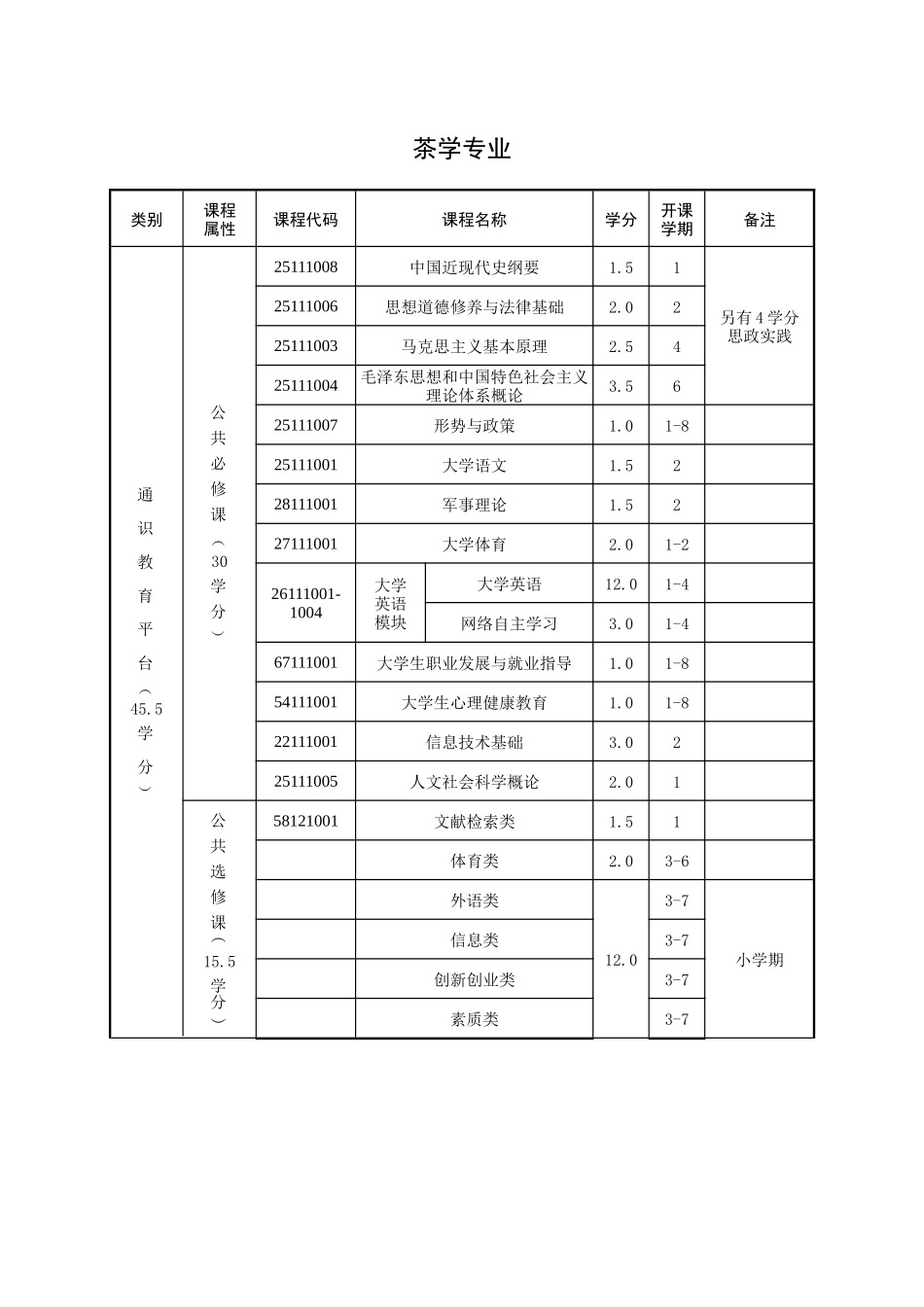茶学专业人才培养方案一、专业名称:茶学(TeaScience);专业代码:090104二、培养目标:培养具备茶学、食品科学和农业生物科学等方面的基本理论、基本知识和基本技能,能在农业、工业、商贸等领域或部门从事茶学有关的技术与设计、推广与开发、经营与管理、教学与科研等工作的高级科学技术人才。三、培养要求:本专业学生主要学习茶学、食品科学和农业生物科学等方面的基本理论、基本知识,受到茶树栽培、育种和茶叶加工、审评与检验、茶文化、茶的综合利用和经济贸易等方面的基本训练,具有茶树栽培、育种和茶叶加工、审评与检验、茶文化、茶的综合利用和经济贸易方面的基本能力。毕业生应获得以下几方面的知识和能力:1.具备扎实的数学、物理、化学、生物、计算机等基本理论知识;2.掌握茶叶生物化学、茶叶优质高产、茶叶品质形成和食品工程的基本理论;3.具备茶叶加工、审评、检验、茶文化和经济贸易方面的方法和技能;4.具备农业可持续发展的意识和基本知识,了解茶学学科前沿和发展趋势;5.熟悉国家对农业和茶业的有关方针、政策和法规;6.掌握科技文献检索基本方法,具有一定的科学研究和实际工作能力;7.有较强的调查研究与决策、组织与管理、口头与文字表达能力,具有独立获取知识、信息处理和创新的基本能力。四、主干学科:园艺学,食品科学与工程。五、主要课程:茶叶生物化学,茶树栽培学,茶树育种学,茶树病虫防治学,制茶学,茶叶审评与检验,茶叶机械,茶艺,茶叶市场营销学。六、主要实践教学环节:茶树栽培教学实习,制茶教学实习,茶叶审评教学实习,土壤学教学实习,植物学教学实习,生产实习,毕业实习与毕业论文(设计)。七、学制与修业年限:标准学制4年,修业年限3-6年。八、授予学位:农学学士。九、毕业学分要求:最低修读总学分178.7学分,其中必修课学分不低于105.2学分,选修课33.5学分,实践课不低于40学分。十、课程设置及教学进程表:茶学专业类别课程属性课程代码课程名称学分开课学期备注通识教育平台(45.5学分)公共必修课(30学分)25111008中国近现代史纲要1.51另有4学分思政实践25111006思想道德修养与法律基础2.0225111003马克思主义基本原理2.5425111004毛泽东思想和中国特色社会主义理论体系概论3.5625111007形势与政策1.01-825111001大学语文1.5228111001军事理论1.5227111001大学体育2.01-226111001-1004大学英语模块大学英语12.01-4网络自主学习3.01-467111001大学生职业发展与就业指导1.01-854111001大学生心理健康教育1.01-822111001信息技术基础3.0225111005人文社会科学概论2.01公共选修课(15.5学分)58121001文献检索类1.51体育类2.03-6外语类12.03-7小学期信息类3-7创新创业类3-7素质类3-7茶学专业类别课程属性课程代码课程名称学分开课学期备注基础教育平台(51.2学分)科类基础课(41.2学分)17231022高等数学Ⅲ4.5117231031基础物理Ⅱ2.0217231033基础物理Ⅱ实验0.6217231042无机化学Ⅱ2.5117231073有机化学Ⅰ3.5217231081分析化学Ⅱ1.5217231027基础化学实验I1.0117231028基础化学实验Ⅱ1.5217231039生物统计Ⅱ2.5217231040生物统计Ⅱ实验0.7218231001植物学2.0218231027植物学实验0.8218231020植物生理学2.5418231023植物生理学实验0.9418231013生物化学2.5418231016生物化学实验0.9318231004普通微生物学2.0418231007普通微生物学实验0.7418231008普通遗传学2.0418231011普通遗传学实验0.7419231012土壤学2.0319231016土壤与植物营养实验0.63茶学专业类别课程属性课程代码课程名称学分开课学期备注基础教育平台(51.2学分)19231008气象学1.5319231009气象学实验0.3319231017植物营养学1.53专业基础课(10学分)16241030专业导论0.5129241005仪器分析1.5329241007仪器分析实验0.5320241120机械设计基础2.0518241040生物技术概论1.0616241007茶叶生物化学3.05双语课程16241008茶叶生物化学实验1.55专业教育平台(42学分)专业核心课(24学分)16351043茶学专业英语3.0516351038茶树栽培学3.0516351039茶树栽培学实验1.0616351036茶树育种学2.5616351045茶树育种学实验0.5616351037茶树病虫防治学2.0616351034茶树病虫防...