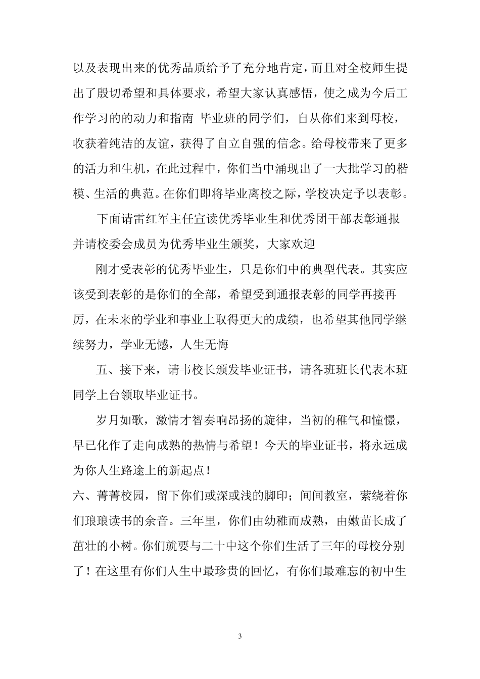 1 毕业典礼大会讲话稿 陈吴乡中 2 陈吴乡中2011 届毕业典礼 各位同学,各位老师: 大家早上好!时光飞逝,日月如梭,三年弹指一挥间。带着梦想,带着期待,踏着布满荆棘的征途,三年,我们一路走来。“春种一粒粟,秋收万颗子”在这收获的季节里,我们全体师生聚集在这里隆重举行陈吴乡中 2011届毕业典礼。 首先请允许我代表学校向即将毕业的陈吴乡中学子们表示最热烈的祝贺,祝贺你们圆满完成了初中的学业任务,祝贺你们在人生的征途上又将跨出新的一步,老师为你们感到欣慰和自豪,祝贺你们! 下面,我宣布陈吴乡中 2011届毕业典礼正式开始! 一、让我们用最热烈的掌声欢迎我们九年级的全体同学入场。 二、下面举行升旗仪式:全体立正,出旗、奏乐。升国旗,奏唱国歌。 三、同学们,从你第一次踏入陈吴乡中的大门开始,老师们关怀的目光始终在你身边徘徊,你们的健康成长离不开家长和老师们的关爱,更离不开学校领导的关怀。下面让我们用热烈欢迎韦永生校长致辞! 四、韦校长的讲话语重心长,请同学们牢记在心,在今后的人生道路上时时鞭策自己,奋勇前行。刚才韦校长在致辞中,不但对毕业班师生三年来的工作、学习、生活所做出的努力和贡献 3 以及表现出来的优秀品质给予了充分地肯定,而且对全校师生提出了殷切希望和具体要求,希望大家认真感悟,使之成为今后工作学习的的动力和指南!毕业班的同学们,自从你们来到母校,收获着纯洁的友谊,获得了自立自强的信念。给母校带来了更多的活力和生机,在此过程中,你们当中涌现出了一大批学习的楷模、生活的典范。在你们即将毕业离校之际,学校决定予以表彰。 下面请雷红军主任宣读优秀毕业生和优秀团干部表彰通报并请校委会成员为优秀毕业生颁奖,大家欢迎! 刚才受表彰的优秀毕业生,只是你们中的典型代表。其实应该受到表彰的是你们的全部,希望受到通报表彰的同学再接再厉,在未来的学业和事业上取得更大的成绩,也希望其他同学继续努力,学业无憾,人生无悔! 五、接下来,请韦校长颁发毕业证书,请各班班长代表本班同学上台领取毕业证书。 岁月如歌,激情才智奏响昂扬的旋律,当初的稚气和憧憬,早已化作了走向成熟的热情与希望!今天的毕业证书,将永远成为你人生路途上的新起点! 六、菁菁校园,留下你们或深或浅的脚印;间间教室,萦绕着你们琅琅读书的余音。三年里,你们由幼稚而成熟,由嫩苗长成了茁壮的小树。你们就要与二十中这个你们生活了三年的母校分别了!在...