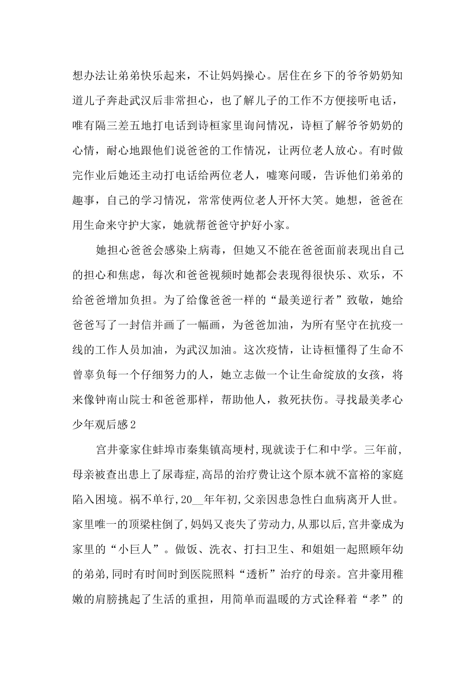 2024 寻找最美孝心少年观后感个人感悟多篇 《众里寻你—2024“寻找最美孝心少年”颁奖典礼》开播了,看了最美孝心少年,内心久久不能平复,他们展现了中华民族最宝贵的品质!下面我整理 2024 寻找最美孝心少年观后感个人感悟 5 篇范文,欢迎阅读,希望对大家有帮助!寻找最美孝心少年观后感 1 爸爸在用生命来守护大家,她就帮爸爸守护好小家。黄诗桓的爸爸作为呼吸内科副主任医师,疫情期间上交请战书并奔赴湖北武汉抗疫一线,诗桓在家帮助妈妈做家务、照顾 1 岁的弟弟,为爷爷奶奶宽心,让爸爸安心在一线工作。生命不曾辜负每一个仔细努力的人,她立志做一个让生命绽放的女孩。 今年年初,一场突如其来的新冠肺炎打破了原本喧闹的春节。黄诗桓的爸爸作为呼吸内科副主任医师,义无反顾地上交请战书并奔赴湖北武汉抗疫一线。她看着爸爸的背影,心中有不舍、有担心,但她明白救死扶伤是爸爸的责任,是爸爸做医生的初心。她支持爸爸的决定,并为他感到骄傲与自豪。 她有机会就和爸爸视频聊天,分享他在抗疫中的点点滴滴,为他加油打气。为了让爸爸没有后顾之忧,安心抗“疫”,她主动承担自己力所能及的家务,例如洗碗、洗衣服、扫地等。因为弟弟年纪小,才只有 1 岁多,她主动帮妈妈照顾弟弟。弟弟哭闹时,她就想办法让弟弟快乐起来,不让妈妈操心。居住在乡下的爷爷奶奶知道儿子奔赴武汉后非常担心,也了解儿子的工作不方便接听电话,唯有隔三差五地打电话到诗桓家里询问情况,诗桓了解爷爷奶奶的心情,耐心地跟他们说爸爸的工作情况,让两位老人放心。有时做完作业后她还主动打电话给两位老人,嘘寒问暖,告诉他们弟弟的趣事,自己的学习情况,常常使两位老人开怀大笑。她想,爸爸在用生命来守护大家,她就帮爸爸守护好小家。 她担心爸爸会感染上病毒,但她又不能在爸爸面前表现出自己的担心和焦虑,每次和爸爸视频时她都会表现得很快乐、欢乐,不给爸爸增加负担。为了给像爸爸一样的“最美逆行者”致敬,她给爸爸写了一封信并画了一幅画,为爸爸加油,为所有坚守在抗疫一线的工作人员加油,为武汉加油。这次疫情,让诗桓懂得了生命不曾辜负每一个仔细努力的人,她立志做一个让生命绽放的女孩,将来像钟南山院士和爸爸那样,帮助他人,救死扶伤。寻找最美孝心少年观后感 2 宫井豪家住蚌埠市秦集镇高埂村,现就读于仁和中学。三年前,母亲被查出患上了尿毒症,高昂的治疗费让这个原本就不富裕的家庭陷入困境。祸不单行,20__年年初,父...