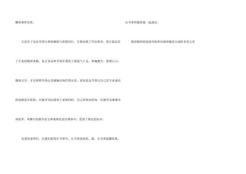 “书香”演讲稿精彩开头 “书香”演讲稿精彩开头 演讲稿网我:曾经有一些幻梦,氤氲在我成长的岁月里。那芳香是油墨的香,那幻梦是读书打造我专业成长的梦幻。踏进书香的无声世界里,我欣喜的觉察这里的世界是如此的奇异多才。 曾经有一股芳香,流淌在我记忆的脑海里。 曾经有一些幻梦,氤氲在我成长的岁月里。 那芳香是油墨的香,那幻梦是读书打造我专业成长的`梦幻。 踏进书香的无声世界里,我欣喜的觉察这里的世界是如此的奇异多才,透过阵阵书香,我打开了《透视名师课堂教学》,那先进的教学理念和一个个生动的教学方法,帮我解决了教学中一个又一个的难题,是他的芳香教会了我如何和孩子们相处,学会了如何调控课堂。如何为孩子们制造自由健康的成长空间。 在阵阵书香里,我捧起了《教学现场与教学详情》这本书,再细细品尝中,我被书中精彩的课堂实录和鲜亮的理论剖析所吸引,是他让我领悟到优秀老师的风采,领悟到名师的教学艺术,从中也让自己明确了教学方向。 沉醉在书香里,我在《做一个聪慧的老师》这本书里懂得了做一名老师聪慧与教学的机灵,观赏到了教育家们独具风格的艺术魅力。 而《体育有效教学》这本书更让我学会了反思自己,反思自己在教学中的有效性,让自己时时扪心自问:今日的课上的有新气象吗?今日的学习有什么新收获?今日处理的问题是否有了新的方式,与同学交往是否觉察了同学的新转变……… 正是这阵阵书香,我仿佛感受到自己在与专家、名师进行心灵的对话与沟通,享受着名家零距离的指教,先进的理念升华了我的思想,在活生生的教学案例中,为我开启了才智的大门,也正是这阵阵芳香把我积累心灵已久的疑难问题迎刃而解。 正是品尝了书香芳香,我感觉自己在教学上的想法和灵感也越来越多,看,每次教研活动中,出口成章、见解独到,在教学上也开头变得得心应手,游刃有余了。 在书香的的熏陶下和滋润下我也感觉到自己一每天的进步和成长。不是吗?正是书香的清爽使我有了丰厚的文化底蕴,有了较高的人文素养、让自己的教学闪耀着睿智光荣。 正是有了这份芳香让我的激情与思想同行,让我加强了学法指导,更让我品尝了丰富的精神食粮,也正是这种书香在课堂上我底气十足。妙趣横生、指教江山,激扬文字,才会使师生的心灵碰撞出灿烂的火花,而也是这书香让自己在专业成长的道路进步很快,在被评为区级骨干老师同时,自己所参加的每一次教学竞赛都名列前茅,所撰写的教学论文和案例发表在博客中,受到了博友...