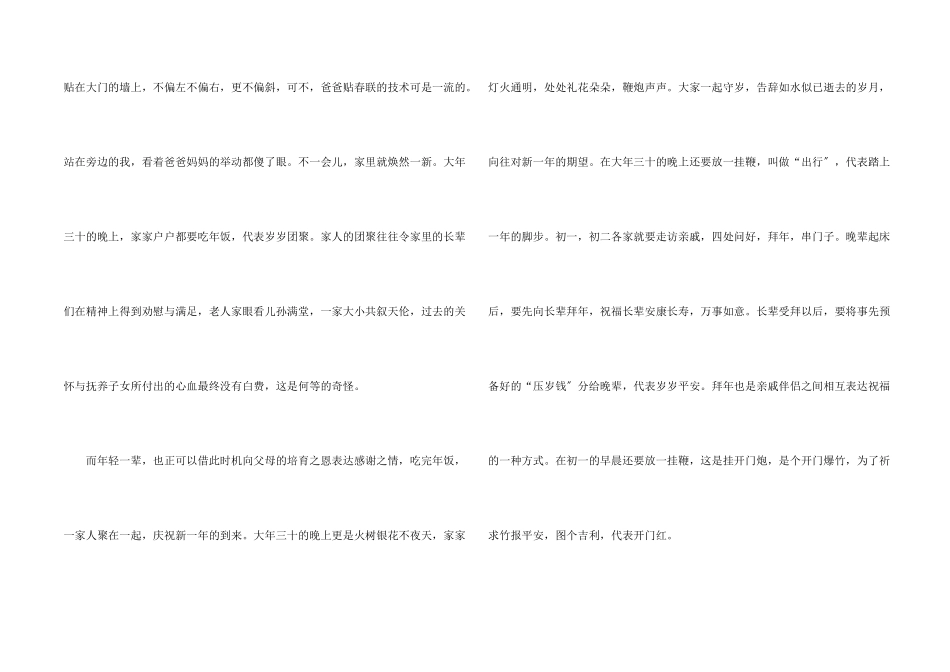 写大年初一 10 篇 关于写大年初一作文 10 篇 在日常学习、工作抑或是生活中,大家确定都接触过作文吧,借助作文人们可以反映客观事物、表达思想感情、传递学问信息。你知道作文怎样才能写的好吗?下面是我为大家收集的写大年初一作文 10 篇,仅供参考,欢送大家阅读。 写大年初一作文 篇 1 盼啊,盼啊,春节最终降落了,伴随着时钟的敲响,我们又迎来了奇异的传统佳节-春节。我满怀兴奋地呼喊着:“新年到了!新年到了!〞啊!新年多么奇异啊!我兴奋地在家中来回地跑着,抑制不住自己喜悦的心情。 当我跑到阳台边时,突然,烟花飞上天空,在一瞬间,炸开了,天上礼花朵朵。有的像银色的流星,有的像五光十色的花儿,有的像橙色的外套,还有的像金色的太阳,把大地照得犹如白昼一样,美不胜收!过年前,家家户户门前张灯结彩,我家也不例外。一大早,爸爸妈妈就忙得不行开交。只见妈妈利索地擦洗着桌椅、门窗、地板,屋子的里里外外都被妈妈擦洗得闪闪发光,最值得惊异的是玻璃擦得明晃晃的,看上去像没有隔着玻璃似的。再看看爸爸,留神翼翼地用透亮胶布把春联贴在大门的墙上,不偏左不偏右,更不偏斜,可不,爸爸贴春联的技术可是一流的。站在旁边的我,看着爸爸妈妈的举动都傻了眼。不一会儿,家里就焕然一新。大年三十的晚上,家家户户都要吃年饭,代表岁岁团聚。家人的团聚往往令家里的长辈们在精神上得到劝慰与满足,老人家眼看儿孙满堂,一家大小共叙天伦,过去的关怀与抚养子女所付出的心血最终没有白费,这是何等的奇怪。 而年轻一辈,也正可以借此时机向父母的培育之恩表达感谢之情,吃完年饭,一家人聚在一起,庆祝新一年的到来。大年三十的晚上更是火树银花不夜天,家家灯火通明,处处礼花朵朵,鞭炮声声。大家一起守岁,告辞如水似已逝去的岁月,向往对新一年的期望。在大年三十的晚上还要放一挂鞭,叫做“出行〞,代表踏上一年的脚步。初一,初二各家就要走访亲戚,四处问好,拜年,串门子。晚辈起床后,要先向长辈拜年,祝福长辈安康长寿,万事如意。长辈受拜以后,要将事先预备好的“压岁钱〞分给晚辈,代表岁岁平安。拜年也是亲戚伴侣之间相互表达祝福的一种方式。在初一的早晨还要放一挂鞭,这是挂开门炮,是个开门爆竹,为了祈求竹报平安,图个吉利,代表开门红。 啊,春节!奇异的春节,欢快的春节,人人宠爱的春节,我眼中的春节,我爱你啊!你真的—很精彩! 写大年初一作文 篇 2 我盼啊,盼啊,最终盼到...