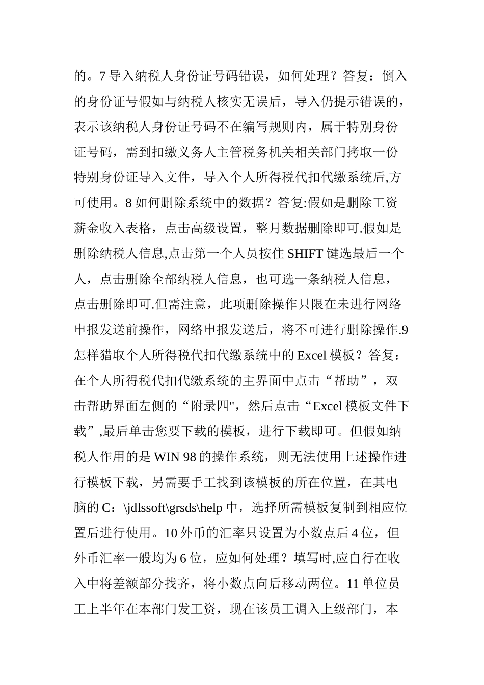 个人所得税代扣代缴系统软件问题整理(操作问题) 个人所得税代扣代缴系统软件问题整理(操作问题)序号问题内容问题答案 1 在进行代扣代缴软件设置向导的时候,已经正确填写了扣缴义务人编码,扣缴义务人名称,纳税人识别号,但是在最后一步完成的时候却提示该三项出错是什么原因?答复:纳税人的基础信息没有在主管税务机关的征管科认定上,纳税人需要联系一下主管税务机关的征管科。2 纳税人信息导入时总是出现错误,该填写的项目也都填了,总提示有一行数据导入失败,是何原因?答复:在导入时,"导入的数据文件有标题行“一项前对勾没有打上。因为假如不把这个勾选上,导入信息时则把标题行也作为一条数据导入。3 个人所得税代扣代缴软件中基本医疗与基本养老保险,应填个人缴纳的部分还是单位缴纳的部分?答复:填写个人的部分。4 单位员工离职,在个人所得税代扣代缴软件中应做如何处理?答复:应先修改纳税人信息中状态一栏为非正常,再进行正常工资薪金报表填报。5 外籍人员不含税的工资薪金如何在个人所得税代扣代缴软件中录入?答复:需要把不含税的收入换算成含税收入进行填写个人所得税代扣代缴系统。6 工号为什么不是按顺序进行排序的?答复:首先应按数字填写规则按规定填写(如工号为001、002,而不是 1、2 的填写方式)才行,另外,点击工号后,会出现向上或向下的箭头,表示按正序或是倒序排序的。7 导入纳税人身份证号码错误,如何处理?答复:倒入的身份证号假如与纳税人核实无误后,导入仍提示错误的,表示该纳税人身份证号码不在编写规则内,属于特别身份证号码,需到扣缴义务人主管税务机关相关部门拷取一份特别身份证导入文件,导入个人所得税代扣代缴系统后,方可使用。8 如何删除系统中的数据?答复:假如是删除工资薪金收入表格,点击高级设置,整月数据删除即可.假如是删除纳税人信息,点击第一个人员按住 SHIFT 键选最后一个人,点击删除全部纳税人信息,也可选一条纳税人信息,点击删除即可.但需注意,此项删除操作只限在未进行网络申报发送前操作,网络申报发送后,将不可进行删除操作.9怎样猎取个人所得税代扣代缴系统中的 Excel 模板?答复:在个人所得税代扣代缴系统的主界面中点击“帮助”,双击帮助界面左侧的“附录四",然后点击“Excel 模板文件下载”,最后单击您要下载的模板,进行下载即可。但假如纳税人作用的是 WIN 98 的操作系统,则无法使用上述操作进行模板下载,另需要手工找到该模板的所在位...