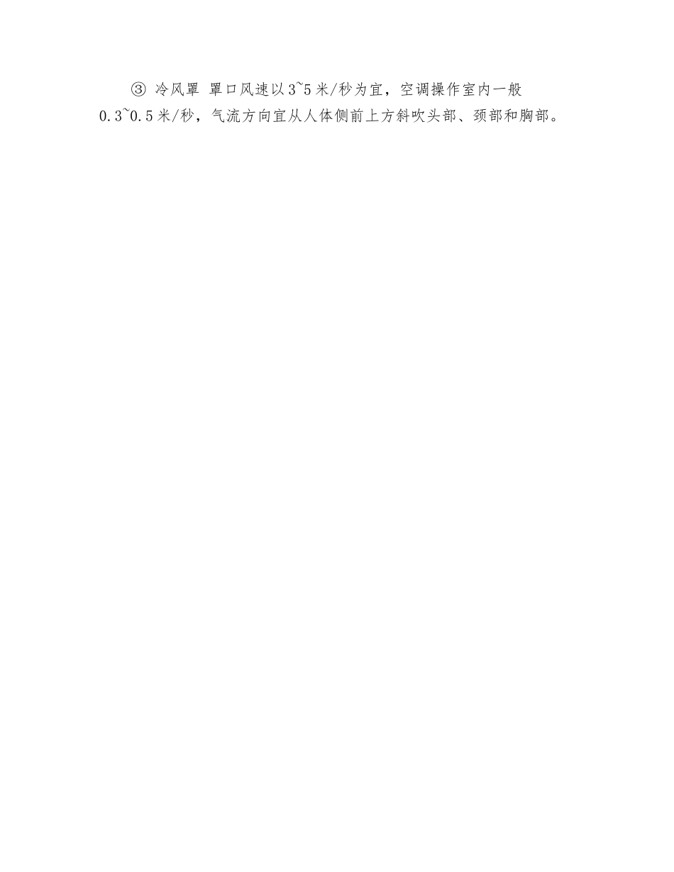 防暑降温的工程技术措施防暑降温的工程技术措施,也可引用防尘“八字方针”中的“革、水、密、封”四个字。“革”:即“革新工艺”,对生产工艺中使用的产热设备、原(辅)材料等热源,进行合理的布局或工艺革新(冷加工、降低热处理温度等)。“水”:即“湿式作业”,其适用于在工艺上一切可行的以水降温方式的作业。其原理是通过洒水成幕的作用,以隔绝热源的对流、扩散对劳动者的影响。洒水成幕的方式,水滴要大而急。由于洒水成幕的能源浪费较大,目前不常采纳于防暑降温。“密”:即“密闭热源”, 对热源的密闭效果要好,因此,通常在密闭的同时,还进行保温处理,以防热源的扩散;同样,要减少漏风的缝隙和孔洞,尽可能减少观察窗、操作口;在可能的情况下,同时辅于以高压水降温的方式使热源得到快速冷却。“风”:即“通风降温”,这是防暑降温的主要技术措施。有自然通风和机械通风二种方式。自然通风 在工程总体设计的工艺及生产环境布局、高温作业车间建筑物的构造要求时体现。机械通风 机械通风由密闭的冷风机、风管、冷风罩三个部分组成。① 冷风机 进风口应设在排风口的上风侧,开口处应低于排风口,但距地面 2 米以上,并设有防护罩;② 风管 风量的损失和风速的下降越小越好;③ 冷风罩 罩口风速以 3~5 米/秒为宜,空调操作室内一般0.3~0.5 米/秒,气流方向宜从人体侧前上方斜吹头部、颈部和胸部。