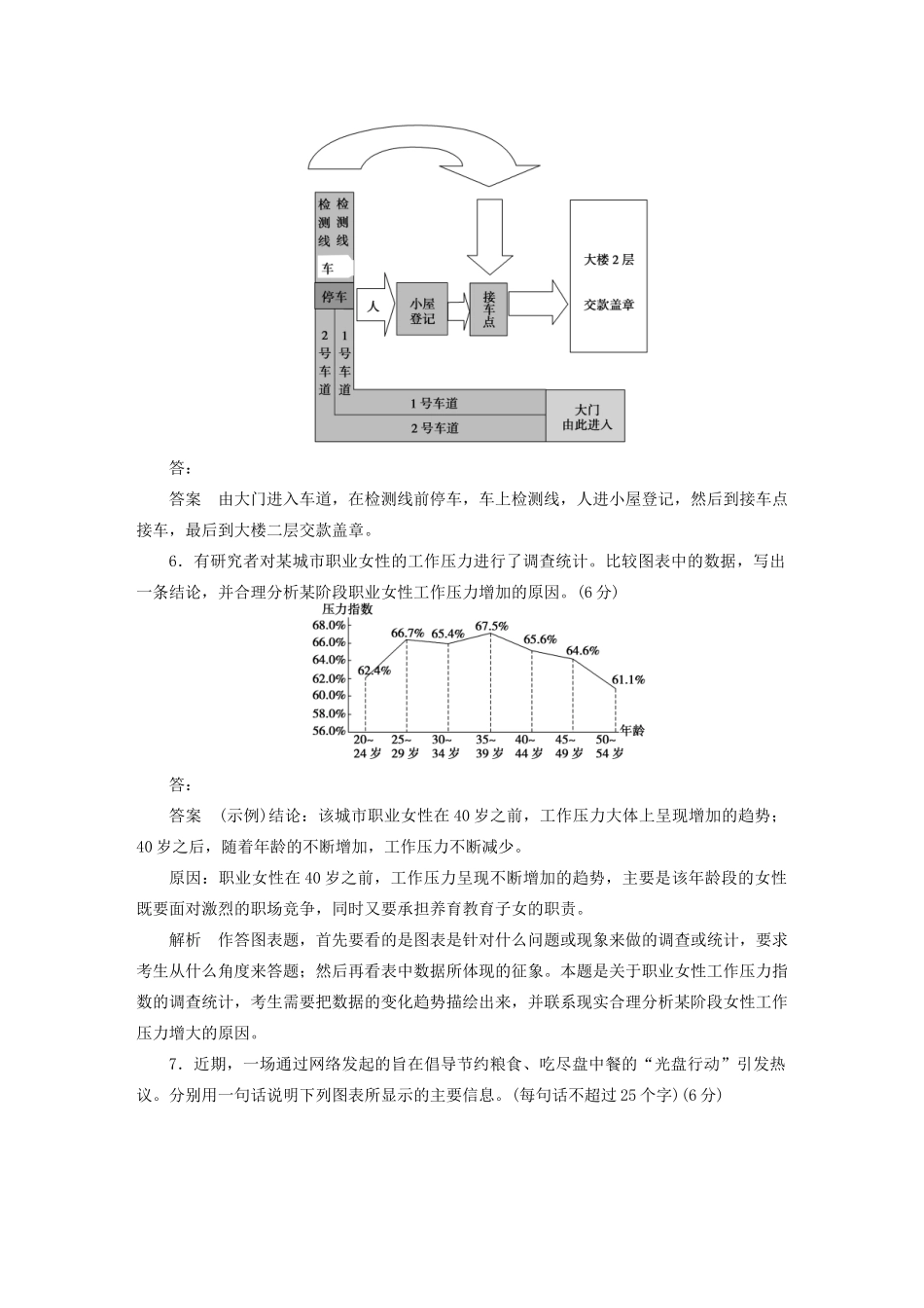 限时对点规范训练4图文转换(用时:45分钟满分:54分)1.观察下面这幅漫画,请描述画面内容(不超过70个字),并给这幅漫画拟一个标题。(6分)注讲课的是鸡,听课的是鸭。答:答案(示例)内容:画面上,鸡正在给鸭讲有关游泳的知识。鸡站在讲台后道貌岸然地讲着课,盲目而愚蠢的鸭严肃认真地做着笔记。黑板上有用中文、英语书写的“浅谈游泳HOWTOSWIM”。标题:外行领导内行误人子弟以其昏昏,使人昭昭纸上谈“泳”终觉浅教鸭游泳鸡为师“专家”授课2.月考结束后,高三将举行一次主题为“远离蛋壳心理”的班会。请你结合漫画内容,为主持人写一段开场白。要求:能够简要阐释“蛋壳心理”的内涵,语言流畅,不少于50个字。(6分)答:答案(示例)同学们,看到这幅漫画你一定心有所动吧?如何认识漫画中这种看似坚硬,实则如蛋壳般不堪一击、难以承受任何批评与挫折的心理状态呢?今天就让我们围绕“远离蛋壳心理”这一话题展开讨论,希望大家敞开心扉,畅所欲言。3.根据右面漫画内容,拟写一句公益广告词。要求:主题鲜明,态度真诚,构思新颖,语言简洁。(不超过18个字)(6分)答:答案(示例)①莫把奖励挂在墙上,要将服务落到行动。②“优质”不在口头,行动映射真假。4.阅读下面的表格,写出结论,并针对小学生的消费倾向提出简要的建议。(6分)被调查小学生的品牌识别能力项目购物时关注名牌能否识别服装名牌能否识别食品名牌完全可以基本可以能识别著名品牌不能识别完全可以基本可以不能识别占被调查比例54.32%31.80%20.50%42.10%5.60%52.36%34.62%13.02%(1)结论:(3分)(2)对小学生的消费倾向提出建议:(3分)答案(1)在小学生中普遍存在着崇尚名牌的消费倾向。(2)要根据客观需要和家庭承受能力来决定自己的消费行为,不能盲目攀比,赶时髦。5.(2014·河北唐山9月质检)下面是某车辆管理所的验车流程图,请用简洁的语句介绍整个流程,要求内容完整,表述准确,语言连贯,不超过75个字。(6分)答:答案由大门进入车道,在检测线前停车,车上检测线,人进小屋登记,然后到接车点接车,最后到大楼二层交款盖章。6.有研究者对某城市职业女性的工作压力进行了调查统计。比较图表中的数据,写出一条结论,并合理分析某阶段职业女性工作压力增加的原因。(6分)答:答案(示例)结论:该城市职业女性在40岁之前,工作压力大体上呈现增加的趋势;40岁之后,随着年龄的不断增加,工作压力不断减少。原因:职业女性在40岁之前,工作压力呈现不断增加的趋势,主要是该年龄段的女性既要面对激烈的职场竞争,同时又要承担养育教育子女的职责。解析作答图表题,首先要看的是图表是针对什么问题或现象来做的调查或统计,要求考生从什么角度来答题;然后再看表中数据所体现的征象。本题是关于职业女性工作压力指数的调查统计,考生需要把数据的变化趋势描绘出来,并联系现实合理分析某阶段女性工作压力增大的原因。7.近期,一场通过网络发起的旨在倡导节约粮食、吃尽盘中餐的“光盘行动”引发热议。分别用一句话说明下列图表所显示的主要信息。(每句话不超过25个字)(6分)答:答案(1)媒体对“光盘行动”的关注在一周内急速升温。(2)大多数网友对“光盘行动”给予支持。8.下面是国家防灾减灾日的徽标,请根据这幅徽标回答问题。(6分)(1)简要说明国家防灾减灾日徽标的构成要素。(3分)答:(2)请谈一谈国家防灾减灾日徽标的创意。(3分)答:答案(1)徽标以彩虹、伞、人为基本构图要素。(2)雨后天晴的彩虹蕴意着美好、未来和希望;伞是人们防雨的常用工具,其弧形形象代表保护、呵护之意;两个人代表着一男一女、一老一少……大家携手,共同防灾减灾。整个标识体现出积极向上的思想和保障人民群众生命财产安全之意。9.下图是一组真实的照片。二十年前奶奶推着孙子,二十年后孙子推着奶奶,照片拍摄于同一个地点。请紧扣画面细节,续写下面一段话,不超过80个字。(6分)时间都去哪儿了,二十年匆匆而过,我长大了,您却老了。答案(示例)二十年,您用小小的童车推着我快乐的童年,推着我幸福地成长。二十年,您身后的小树早已枝繁叶茂,而您却已华发苍颜。如今,我愿用我的青春年华,推出您安康的晚年。