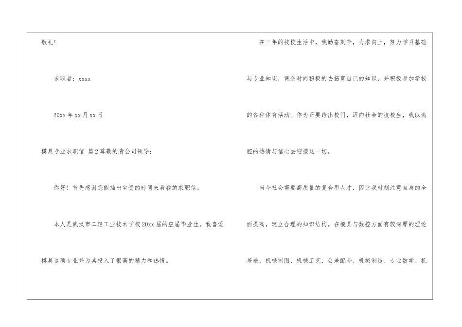 模具专业求职信 5 篇模具专业求职信 5 篇 在生活、工作和学习中,大家最不陌生的就是书信了吧,书信是向亲人、朋友、同志问候、谈话、联系事宜的一种应用文书。你知道书信怎样写才法律规范吗?下面是我帮大家整理的模具专业求职信 5 篇,欢迎阅读与收藏。 模具专业求职信 篇 1 尊敬的领导: 你好,我很荣幸并且和很有兴趣能够在贵公司求职,我是咸宁职业技术学院模具设计与制造专业的学生。 我是一名农村学生,有着农村人的勤劳、刻苦,并使我在学习上以很大的帮助,在日常的学习中,老师们很欣赏我,有时也叫我帮他讲课,认为我满足了他们的公司需要。 尽管我在学习上仔细、刻苦,有着优秀的成绩,但是我觉得想成为贵公司的一员,那还是远远不够的,所以在业余时间,我在泰康人寿保险公司做推销员,在那儿使我的沟通能力和团队意识大大提升,养成一股永不放弃的精神。07 年秋季,我还和一位同学策划、宣传、销售鞋套、海报,使我明白:只有真诚地为客户服务,客户才会源源不断。08 年秋季,我是武汉光谷计算机培训中心在我校计算机二级培训的招生主管,在很短时间里我们一共招到 49 人,这段经历大大锻炼了我的领导力。 在生活上,我乐于助人,所以同学们都喜爱我,很乐意与我交往,认为我是一个值得交往的人。 面对知识飞涨的社会,必须活到老,学到老。所以我报考了CET4 级和工商企业管理自考的本科专业,并且我擅长唱歌,曾几次在晚会上登台亮过相。我信任我对贵公司一定有帮助。 此致敬礼! 求职者:xxxx 20xx 年 xx 月 xx 日模具专业求职信 篇 2 尊敬的贵公司领导: 你好!首先感谢您能抽出宝贵的时间来看我的求职信。 本人是武汉市二轻工业技术学校 20xx 届的应届毕业生。我喜爱模具这项专业并为其投入了很高的精力和热情。 在三年的技校生活中,我勤奋刻苦,力求向上,努力学习基础与专业知识,课余时间积极的去拓宽自己的知识,并积极参加学校的各种体育活动。作为正要跨出校门,迈向社会的技校生,我以满腔的热情与信心去迎接这一切。 当今社会需要高质量的复合型人才,因此我时刻注意自身的全面提高,建立合理的知识结构。在模具与数控方面有较深厚的理论基础,机械制图、机械工艺、公差配合、机械制造、专业数学、机械加工、电脑绘图等各方面有了一定基础。 三年技校生活的学习和锻炼,给我仅是初步的经验积累,对于迈向社会远远不够的,但所谓士为知已者死,我信任自己的饱满的工作热情以及仔细...