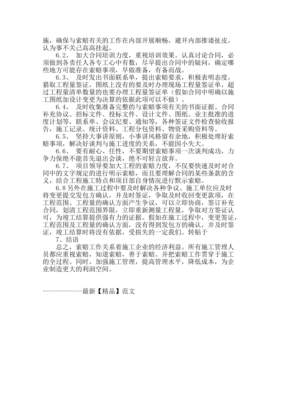 浅谈建筑工程中索赔问题及对策浅谈建筑工程中索赔问题及对策 摘要:由于建筑行业竞争激烈,施工企业过多,而建设项目较少从而导致"僧多粥少"的局面。发包方与承包方很难形成平等的经济合同关系。施工企业为了能够中标,不得不放弃部分应得的利益,以低价投标。建设单位也趁机压级压价,致使施工企业的经营风险提高,经济效益下降,降低了企业的生存进展及竞争能力。以下是我与几个建筑朋友沟通总结的几点经验,以便大家的借鉴。 关键词: 索赔 签证 施工 1、前言 在国际承包工程的竞争中,有一句口号叫"中标靠低价,赚钱靠索赔"。这充分反映了索赔工作在工程建设中的重要作用。做好索赔工作,就可为施工企业争取到应得的补偿,有力保护自身的利益,猎取更大的利润。因此,施工企业必须重视并做好索赔工作。索赔,不是项目负责人、预结算人员等一两个大的工作;而是所有工程技术、管理人员相互配合、认真讨论、共同参加的工作。索赔,也不只是在工程竣工结算时才做的工作;而是从工程中标、签订合同直到竣工结算,贯穿施工全过程的一项重要工作。做好索赔工作必须做到有理有据,充分准备。 2、工程施工前的准备阶段 施工企业参加工程投标中标后,应及时、谨慎地与发包方签订《施工合同》。合同内容应尽可能的考虑周详,措词严谨,权利和义务明确,做到平等、互利。合同价款最好采纳可调价格方式。并明确追加调整合同价款及索赔的政策、依据和方法,为竣工结算时调整工程造价和索赔提供合同依据和法律保障。 工程开工前应搜集有关资料。包括工程地点的交通条件、"三通一平"情况,供水、供电是否满足施工需要?水、电价格是否超过预算价?地下水位的高度,土质状况,是否有障碍物等。 组织各专业技术人员认真讨论施工图纸,互相沟通,找出图纸中疏漏、错误、不明、茶详、不符合实际、各专业之间相互冲突等等问题。组织有关人员认真会审图纸,解决上述问题,明确施工做法,落实材料、设备的规格型号和质量档次要求。认真做好施工离合审纪耍。施工图会审纪要是施工合同的重要组成部分,也是索赔的重要依据。施工单位必须重视图纸会审。 根据所掌握资料详细编制施工组织设计或施工方案,并经建设单位或监理单位签字认可。施工组织设计或施工方案的编制必须符合实际,考虑周到明确施工工艺流程和施工操作做法。对涉及工程结算或索赔的施工做法更应制定详细。例如:该工程使用哪些大型机械;大型机械的型号或功率是多大;大型机械进出场几次;...