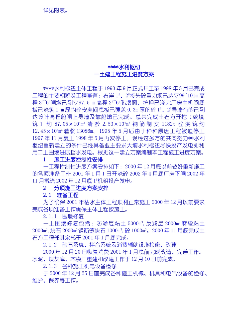 ****水利枢纽一土建工程施工进度计划**水电工程大埔水电站工程经理部二○○○年十月10进度方案编制说明一、土建工程施工方案的编制原那么1、根据****水利枢纽主体工程土建施工合同〔合同编:GX-DPHPS-0001〕和现有技术资料及目前工程相貌为根据编制。2、资金必须足额按时到位。3、电站各种装置性设备、金属构造、电器、架电线路、预埋件等施工必须不影响土建工程施工进度。4、各种施工图纸必须按时到位。5、方案是以2002年12月第一台机组发电2001年元月主体工程开工2000年10月~12月份进展主要临时工程施工为原那么进展编制。二、工程方案因目前施工图纸部份未到位在施工未准确落实的条件下根据现有资料和实际情况进展工程量及工程预〔估〕算编排。三、各阶段性施工方案及主要工程量详见附表。****水利枢纽一土建工程施工进度方案****水利枢纽主体工程于1993年9月正式开工至1998年5月已完成工程的主要相貌及工程量有:右岸1#、2#接头砼重力坝已达▽99~101m高程3#~6#闸墩已到▽97.5m高程2#~6#孔堰面、护坦已浇完厂房主机间底板已浇筑1m厚的砼安装间底板已覆盖0.3m厚的砼1#、2#导墙有的已到达设计高程船闸上导墙及靠船墩已完成。总共完成土石方开挖〔或填筑〕约87.05×104m3清淤2.53×104m3钢筋制安1182t砼浇筑约12.45×104m3灌浆13086m。1995年5月后由于种种原因工程被迫停工1997年11月复工1998年5月再次停工。现经过多方的共同努力**水利枢纽重新建立的条件已经具备业主要求大埔水利枢纽尽快投产发电即利用二上围堰进展挡水发电。根据这一建立方案编制本工程施工进度方案。1施工进度控制性安排一工程控制性进度方案安排如下:2000年12月底以前做好重新施工的各项准备工作2001年1月1日开浇砼2002年4月底厂房下闸2002年11月截流2002年12月底1#机组投产发电。2分项施工进度方案安排2.1准备工程为了确保2001年枯水主体工程顺利正常施工2000年12月以前要求完成各项准备工作确保主体工程按施工。2.1.1围堰修复一上围堰修复包括:防渗层粘土5000m3,反滤层2000m3麻袋粘土2000m3,块石2000m3钢筋笼块石1000m3,砼1000m3。2000年11月底完成土石方工程部其余部于2001年1月底完成。2.1.2砂石系统、拌合系统及消费辅助设施检修、改建2000年12月20日恢复消费2001年1月底前完成改造、完善工作。水泥、煤灰库、木模厂重建和改建工作于12月10日前完成。2.1.3各种施工机电设备检修于2000年12月25日前完成各种施工机械、机具和电气设备的检修、维护、保养等工作。施工道路修复下基坑公路修复于2000年11月30日前完成;左岸施工道路修复于2001年10月底前完成。风、水、电系统修复于2000年12月20日前恢复右岸风、水、电系统2001年7月底前恢复左岸风、水、电系统。基坑抽水一基坑初抽水于2000年11月25日前完成。门机安装a、上第一台门机安装:2000年12月10日前安装投产。b、下第二台门机安装:2000年12月25日前安装投产。c、右岸砼接头坝顶第三台门机安装:2001年2月前右岸接头砼重力坝已到顶2001年3月中旬安装坝顶施工门机为安装间砼浇筑创造有利条件。2.1.8流道模板制作与安装由于时间紧三套流道模板制作与安装要同时进展流道模板制作间为2001年1月15日~3月30日安装时间为2001年3月1日~4月15日。2.1.9截流材料准备总工程量约30000m3于2002年10月底前完成。2.2厂坝土石方工程2.2.1右岸基坑清淤工程量约为20000m3。施工时段为2000年12月30日以前。2.2.2右岸接头土坝施工清基开挖工程量12000m3接头坝回填24000m3土坝填筑45000m3安排在2001年1月~2001年2月28日进展。其余护面构造工程安排在4月完成。进、尾水渠开挖工程量约29000m3安排在2001年3月进展。2.3厂坝砼浇筑工程2.3.1右岸接头砼重力坝砼量约1900m3钢筋制安50t安排在2001年1月至2月底进展。2#~6#坝砼浇筑砼量约10000m3钢筋制安166t。其中2#~6#坝剩余部砼量约3000m3钢筋制安58t安排在2001年2月~3月浇筑。1#坝安排在2001年1月1日~4月浇筑。一溢流孔桥面梁系统安排在2001年5月~8月预制施工大梁现浇施工安排在2001年12月开场进展。导墙砼、排漂孔堰面浇筑砼量约5000m3钢筋制安25t安排在2001年1月10日~2月进展。安装间砼浇筑砼量约17650m3钢筋制安620t...