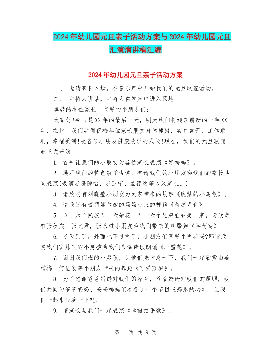2024年幼儿园元旦亲子活动方案与2024年幼儿园元旦汇演演讲稿汇编2024年幼儿园元旦亲子活动方案一、邀请家长入场,在音乐声中开始我们的元旦联谊活动。二、主持人讲话,主持人在掌声中进入场地尊敬的各位家长,亲爱的小朋友们:大家好!今日是XX年的最后一天,明天我们将迎来崭新的一年XX年,在此,我们共同祝福各位家长朋友身体健康,笑口常开,工作顺利,幸福美满!祝各位小朋友健康欢乐的成长!现在,我们的元旦联谊会正式开始。1.首先让我们的小朋友为各位家长表演《好妈妈》。2.展示我们的特色教学古诗,有请我们的小朋友和我们的家长共同表演(表演者房静怡、步亚宁、孟德绪等以及家长。)3.请欣赏有刘晓莹小朋友为大家带来的故事《聪慧的小乌龟》。4.请欣赏有董丽娜和她的妈妈带来的舞蹈《荷塘月色》。5.五十六个民族五十六朵花,五十六个兄弟姐妹是一家,请欣赏有张秋实,张文君,张永琪小朋友为我们带来的新疆舞《尝葡萄》。6.冬天到了,外面也下过雪了,小朋友们喜爱小雪花吗?那请欣赏我们班帅气的小男孩为我们表演诗歌朗诵《小雪花》。7.谢谢我们班的小男孩,让他们先休息一下,我们一起欣赏由姜雪梅、何佳璇等小朋友带来的舞蹈《可爱万岁》。8.为了感谢爸爸妈妈对我们的养育,爷爷奶奶对我们的照顾,我们共同为爷爷奶奶、爸爸妈妈们准备了一个节目《感恩的心》,让我们一起来表演一下吧。9.请家长与我们一起表演《幸福拍手歌》。第1页共9页10.游戏:找妈妈(游戏规则:请几位妈妈站在前面,一个小朋友蒙起眼睛用摸手,摸衣服等方法找出自己妈妈。)主持人:时间过的真快,不知不觉中,我们的联欢会就要结束了,让我们一起唱着《新年好》结束我们的联欢会吧,再次感谢我们家长的到来,以及对我们活动的参加,希望以后继续支持我们的工作,为我们提出宝贵的意见和建议。第2页共9页2024年幼儿园元旦汇演演讲稿亲爱的家长朋友们:你们好,非常感谢你们能在百忙之中抽出宝贵的时间来参加这次庆元旦迎新年亲子活动,感谢你们对幼儿园工作的支持。家长是孩子的第一任老师,家庭教育对于孩子的影响非常重要。家园携手对孩子进行同步教育,是促进孩子健康进展的必由之路。有句话说的好“家园如同一车两轮,只有同向运转,才能共同促进孩子的进展。”今日,我们欢聚一起,和孩子们一起唱、跳欢庆节日,迎接新年的到来。一、本学期孩子的优势表现。1、孩子们喜爱上幼儿园了,对各类活动的积极性都比较高。2、生活自理能力有了很大的提高,能独立进餐、盥洗、喝水,在自我服务和为他人服务上有了很大的进步,很多孩子能胜任值日生的工作。如:擦桌子、排椅子分碗筷、分发玩具等。3、同意与老师和同伴沟通,同同伴间的冲突明显减少了,并且能自己运用正确的方法解决问题,例如寻求老师的帮助而不是打或哭,会正确运用礼貌用语,如来园时和老师问好,朋友间冲突时会说对不起、没关系。4、通过各类游戏活动的开展,幼儿对各类体育活动都感兴趣,身体的灵活性、协调性得到了很大的进展。5、集体活动时遵守集体规则,注意力比较集中,积极动脑筋,踊跃发言,大胆表达自己的想法和意见。6、生活常规比较好,表现在午睡、吃饭、喝水、入厕等各个环节。有待提高的方面1、自我管理的意识和能力较差,东西丢三落四,积木、油画棒、图书随手乱扔,不能做到东西用完后放回原处,做事不善始善终,不注意收拾,留乱摊子,需老师多次提醒才能摆放整齐。2、个别孩子自控能力比较差,集体活动时注意力时间短。3、个别孩子的生活卫生习惯还不太好,做事不专注、拖拖拉拉、磨磨蹭蹭。4、有几个孩子很淘气如在户外活动时,会把小朋友的玩具扔了,在外边打打闹闹。5、分享意识还不够,不同意和同伴分享玩具只想自己一人玩。二、教育教学活动:我们的教学目标是努力贯彻《幼儿园教育纲要》精神通过各类教学活动,增强幼儿的体质,并结合幼儿的实际进展水平开展的,使幼儿养成良好的行为习惯,增强自我保护的意识,帮助幼儿树立自信心、自尊心,培育幼儿独立意识,并能积极参加各类活动,同时激发幼儿爱亲人、爱祖国、爱家乡的情感。我们共开设了语言、科学、社会、艺术、健康五大领域的课程,其中,科学学科又下设...