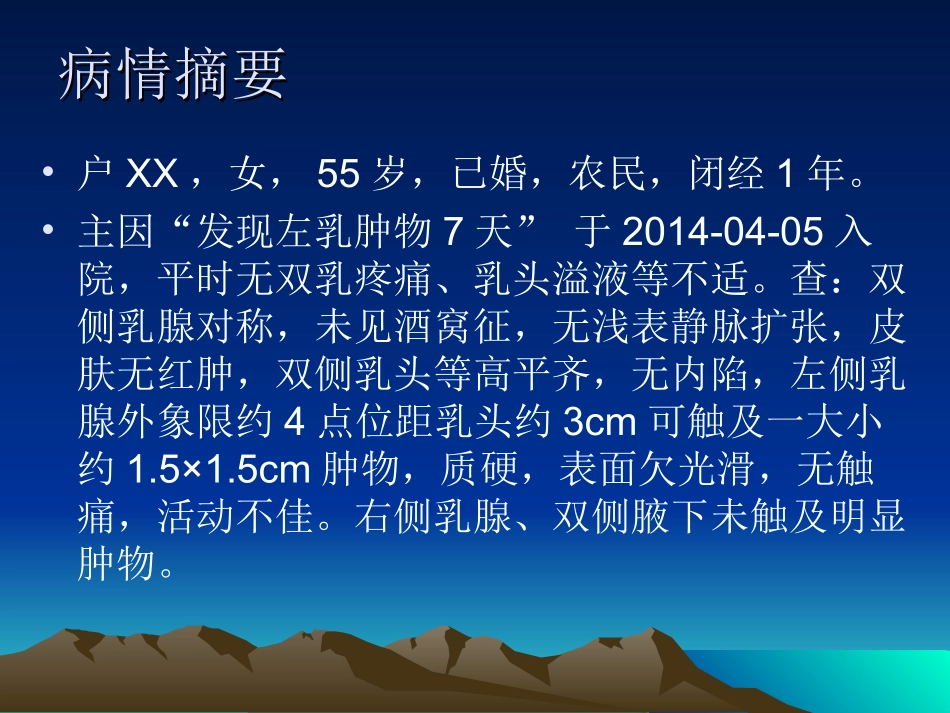 外科二病区外科二病区病情摘要病情摘要•户XX,女,55岁,已婚,农民,闭经1年。•主因“发现左乳肿物7天”于2014-04-05入院,平时无双乳疼痛、乳头溢液等不适。查:双侧乳腺对称,未见酒窝征,无浅表静脉扩张,皮肤无红肿,双侧乳头等高平齐,无内陷,左侧乳腺外象限约4点位距乳头约3cm可触及一大小约1.5×1.5cm肿物,质硬,表面欠光滑,无触痛,活动不佳。右侧乳腺、双侧腋下未触及明显肿物。•辅助检查:•彩超(遵化市人民医院2014-04-04):彩超双乳及双侧腋下:左乳腺组织最后1.2cm,右乳腺组织形态轮廓正常,边界尚清晰,腺体结构紊乱,左乳3-4点钟方向可见约1.4*1.4*0.9cm低回声,边界不整齐,形态不规则,呈蟹足状,内部回声不均,周边回声增强,CDFI:内部可见丰富彩色血流信号,靠基底部可见粗大血管进入,PW:侧及动脉频谱,RI:0.8。右乳内未见明确囊实性包块,乳管未见扩张。•超声提示:双侧乳腺增生,左乳实性占位性病变•左侧腋下多发低回声结节,最大结节形态不规则,右侧腋下目前未见明显低回声结节。•美国癌症联合委员会(AJCC)乳腺癌临床表现乳腺癌临床表现20112011年卫生部乳腺癌诊疗规范年卫生部乳腺癌诊疗规范•入院后检查•钼靶:双乳腺体基本由脂肪组织所代替,腺体成分<25%。左乳外侧偏上可见一结节影,大小约1.1x1.5cm,密度较高,边缘清晰有深分叶,似有毛刺影,未见明显钙化,周围血运增加。右乳未见明确结节、肿物、未见钙化,局部腺体未见明显结构不良。双乳皮肤无增厚、粘连,乳头无内陷,双腋下未见淋巴结影。•诊断意见:左乳外上方肿物,偏恶性,建议活检。右乳未见异常。BI-RADS分级,4级,可疑恶性。•彩超锁骨上淋巴结:左右侧锁骨上区扫查:分别可见约1.2*0.5cm及1.1*0.5cm低回声区,边界清,CDFI:未见明显血流信号。•超声提示:双侧锁骨上区低回声区。•头颅CT:右侧基底节区可疑斑点状略低密度影。•胸部CT:1、两肺透光度不均匀,请结合临床。2、左肺舌叶条索影。3、纵隔及左侧腋窝淋巴结增大。4、左侧乳腺病变,建议进一步检查。5、部分胸椎椎体改变,建议MRI检查。•腹部CT:1考虑脂肪肝。2胆囊结石。3考虑左肾小囊肿。4所示胸腰椎部分椎体内密度增高,请结合临床或进一步检查。5胰腺及脾脏CT平扫未见异常。•头颅MRI平扫+增强:1、左侧基底节区点状异常强化信号,请结合临床并复查。2、考虑双侧额叶小缺血灶。•胸椎MRI平扫:1、胸9-11椎体异常信号,不除外转移瘤,建议进一步检查。2、胸椎椎间盘退变。•SPECT(4月8日唐山市工人医院):•(全身骨显象)检查所见:右侧第6前肋、第9、10、11胸椎及右侧股骨上端等处可见多发的异常放射性分布浓聚灶,余诸骨未见明显异常。•诊断意见:全身骨显像可见多发骨代谢异常旺盛灶,结合临床,骨转移癌不除外。•4月10号•病理(左乳肿物穿刺):(左乳)肿物穿刺组织3条(左乳)浸润性腺癌•4月15号穿刺活检:免疫组化:ER阳性细胞数100%、PR阳性细胞数40%、CerbB-2(-)、CK34釫12(-)、P120膜(+)、p53(±)、Ck5/6(-)、SMA(-)。•8月19号•免疫组化结果:ki-67阳性细胞数约40%。诊断:诊断:•左乳癌(Ⅳ期)•多发骨转移瘤•双侧乳腺增生•非酒精性脂肪肝•胆囊结石•左肾囊肿•2型糖尿病•动脉硬化晚期转移性乳腺癌晚期转移性乳腺癌局部晚期乳腺癌局部晚期乳腺癌20112011年卫生部乳腺癌诊疗规范年卫生部乳腺癌诊疗规范治疗:治疗:•唑来膦酸:4mg入液静点每月1次•化疗:表阿霉素140mg(d1)+环磷酰胺针1000mg(d1)77月月55号:彩超腋下淋巴结(左):左侧腋下可见数个低回声结节,号:彩超腋下淋巴结(左):左侧腋下可见数个低回声结节,最大约最大约1.9x0.9cm1.9x0.9cm,边界清,形态不规则,,边界清,形态不规则,CDFICDFI:内部可见稍丰:内部可见稍丰富血流信号。超声提示:左侧腋下多发低回声结节,最大结节形态富血流信号。超声提示:左侧腋下多发低回声结节,最大结节形态不规则(转移淋巴结可能)不规则(转移淋巴结可能)彩超锁骨上淋巴结:左右侧锁骨上区扫查:左侧锁骨上区可见约彩超锁骨上淋巴结:左右侧锁骨上区扫查:左侧锁骨上区可见约0.5x0.5cm0.5x0.5cm低回声结节,边界清,...