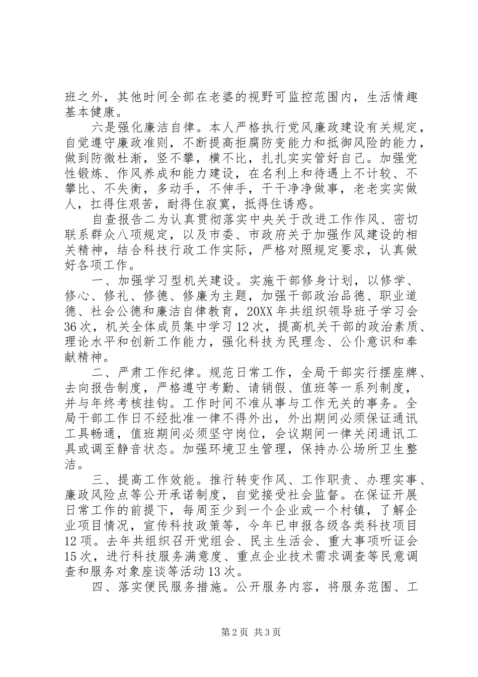 针对八项规定进行个人自查两篇自查报告一今年以来,本人认真贯彻落实中央改进工作作风、密切联系群众的八项规定和六项禁令精神,时刻以八项规定和六项禁令规范自己的言行,做到工作勤恳,生活俭朴,作风严谨,现将本人一年来落实八项规定自查情况报告如下:一是强化宗旨观念。自我认为能够坚信共产党的领导,听党指挥,服从领导,顾全大局。牢固树立群众观点,倾听群众呼声,反映群众意愿,集中群众智慧,忠实地贯彻执行党的群众路线,做到立党为公、执政为民。能够积极接待群众来信来访,态度热情。经常利用业余时间加强理论学习,树立正确的世界观、人生观。二是精神状态良好。一年来,无论工作任务多么艰巨、压力多么沉重,本人始终保持良好的精神状态,凡事总是想好的、看好的、听好的、说好的,坚定正确的政治方向,用积极、乐观向上的观念面对一切,从不患得患失、斤斤计较。任何时候都能够坚信真理、坚持原则、坚定理想信念、坚守道德和法律底线。三是严守工作纪律。遵守机关管理规章制度,坚持做到按时上下班,从不迟到和早退,上班自觉佩戴胸牌,外出办事摆好去向牌。在上班期间从不做与工作无关的事情。严格请销假制度,一切按制度办事,严格依法办事。遵守政治纪律、组织纪律和工作纪律,并起到模范带头作用。四是厉行勤俭节约。能够从自身做起,从点滴做起,把厉行勤俭节约、反对铺张浪费贯彻在实际工作和日常生活中,落实到具体行动上。发扬艰苦奋斗的优良传统,提倡节约、反对浪费,自觉树立节约光荣、浪费可耻的价值观,从不利用公款东拉西扯、胡吃海喝,铺张浪费、纸醉金迷。五是生活作风优良。生活方式是一个人思想觉悟、道德水准、知识水平、性格品质的综合体现。本人不仅注意自身在8小时以内的工作作风和言行,而且注意自己在8小时以外的生活细节。在生活方面,本人始终严以律己,从不参与赌博,从不做违法乱纪的事,业余爱好散步、爬山、跑步,除上班、加第1页共3页班之外,其他时间全部在老婆的视野可监控范围内,生活情趣基本健康。六是强化廉洁自律。本人严格执行党风廉政建设有关规定,自觉遵守廉政准则,不断提高拒腐防变能力和抵御风险的能力,做到防微杜渐,竖不攀,横不比,扎扎实实管好自己。加强党性锻炼、作风养成和能力建设,在名利上和待遇上不计较、不攀比、不失衡,多动手,不伸手,干干净净做事,老老实实做人,扛得住艰苦,耐得住寂寞,抵得住诱惑。自查报告二为认真贯彻落实中央关于改进工作作风、密切联系群众八项规定,以及市委、市政府关于加强作风建设的相关精神,结合科技行政工作实际,严格对照规定要求,认真做好各项工作。一、加强学习型机关建设。实施干部修身计划,以修学、修心、修礼、修德、修廉为主题,加强干部政治品德、职业道德、社会公德和廉洁自律教育,20XX年共组织领导班子学习会36次,机关全体成员集中学习12次,提高机关干部的政治素质、理论水平和创新工作能力,强化科技为民理念、公仆意识和奉献精神。二、严肃工作纪律。规范日常工作,全局干部实行摆座牌、去向报告制度,严格遵守考勤、请销假、值班等一系列制度,并与年终考核挂钩。工作时间不准从事与工作无关的事务。全局干部工作日不经批准一律不得外出,外出期间必须保证通讯工具畅通,值班期间必须坚守岗位,会议期间一律关闭通讯工具或调至静音状态。加强环境卫生管理,保持办公场所卫生整洁。三、提高工作效能。推行转变作风、工作职责、办理实事、廉政风险点等公开承诺制度,自觉接受社会监督。在保证开展日常工作的前提下,每周至少到一个企业或一个村镇,了解企业项目情况,宣传科技政策等,今年已申报各级各类科技项目12项。去年共组织召开党组会、民主生活会、重大事项听证会15次,进行科技服务满意度、重点企业技术需求调查等民意调查和服务对象座谈等活动13次。四、落实便民服务措施。公开服务内容,将服务范围、工第2页共3页作流程办理时限、责任人、监督电话等信息,在政府网站和单位公示栏中公示。实行首问负责制,全局工作人员遇到群众申请办理相关业务即为首问责任人,需向群众解答有关的办理规定,并协助做好接洽业务承办人、工作程序一次性...