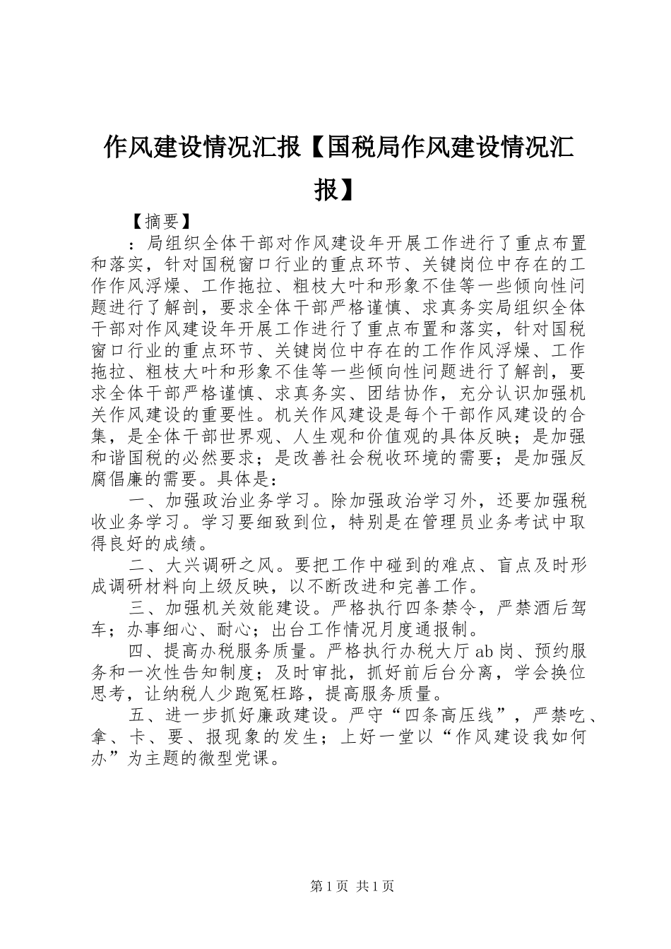 作风建设情况汇报【国税局作风建设情况汇报】【摘要】:局组织全体干部对作风建设年开展工作进行了重点布置和落实,针对国税窗口行业的重点环节、关键岗位中存在的工作作风浮燥、工作拖拉、粗枝大叶和形象不佳等一些倾向性问题进行了解剖,要求全体干部严格谨慎、求真务实局组织全体干部对作风建设年开展工作进行了重点布置和落实,针对国税窗口行业的重点环节、关键岗位中存在的工作作风浮燥、工作拖拉、粗枝大叶和形象不佳等一些倾向性问题进行了解剖,要求全体干部严格谨慎、求真务实、团结协作,充分认识加强机关作风建设的重要性。机关作风建设是每个干部作风建设的合集,是全体干部世界观、人生观和价值观的具体反映;是加强和谐国税的必然要求;是改善社会税收环境的需要;是加强反腐倡廉的需要。具体是:一、加强政治业务学习。除加强政治学习外,还要加强税收业务学习。学习要细致到位,特别是在管理员业务考试中取得良好的成绩。二、大兴调研之风。要把工作中碰到的难点、盲点及时形成调研材料向上级反映,以不断改进和完善工作。三、加强机关效能建设。严格执行四条禁令,严禁酒后驾车;办事细心、耐心;出台工作情况月度通报制。四、提高办税服务质量。严格执行办税大厅ab岗、预约服务和一次性告知制度;及时审批,抓好前后台分离,学会换位思考,让纳税人少跑冤枉路,提高服务质量。五、进一步抓好廉政建设。严守“四条高压线”,严禁吃、拿、卡、要、报现象的发生;上好一堂以“作风建设我如何办”为主题的微型党课。第1页共1页