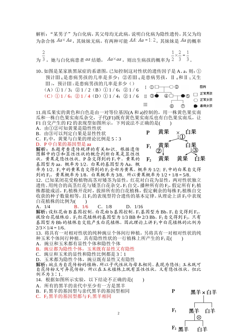 基因分离定律经典例题1.下面对有关概念之间关系的叙述,不正确的是()A.基因型决定了表现型B.等位基因控制相对性状C.杂合子自交后代没有纯合子D.性状分离是由于基因分离解析:基因型对表现型起决定作用,基因型相同,表现型一般相同,环境条件也影响表现型,A项正确;等位基因是指位于同源染色体的同一位置,控制着相对性状的基因,B项正确;杂合子自交,后代中有纯合子出现,C项错误。2.下列有关孟德尔豌豆杂交实验的叙述正确的是()A.孟德尔在豌豆开花时进行去雄和授粉,实现亲本的杂交B.孟德尔研究豌豆花的构造,但无需考虑雌蕊、雄蕊的发育程度C.孟德尔根据亲本中不同个体表现型来判断亲本是否纯合D.孟德尔利用了豌豆自花传粉、闭花受粉的特性解析:豌豆是严格的自花传粉、闭花受粉植物,应在未开花前去雄和授粉,实现杂交;花的主要结构是雄蕊和雌蕊,雄蕊和雌蕊发育不良,会影响受粉;孟德尔依据子代不同个体的表现型来判断亲本是否纯合。3、高茎豌豆(Dd)能产生含有哪种遗传因子的配子()(A)只有含D的配子B)有含D的配子,也有含d的配子(C)只有含d的配子D)只有含D的配子,或只有含d的配子4、下列杂交组合(遗传因子E控制显性性状,e控制隐性性状)产生的后代,哪一组符合性状分离的概念()(A)EE×ee(B)EE×Ee(C)EE×EE(D)Ee×Ee5.鸡的毛腿(B)对光腿(b)为显性。现让毛腿雌鸡甲、乙分别与光腿雄鸡丙交配,甲的后代有毛腿,也有光腿,比为1:1,乙的后代全部是毛腿,则甲、乙、丙的基因型依次是()A.BB、Bb、bbB.bb、Bb、BBC.Bb、BB、bbD.Bb、bb、BB6.高粱有红茎和绿茎,如果一株高粱穗上的1000粒种子萌发后长出760株红茎和240绿茎,则此高粱的两个亲本的基因型是()A.Rr×RrB.Rr×rrC.Rr×RRD.RR×rr7.先天性聋哑是一种隐性遗传病,双亲均无此病,但第一个孩子患聋哑,以后所生子女中患病的可能性是()A.100%B.75%C.50%D.25%解析:双亲正常,生有患病的孩子,说明患病为隐性性状,双亲为杂合子。8.多指症(有六个手指)为一种显性基因控制的遗传病,某男性为多指患者,他的夫人正常,但他们的三个子女均是多指症患者,这样的双亲其子女中多指症的发病率是()A.25%或50%B.100%或50%C.50%或50%D.0或100%解析:多指为显性,所以患者必有显性基因,正常人为隐性纯合体,因此其夫人为aa,“某男性”则为AA或Aa。AA×aa子女100%多指;Aa×aa子女多指为50%,9.某男子患白化病,他父母和妹妹均无此病,如果他妹妹与白化病患者结婚,出生病孩的概率是()A.1/2B.2/3C.1/3D.1/41解析:“某男子”为白化病,其父母均无此病,说明白化病为隐性遗传,其父为均为杂合体,其妹妹无病,有两种可能,其妹妹是的概率为,她与白化病患者结婚,,则出生病孩的概率为。10、如图是某家族黑尿症的系谱图,已知控制这对性状的遗传因子是A、a,则:①预计Ⅲ6是患病男孩的几率是多少;②若Ⅲ6是患病男孩,Ⅱ4和Ⅱ5又生Ⅲ7,预计Ⅲ7是患病男孩的几率是多少()(A)①1/3;②1/2(B)①1/6;②1/6(C)①1/6;②1/4(D)①1/4;②1/611.南瓜果实的黄色和白色是由一对等位基因(A和a)控制的,用一株黄色果实南瓜和一株白色果实南瓜杂交,子代(F1)既有黄色果实南瓜也有白色果实南瓜,让F1自交产生的F2的表现型如图所示,下列说法不正确的是()A.由①②可知黄果是隐性性状B.由③可以判定白果是显性性状C.F2中,黄果与白果的理论比例是5∶3D.P中白果的基因型是aa解析:本题考查遗传规律的有关知识。根据遗传图解中的③和显性性状的概念判断白果是显性性状,黄果是隐性性状。P杂交得到的F1中,黄果的基因型为aa,概率为1/2,白果的基因型为Aa,概率为1/2。F1中的黄果自交得到的F2全部为黄果,概率为1/2;F1中的白果自交得到的F2,黄果概率为1/8,白果概率为3/8。所以黄果概率为1/2+1/8=5/8。12.已知某闭花受粉植物高茎对矮茎为显性,红花对白花为显性,两对性状独立遗传。用纯合的高茎红花与矮茎白花杂交,F1自交,播种所有的F2,假定所有F2植株都能成活,F2植株开花时,拔掉所有的白花植株,假定剩余的每株F2植株自交收获的种子数量相...