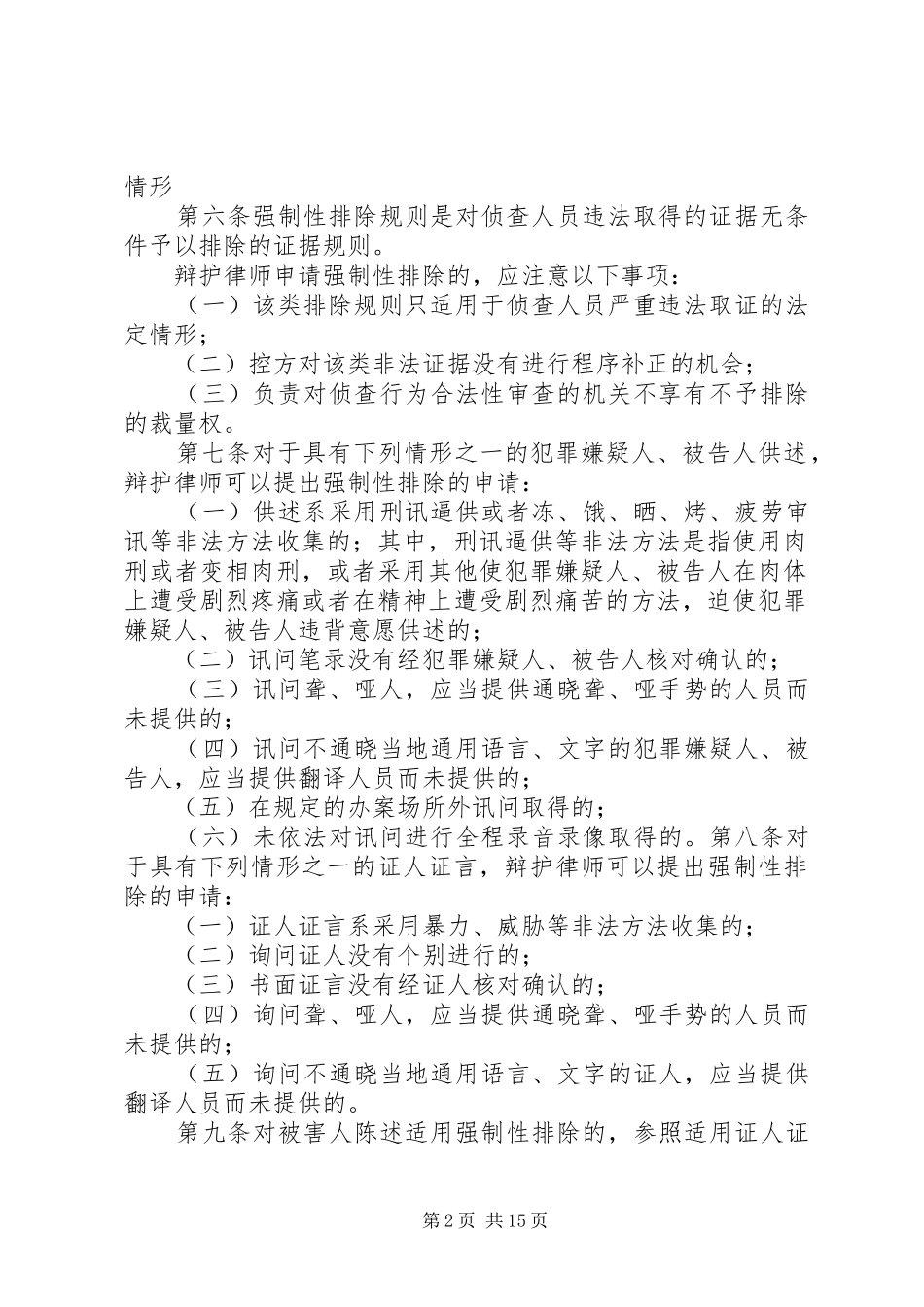 刑事案件证据审查的重要性[五篇材料]辩护律师办理刑事案件非法证据排除指引XX省律师协会第一章一般规定第一条为指导律师进行非法证据排除的辩护实务,根据《中华人民共和国宪法》、《中华人民共和国刑事诉讼法》、《中华人民共和国律师法》、《最高人民法院关于适用的解释》、《人民检察院刑事诉讼规则(试行)》、《关于办理刑事案件排除非法证据若干问题的规定》、《关于办理死刑案件审查判断证据若干问题的规定》、最高人民法院《关于建立健全防范刑事冤假错案工作机制的意见》、《公安机关办理刑事案件程序规定》等相关法律法规、规范性文件,结合非法证据排除辩护的工作实际,XX省律师协会经充分调研和论证,制定本指引。第二条本指引所称的“非法证据”是侦查人员违反法定程序所获取的证据。本指引所称的“非法证据排除规则”是对侦查人员以非法取证行为所获证据予以排除的证据规则。在申请非法证据排除时,辩护律师应针对不同的非法证据适用强制性排除规则与裁量性排除规则,根据法律规定的可补正的瑕疵证据,可以适用可补正排除规则。第三条辩护律师申请排除非法证据,应当尊重事实,遵守法律,遵守律师职业道德和执业纪律。第四条辩护律师申请非法证据排除的,应当向犯罪嫌疑人、被告人告知可能的后果和风险。未经犯罪嫌疑人、被告人的同意,辩护律师一般不得提出排除非法证据的申请。委托人是犯罪嫌疑人、被告人以外的人的,辩护律师可以征询委托人的意见。第五条对于存在较大争议的排除非法证据的刑事案件,律师事务所或律师协会可以组织具有刑事辩护经验的律师集体讨论。必要时,辩护律师可以向有关专家进行咨询。第二章申请非法证据排除的情形第一节申请强制性排除的第1页共15页情形第六条强制性排除规则是对侦查人员违法取得的证据无条件予以排除的证据规则。辩护律师申请强制性排除的,应注意以下事项:(一)该类排除规则只适用于侦查人员严重违法取证的法定情形;(二)控方对该类非法证据没有进行程序补正的机会;(三)负责对侦查行为合法性审查的机关不享有不予排除的裁量权。第七条对于具有下列情形之一的犯罪嫌疑人、被告人供述,辩护律师可以提出强制性排除的申请:(一)供述系采用刑讯逼供或者冻、饿、晒、烤、疲劳审讯等非法方法收集的;其中,刑讯逼供等非法方法是指使用肉刑或者变相肉刑,或者采用其他使犯罪嫌疑人、被告人在肉体上遭受剧烈疼痛或者在精神上遭受剧烈痛苦的方法,迫使犯罪嫌疑人、被告人违背意愿供述的;(二)讯问笔录没有经犯罪嫌疑人、被告人核对确认的;(三)讯问聋、哑人,应当提供通晓聋、哑手势的人员而未提供的;(四)讯问不通晓当地通用语言、文字的犯罪嫌疑人、被告人,应当提供翻译人员而未提供的;(五)在规定的办案场所外讯问取得的;(六)未依法对讯问进行全程录音录像取得的。第八条对于具有下列情形之一的证人证言,辩护律师可以提出强制性排除的申请:(一)证人证言系采用暴力、威胁等非法方法收集的;(二)询问证人没有个别进行的;(三)书面证言没有经证人核对确认的;(四)询问聋、哑人,应当提供通晓聋、哑手势的人员而未提供的;(五)询问不通晓当地通用语言、文字的证人,应当提供翻译人员而未提供的。第九条对被害人陈述适用强制性排除的,参照适用证人证第2页共15页言的有关规定。第十条对于具有下列情形之一的物证、书证,辩护律师可以提出强制性排除的申请:(一)在勘验、检查、搜查过程中提取、扣押的物证、书证,未附笔录或者清单,不能证明物证、书证来源的;(二)现场遗留的可能与犯罪有关的指纹、血迹、精斑、毛发等证据,未通过指纹鉴定、dna鉴定等方式与犯罪嫌疑人、被告人、被害人的相应样本作同一认定的;(三)涉案物品、作案工具等未通过辨认、鉴定等方式确定来源的。第十一条对于具有下列情形之一的视听资料、电子数据,辩护律师可以提出强制性排除的申请:(一)未附有提取过程的说明,来源不合法的;(二)未随原始存储介质移送的;(三)提取、复制电子数据仅由一人进行,不足以保证电子数据完整性的;(四)对提取、复制过程及原始存储介质存放地点没有文字说明或签名的。第十...