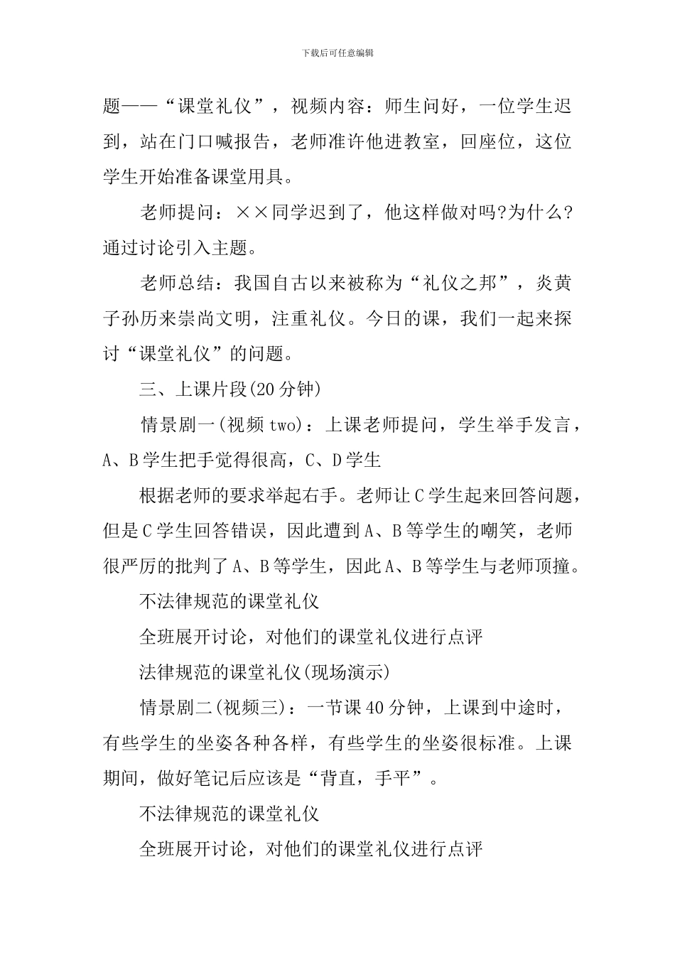 下载后可任意编辑小学课堂礼仪教案三篇篇一教学目标:通过本节课的学习使学生了解课堂礼仪,熟知课堂礼仪,改正自己在课堂上的不良习惯,争做一名课堂礼仪小先锋。教学重难点:熟知课堂礼仪,掌握课堂礼仪,坚持课堂礼仪。教学方法:视频演示法、观察发现法、小组讨论法、老师讲授法教学安排:一课时导入新课:(2分钟)一、导入语:播下榜样的种子,收获行为;播下行为的种子,收获习惯;播下习惯的种子,收获性格;播下性格的种子,收获命运。作为学生,每天都在上课,课堂礼仪就是学生在上课期间应遵守的行为法律规范和准则,法律规范的课堂礼仪才能让我们的学习事半功倍。那如何来法律规范我们的课堂礼仪呢?孔子曰:不学礼,无以立。这句话意思就是说不学会礼仪礼貌,就难以有立身之处。作为学生的我们,需要法律规范课堂礼仪才能取得好成绩,希望今日我们这一堂“课堂礼仪”主题班会能给大家一个有益的启示。二、热身运动(7分钟)播放视频(一):引入本次班会主下载后可任意编辑题——“课堂礼仪”,视频内容:师生问好,一位学生迟到,站在门口喊报告,老师准许他进教室,回座位,这位学生开始准备课堂用具。老师提问:××同学迟到了,他这样做对吗?为什么?通过讨论引入主题。老师总结:我国自古以来被称为“礼仪之邦”,炎黄子孙历来崇尚文明,注重礼仪。今日的课,我们一起来探讨“课堂礼仪”的问题。三、上课片段(20分钟)情景剧一(视频two):上课老师提问,学生举手发言,A、B学生把手觉得很高,C、D学生根据老师的要求举起右手。老师让C学生起来回答问题,但是C学生回答错误,因此遭到A、B等学生的嘲笑,老师很严厉的批判了A、B等学生,因此A、B等学生与老师顶撞。不法律规范的课堂礼仪全班展开讨论,对他们的课堂礼仪进行点评法律规范的课堂礼仪(现场演示)情景剧二(视频三):一节课40分钟,上课到中途时,有些学生的坐姿各种各样,有些学生的坐姿很标准。上课期间,做好笔记后应该是“背直,手平”。不法律规范的课堂礼仪全班展开讨论,对他们的课堂礼仪进行点评下载后可任意编辑法律规范的课堂礼仪(现场演示)四、同桌互动共同进步(5分钟)通过今日的学习,我们明白了课堂礼仪的具体要求,那么我们班上谁可以做课堂礼仪小先锋呢?请你为你的同桌指出他的课堂礼仪的不足之处,并讨论、改正。五、演演议议归纳要点,全体学生演示。(5分钟)六、课堂小结:(1分钟)勿以恶小而为之,勿以善小而不为。让我们从自身礼仪着手,从自身的课堂礼仪着手,法律规范自己的课堂礼仪,信任经过大家的共同努力,我们个个能当“礼仪小先锋”,那时我们的集体就是文明班集体了。我们要用行动说明一切,让优秀成为一种习惯!篇二教学目的:1、明白课前作准备,课堂效率高。知道上课迟到喊“报告”,得到老师允许进教室。在课堂上学会倾听与沟通,学会尊重别人。2、通过创设情景导入课题,学生演一演、议一议、辩一辩、写一写等环节,理解、巩固课堂礼仪的要求。教学重点、难点:知道上课迟到喊“报告”,得到老师允许进教室。在课堂上学会倾听与沟通,学会尊重别人。教学准备:多媒体课件下载后可任意编辑教学时间:1课时教学过程:活动一、创设情境揭示课题1、情境创设:师生问好,一位学生迟到,站在门口喊报告,老师准许他进教室,回座位,这位学生开始准备课堂用具。2、老师提问:××同学迟到了,他这样做对吗?为什么?3、揭题:我国自古以来被称为“礼仪之邦”,炎黄子孙历来崇尚文明,注重礼仪。今日的课,我们一起来探讨“课堂礼仪”的问题。活动二、故事导入明白道理1、师讲述故事坊内容:课堂上,师生问好:“同学们好。”“老师好!”明明上课迟到了,在教室门口喊道:“报告老师……我迟到了。”课堂上明明双手从老师手中接过试卷。课上明明踊跃举手发言,师生鼓掌表扬。下课了,明明和同学让老师先出教室。明明今日也迟到了,明明在课堂上的表现你满意吗?为什么?2、同学讨论沟通。3、老师小结:在课堂上,除了要遵守课堂纪律外,我们还应注重课前、课中、课后必要的礼仪,显示我们应有的文明素养。下载后可任意编辑活动三、演演议议归纳要点1、上课时,我们还应该做到哪些要求?2、小组...