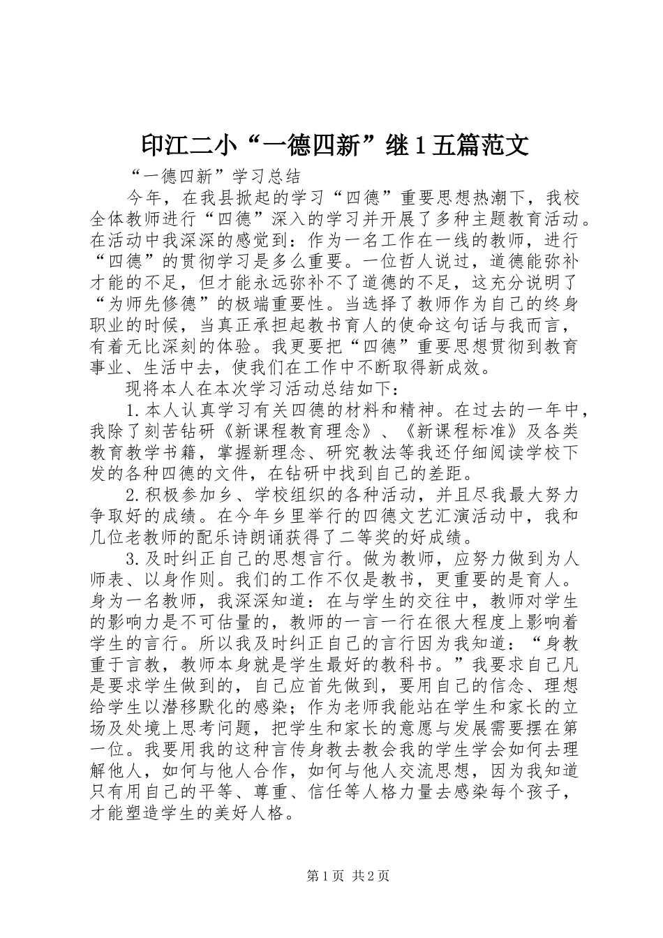 印江二小“一德四新”继1五篇范文“一德四新”学习总结今年,在我县掀起的学习“四德”重要思想热潮下,我校全体教师进行“四德”深入的学习并开展了多种主题教育活动。在活动中我深深的感觉到:作为一名工作在一线的教师,进行“四德”的贯彻学习是多么重要。一位哲人说过,道德能弥补才能的不足,但才能永远弥补不了道德的不足,这充分说明了“为师先修德”的极端重要性。当选择了教师作为自己的终身职业的时候,当真正承担起教书育人的使命这句话与我而言,有着无比深刻的体验。我更要把“四德”重要思想贯彻到教育事业、生活中去,使我们在工作中不断取得新成效。现将本人在本次学习活动总结如下:1.本人认真学习有关四德的材料和精神。在过去的一年中,我除了刻苦钻研《新课程教育理念》、《新课程标准》及各类教育教学书籍,掌握新理念、研究教法等我还仔细阅读学校下发的各种四德的文件,在钻研中找到自己的差距。2.积极参加乡、学校组织的各种活动,并且尽我最大努力争取好的成绩。在今年乡里举行的四德文艺汇演活动中,我和几位老教师的配乐诗朗诵获得了二等奖的好成绩。3.及时纠正自己的思想言行。做为教师,应努力做到为人师表、以身作则。我们的工作不仅是教书,更重要的是育人。身为一名教师,我深深知道:在与学生的交往中,教师对学生的影响力是不可估量的,教师的一言一行在很大程度上影响着学生的言行。所以我及时纠正自己的言行因为我知道:“身教重于言教,教师本身就是学生最好的教科书。”我要求自己凡是要求学生做到的,自己应首先做到,要用自己的信念、理想给学生以潜移默化的感染;作为老师我能站在学生和家长的立场及处境上思考问题,把学生和家长的意愿与发展需要摆在第一位。我要用我的这种言传身教去教会我的学生学会如何去理解他人,如何与他人合作,如何与他人交流思想,因为我知道只有用自己的平等、尊重、信任等人格力量去感染每个孩子,才能塑造学生的美好人格。第1页共2页4.给学生慈母般的爱心,做一名尽心尽责的护花使者。“四德”其中一德就是家庭美德。在这一年的学习和活动中我知道教师光自己对自己的家人有美德是远远不够的,我还要有慈母般的爱心,爱每一个孩子、爱我们身边的每个人。我时刻记着:“师爱不等于母爱,严格不等于厉害”这句话。我在严格要求又热情爱护中,严字当头,爱在细微处。充满爱的严与表现为严的爱相结合,我赢得学生的尊敬和理解,也赢得家长的信任与支持。对待学生,无论他是出生于干部权贵之家或平民百姓人家,无论他是品学兼优的好学生或是令人头疼的学困生,均应一视同仁,爱得公正,爱得让学生信服。通过学习“四德”,我的心灵受到了一次彻底的洗礼。我深知只有具有“四德”的教师,才能阳光地生活、工作,才能平等地对待每一位学生,无条件地爱每一个学生。我知道做的还远远不够,但请领导放心,我会继续努力,争取早日成为四德活动中的骨干分子,献出一份微薄的力量第2页共2页