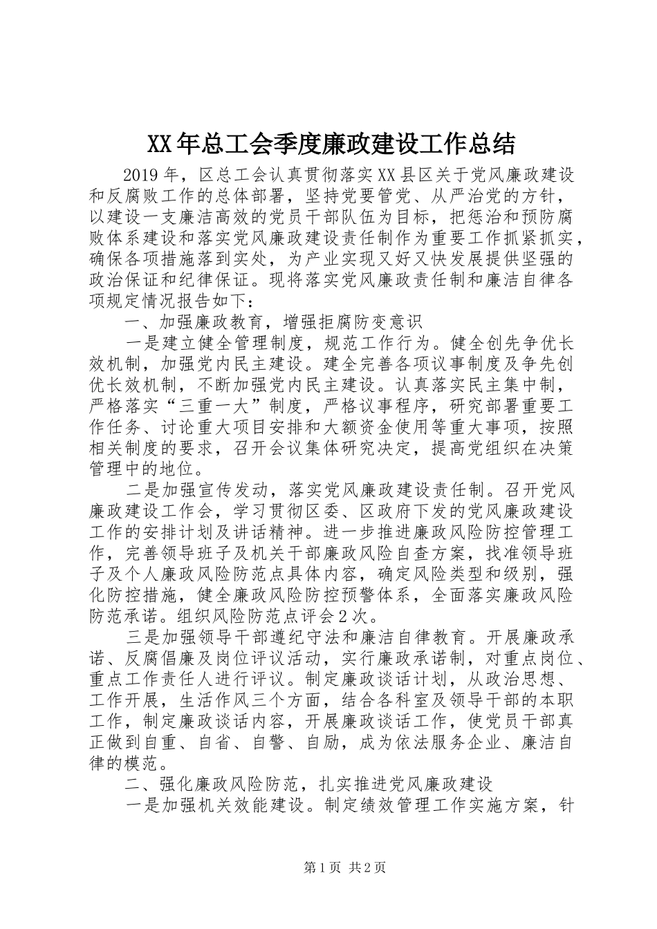 XX年总工会季度廉政建设工作总结2019年,区总工会认真贯彻落实XX县区关于党风廉政建设和反腐败工作的总体部署,坚持党要管党、从严治党的方针,以建设一支廉洁高效的党员干部队伍为目标,把惩治和预防腐败体系建设和落实党风廉政建设责任制作为重要工作抓紧抓实,确保各项措施落到实处,为产业实现又好又快发展提供坚强的政治保证和纪律保证。现将落实党风廉政责任制和廉洁自律各项规定情况报告如下:一、加强廉政教育,增强拒腐防变意识一是建立健全管理制度,规范工作行为。健全创先争优长效机制,加强党内民主建设。建全完善各项议事制度及争先创优长效机制,不断加强党内民主建设。认真落实民主集中制,严格落实“三重一大”制度,严格议事程序,研究部署重要工作任务、讨论重大项目安排和大额资金使用等重大事项,按照相关制度的要求,召开会议集体研究决定,提高党组织在决策管理中的地位。二是加强宣传发动,落实党风廉政建设责任制。召开党风廉政建设工作会,学习贯彻区委、区政府下发的党风廉政建设工作的安排计划及讲话精神。进一步推进廉政风险防控管理工作,完善领导班子及机关干部廉政风险自查方案,找准领导班子及个人廉政风险防范点具体内容,确定风险类型和级别,强化防控措施,健全廉政风险防控预警体系,全面落实廉政风险防范承诺。组织风险防范点评会2次。三是加强领导干部遵纪守法和廉洁自律教育。开展廉政承诺、反腐倡廉及岗位评议活动,实行廉政承诺制,对重点岗位、重点工作责任人进行评议。制定廉政谈话计划,从政治思想、工作开展,生活作风三个方面,结合各科室及领导干部的本职工作,制定廉政谈话内容,开展廉政谈话工作,使党员干部真正做到自重、自省、自警、自励,成为依法服务企业、廉洁自律的模范。二、强化廉政风险防范,扎实推进党风廉政建设一是加强机关效能建设。制定绩效管理工作实施方案,针第1页共2页对科室及领导干部制定机关干部效能检测表,分机关效能、业务及综合三部分设置岗位职责及考核标准,对科室和机关干部实行周动态、月计划、季考核制度。二是抓好廉政文化建设,创造良好环境。订阅报刊杂志丰富机关文化活动氛围。区总工会在党风廉政建设方面做了一些工作,但工作中还存在着诸多问题和差距如党风廉政建设仍存在薄弱环节、干部管理水平上还有待进一步提高,部分干部的责任心、事业心还有待加强等。在以后的工作中,我们一定要发扬成绩,克服缺点,扎实推进党风廉政建设和惩防体系建设。第2页共2页