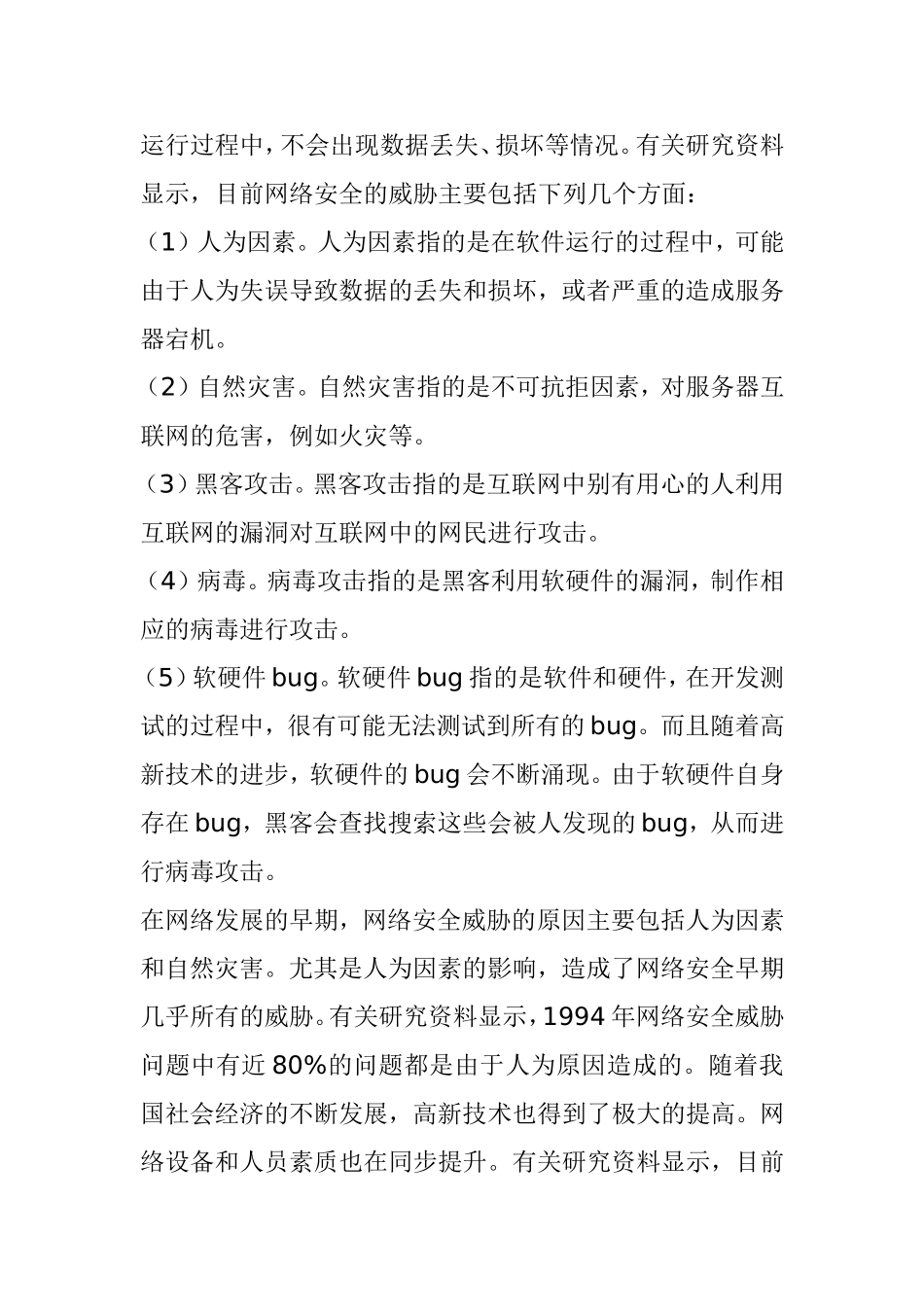 网络型病毒与计算机网络安全摘要:文章通过文献查找发现,目前计算机病毒可以按照攻击对象的不同分为下列几类。其中包括文件型病毒、混合型病毒、网络型病毒等。随着我国社会经济的发展,高新技术得到了极大的提高,病毒也随着高新技术发展不断的进行裂化。文章选择网络型病毒作为研究的对象。网络型病毒主要是利用互联网的缺陷,从而破坏网络中的资源。因此网络病毒具有下列传播的优势。网络病毒的寄生对象由于处于互联网之中,因此对象的数量巨大。网络型病毒,在互联网中传播的速度较快。由于网络型病毒,危害的对象数量巨大,且内容互联网具有较快的传播速度,因此对互联网而言,网络型病毒具有较大的危害。文章选择网络型病毒做研究对象,通过实例分析对网络型病毒为互联网带来的问题,提出有针对性的解决方案,并为预防网络型病毒提出了相关建议。在预防网络型病毒时,客户端可以通过设置防火墙、定时进行软件更新,防止网络型病毒攻击软件漏洞、及时备份客户端中的数据,防止网络型病毒攻击时造成的数据损失等方式来进行预防。关键词:计算机病毒;计算机病毒分类;网络型病毒;计算机网络安全;病毒防治众所周知,2003年1月25日国际互联网在全球各个范围都遭受到了黑客的攻击。25日当天网络服务器遭受到大量黑客攻击,从而出现了宕机现象。许多服务器服务商在25日当天由于网络病毒的攻击,致使其损失惨重。有关研究资料显示,25日当天全球至少由2.2万个系统同时遭受到黑客的网络型病毒攻击,其造成了互联网巨大的经济损失。25日当天攻击的病毒的攻击方式已经被相关专家查明公布。该病毒主要是利用了微软sqlserver2002版本的漏洞。sqlserver2002在运行过程中会出现1434端口缓冲区溢出的问题。黑客抓住了这个漏洞,专门针对1434端口制作了蠕虫病毒进行攻击。该病毒也被人称为蠕虫王。25日当天,互联网加速的巨大攻击,也时刻的提醒人们,互联网目前依然存在很多问题,且运行不稳定。别有用心的黑客会抓住互联网中的任何漏洞发起病毒攻击。1.影响网络安全的几个因素:在互联网中网络安全指的是网络中运行的硬件、软件,不会由于恶意、偶然的攻击导致硬件、软件数据的丢失和破坏。在网络安全的维护下,硬件和软件可以在互联网中正常运行。网络安全的主要内容包括了两方面:信息安全和系统安全。其中信息安全指的是硬件或软件在互联网中,信息存储、信息传输的保密性和完整性。其中系统安全指的是在操作系统运行过程中,不会出现数据丢失、损坏等情况。有关研究资料显示,目前网络安全的威胁主要包括下列几个方面:(1)人为因素。人为因素指的是在软件运行的过程中,可能由于人为失误导致数据的丢失和损坏,或者严重的造成服务器宕机。(2)自然灾害。自然灾害指的是不可抗拒因素,对服务器互联网的危害,例如火灾等。(3)黑客攻击。黑客攻击指的是互联网中别有用心的人利用互联网的漏洞对互联网中的网民进行攻击。(4)病毒。病毒攻击指的是黑客利用软硬件的漏洞,制作相应的病毒进行攻击。(5)软硬件bug。软硬件bug指的是软件和硬件,在开发测试的过程中,很有可能无法测试到所有的bug。而且随着高新技术的进步,软硬件的bug会不断涌现。由于软硬件自身存在bug,黑客会查找搜索这些会被人发现的bug,从而进行病毒攻击。在网络发展的早期,网络安全威胁的原因主要包括人为因素和自然灾害。尤其是人为因素的影响,造成了网络安全早期几乎所有的威胁。有关研究资料显示,1994年网络安全威胁问题中有近80%的问题都是由于人为原因造成的。随着我国社会经济的不断发展,高新技术也得到了极大的提高。网络设备和人员素质也在同步提升。有关研究资料显示,目前由人为因素和自然环境导致的网络安全问题数量较少。随着高新技术发展,网络安全问题导致的原因主要包括黑客攻击、病毒以及软硬件bug。有关研究资料显示,目前由黑客、病毒、软硬件原因导致的bug占网络安全问题总数的80%以上。由此可知,目前人类想要改善网络安全威胁,则必须从黑客攻击、病毒和软硬件bug方面着手。2.网络型病毒的特点就病毒而言,病毒是由人利用编程语言编写的,对计算机或互联网有较大危害的代码或应用程...