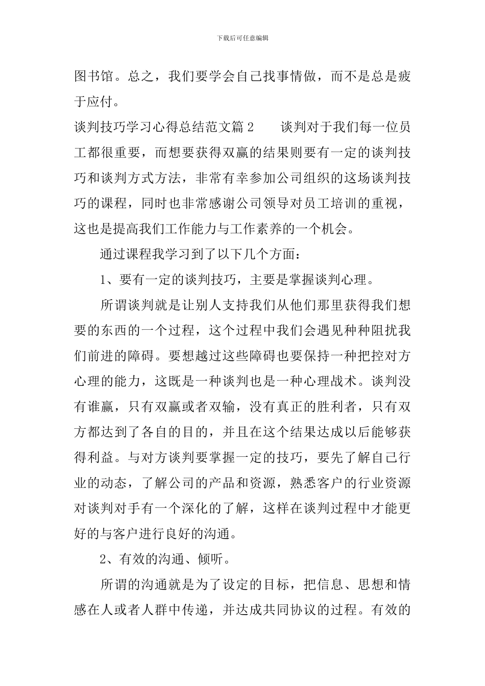下载后可任意编辑谈判技巧学习心得总结范文谈判技巧学习心得总结范文篇1这学期,我们对商务谈判进行了学习。通过一学期的学习,我们对谈判有了一个大致的了解。没有学习这门课程之前,我们自己不知道生活中还参杂着商务谈判。比如:我们自己买衣服的时候,会和老板讨价还价;不管是买任何东西,只要是关系到自身利益的时候我们都在进行商务谈判。学习了商务谈判,我懂得了,在商务谈判中,开局、沟通、谈判的技巧、情报因素、时间的把握、还有谈判的策略都是很重要的。没学习商务谈判之前,其实我们每个人的谈判能力也各不相同,有的同学比较善于沟通,所以在买衣服的时侯或者是其他方面都做得比较好,学习这门课程就更轻松。但是有的同学比较内向,很少和陌生人沟通沟通,甚至是自己去买衣服这种情况都很少,对于这种同学来说,学习这门课程首先就要联系说话,甚至是和陌生人说话。我觉得我是这两类人的综合体,还是需要进行培育,锻炼。就好比老师对我们进行的一个测验,把这本教材最后的商务谈判能力的测验给我们做,我们大多数的同学根据自己的第一印象来选择都属于第二级这一类,但是还是有几个同学属于第一级,这就说明了各自的能力不同。但是下载后可任意编辑学习了这门课程之后又不一样,因为我们都多多少少掌握了一些谈判的技巧和策略。我最感兴趣的应该是商务谈判策略这一章,里面讲的先后报价策略,让步的策略,拒绝的策略,最后通牒的策略,对我们的生活甚至的以后的商业谈判都有很大的启发我们的专业是电子商务专业,所以以后面临谈判的机会会很多。以前上高中的时候,老师常常挂在嘴边用于激励我们的话就是上了大学的人和没上过大学的人在很多方面还是表现的不一样的。所以我认为,我们的专业知识我们必须掌握,对以后的进展有很大的帮助。学习商务谈判的最后一个星期,我们进行了一次模拟商务谈判。从个方面来讲,我们都有不足:首先就是准备上的不足,假如老师不下最后通牒,我想我们一定会一直不去准备,不难想象之后的结局会有多糟糕。其次,我想就是沟通的问题了,下面的时候谈判双方缺乏沟通,所以谈判的时候双方都不做出让步,谈判自然陷入僵局。最后应该是我们自己的用词和说话的问题,普通话不过关,所以在用词上就会词不达意。总而言之,我们商务谈判这门课程虽结束了,但是我们的学习还没有结束,我们一生都是一个学习的过程,学习是永无止境的,尤其是沟通和谈判。所以在课余时间,我们可以多上网看看谈判的视频、查查资料,或者是泡泡下载后可任意编辑图书馆。总之,我们要学会自己找事情做,而不是总是疲于应付。谈判技巧学习心得总结范文篇2谈判对于我们每一位员工都很重要,而想要获得双赢的结果则要有一定的谈判技巧和谈判方式方法,非常有幸参加公司组织的这场谈判技巧的课程,同时也非常感谢公司领导对员工培训的重视,这也是提高我们工作能力与工作素养的一个机会。通过课程我学习到了以下几个方面:1、要有一定的谈判技巧,主要是掌握谈判心理。所谓谈判就是让别人支持我们从他们那里获得我们想要的东西的一个过程,这个过程中我们会遇见种种阻扰我们前进的障碍。要想越过这些障碍也要保持一种把控对方心理的能力,这既是一种谈判也是一种心理战术。谈判没有谁赢,只有双赢或者双输,没有真正的胜利者,只有双方都达到了各自的目的,并且在这个结果达成以后能够获得利益。与对方谈判要掌握一定的技巧,要先了解自己行业的动态,了解公司的产品和资源,熟悉客户的行业资源对谈判对手有一个深化的了解,这样在谈判过程中才能更好的与客户进行良好的沟通。2、有效的沟通、倾听。所谓的沟通就是为了设定的目标,把信息、思想和情感在人或者人群中传递,并达成共同协议的过程。有效的下载后可任意编辑沟通有利于我们和客户之间互相了解彼此的情况,要正确的了解他人的感受和情绪,做到互相理解、关怀和感情上的融洽。3、有效的推断客户类型进行谈判。有效的推断客户类型是我们谈判的一个基础,在谈判中会遇见这样的几种人和角色:首席代表、白脸、红脸、强硬派、清道夫。谈判桌上要学会察言观色,能够有力的分析出谁是主要的角色,而同时我们自己又应...