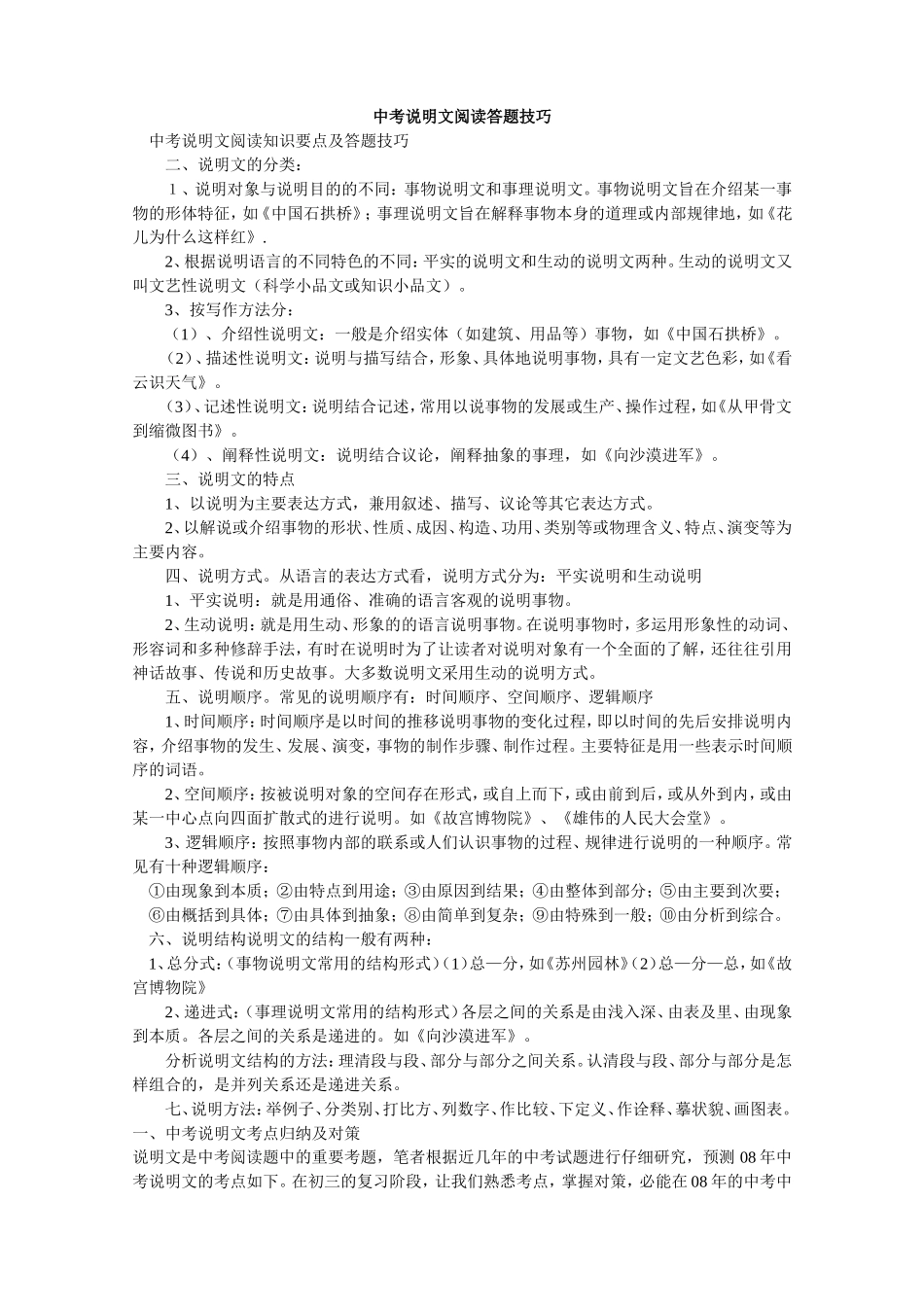 中考说明文阅读答题技巧中考说明文阅读知识要点及答题技巧二、说明文的分类:1、说明对象与说明目的的不同:事物说明文和事理说明文。事物说明文旨在介绍某一事物的形体特征,如《中国石拱桥》;事理说明文旨在解释事物本身的道理或内部规律地,如《花儿为什么这样红》.2、根据说明语言的不同特色的不同:平实的说明文和生动的说明文两种。生动的说明文又叫文艺性说明文(科学小品文或知识小品文)。3、按写作方法分:(1)、介绍性说明文:一般是介绍实体(如建筑、用品等)事物,如《中国石拱桥》。(2)、描述性说明文:说明与描写结合,形象、具体地说明事物,具有一定文艺色彩,如《看云识天气》。(3)、记述性说明文:说明结合记述,常用以说事物的发展或生产、操作过程,如《从甲骨文到缩微图书》。(4)、阐释性说明文:说明结合议论,阐释抽象的事理,如《向沙漠进军》。三、说明文的特点1、以说明为主要表达方式,兼用叙述、描写、议论等其它表达方式。2、以解说或介绍事物的形状、性质、成因、构造、功用、类别等或物理含义、特点、演变等为主要内容。四、说明方式。从语言的表达方式看,说明方式分为:平实说明和生动说明1、平实说明:就是用通俗、准确的语言客观的说明事物。2、生动说明:就是用生动、形象的的语言说明事物。在说明事物时,多运用形象性的动词、形容词和多种修辞手法,有时在说明时为了让读者对说明对象有一个全面的了解,还往往引用神话故事、传说和历史故事。大多数说明文采用生动的说明方式。五、说明顺序。常见的说明顺序有:时间顺序、空间顺序、逻辑顺序1、时间顺序:时间顺序是以时间的推移说明事物的变化过程,即以时间的先后安排说明内容,介绍事物的发生、发展、演变,事物的制作步骤、制作过程。主要特征是用一些表示时间顺序的词语。2、空间顺序:按被说明对象的空间存在形式,或自上而下,或由前到后,或从外到内,或由某一中心点向四面扩散式的进行说明。如《故宫博物院》、《雄伟的人民大会堂》。3、逻辑顺序:按照事物内部的联系或人们认识事物的过程、规律进行说明的一种顺序。常见有十种逻辑顺序:①由现象到本质;②由特点到用途;③由原因到结果;④由整体到部分;⑤由主要到次要;⑥由概括到具体;⑦由具体到抽象;⑧由简单到复杂;⑨由特殊到一般;⑩由分析到综合。六、说明结构说明文的结构一般有两种:1、总分式:(事物说明文常用的结构形式)(1)总—分,如《苏州园林》(2)总—分—总,如《故宫博物院》2、递进式:(事理说明文常用的结构形式)各层之间的关系是由浅入深、由表及里、由现象到本质。各层之间的关系是递进的。如《向沙漠进军》。分析说明文结构的方法:理清段与段、部分与部分之间关系。认清段与段、部分与部分是怎样组合的,是并列关系还是递进关系。七、说明方法:举例子、分类别、打比方、列数字、作比较、下定义、作诠释、摹状貌、画图表。一、中考说明文考点归纳及对策说明文是中考阅读题中的重要考题,笔者根据近几年的中考试题进行仔细研究,预测08年中考说明文的考点如下。在初三的复习阶段,让我们熟悉考点,掌握对策,必能在08年的中考中收到说明文考题稳拿高分的良效。考点之一说明对象考查类型:直接让学生回答:“这篇文章(或文段)的说明对象是什么?”对策:事物说明文一般标题就是说明的对象;事理说明文找准开头结尾的总结句。因为说明对象是一篇文章所要介绍的事物或事理,一般是一个名词或名词短语,可以从两个方面入手:一看文题二看首尾段。事物说明文指出被说明事物即可。事理说明文指出说明内容,形成一个短语:介绍了……的……(对象加内容)。考点之二说明对象的特征类型1、直接找出说明事物的特征的句子对策:A、看题目B、在首段中找C、抓关键词句(比如:运用了说明方法的语句、中心句)类型2、概括说明事物的特征对策:分析文章结构,抓中心句及连接词,如“首先”“其次”“还”“也”“此外”等词语考点之三说明方法类型1、直接让考生回答文章或段落的说明方法对策:了解常见的说明方法(举例子、分类别、下定义、摹状貌、作诠释、打比方、列数字、列图表、引用说明)的...