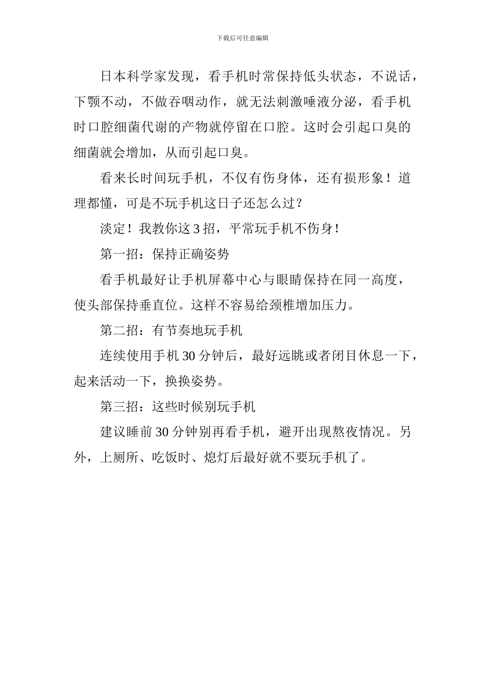 下载后可任意编辑中学生演讲:手机对身体的危害你有没有这种感觉,只要一个小时甚至几分钟不玩手机就如坐针毡?手机已经成为我们生活中不可或缺的沟通、娱乐工具,如今低着头玩手机的人随处可见。当人们长时间沉迷于手机带来的感官刺激,对手机的依赖也越发严重,不知不觉间已对身体造成巨大的损害。看完下面为你做的这些分析,你就知道,“长时间玩手机等于慢性自杀”一点都不夸张。1.低头玩手机,谋害颈椎长时间玩手机等于“谋害”颈椎!年轻人得了颈椎病,多是常常玩手机的“低头族”。成年人的头大概有5公斤重,当低头达到60度时,颈部受力就相当于25公斤。这下知道你肩颈酸痛的原因了吧。2.吃饭玩手机,伤了胃肠脑吃饭玩手机相当于在损害胃肠和大脑!进餐时的注意力全部放在手机上,不仅影响胃酸及胰腺各种酶的分泌,而且会减少肠胃的血流供应,不利于食物消化。大脑也会因血液供应不足,出现缺氧,引起疲劳。3.频繁玩手机,损害眼睛和视力下载后可任意编辑太频繁玩手机,最受损害的首当其冲就是眼睛!人们假如长时间盯着手机,尤其在昏暗的环境下,眼睛肌肉会疲劳,容易引起眼睛红肿、充血,严重时会令眼睛受到永久性的损害。假如你常常感到眼累、眼干、眼模糊,说明你用眼过度了。4.长时间玩手机,有损心功能不少心源性猝死的主要诱因和熬夜玩手机有关!国外有讨论报告指出,每天花两小时盯着电视、电脑屏幕的人,罹患心脏疾病致死率是平常人一倍。长时间熬夜玩手机,会引起人体电解质紊乱,从而诱发心源性猝死。5.卫生间玩手机,痔疮找上门如厕时分神玩手机,便秘、痔疮等肛肠疾病说来就来!原来如厕最多也就10分钟左右,很多人带着手机一玩就是半小时,蹲得腿发麻、坐到盆骨痛才罢休。久而久之静脉丛淤血、扩张和屈曲形成痔疮,也会容易引起便秘哦。6.不换姿势玩手机,小心血栓长期保持同一个姿势玩手机,不知不觉形成血栓!不久前有这样一条新闻,一位身体健康的女子坐了十几个小时的火车后,在颈部和脑部出现多个血栓,就是在车上长时间歪着脑袋刷手机造成的。7.过度专注玩手机,口臭不雅长时间低头玩手机不说话,口中细菌就会增加!下载后可任意编辑日本科学家发现,看手机时常保持低头状态,不说话,下颚不动,不做吞咽动作,就无法刺激唾液分泌,看手机时口腔细菌代谢的产物就停留在口腔。这时会引起口臭的细菌就会增加,从而引起口臭。看来长时间玩手机,不仅有伤身体,还有损形象!道理都懂,可是不玩手机这日子还怎么过?淡定!我教你这3招,平常玩手机不伤身!第一招:保持正确姿势看手机最好让手机屏幕中心与眼睛保持在同一高度,使头部保持垂直位。这样不容易给颈椎增加压力。第二招:有节奏地玩手机连续使用手机30分钟后,最好远眺或者闭目休息一下,起来活动一下,换换姿势。第三招:这些时候别玩手机建议睡前30分钟别再看手机,避开出现熬夜情况。另外,上厕所、吃饭时、熄灯后最好就不要玩手机了。