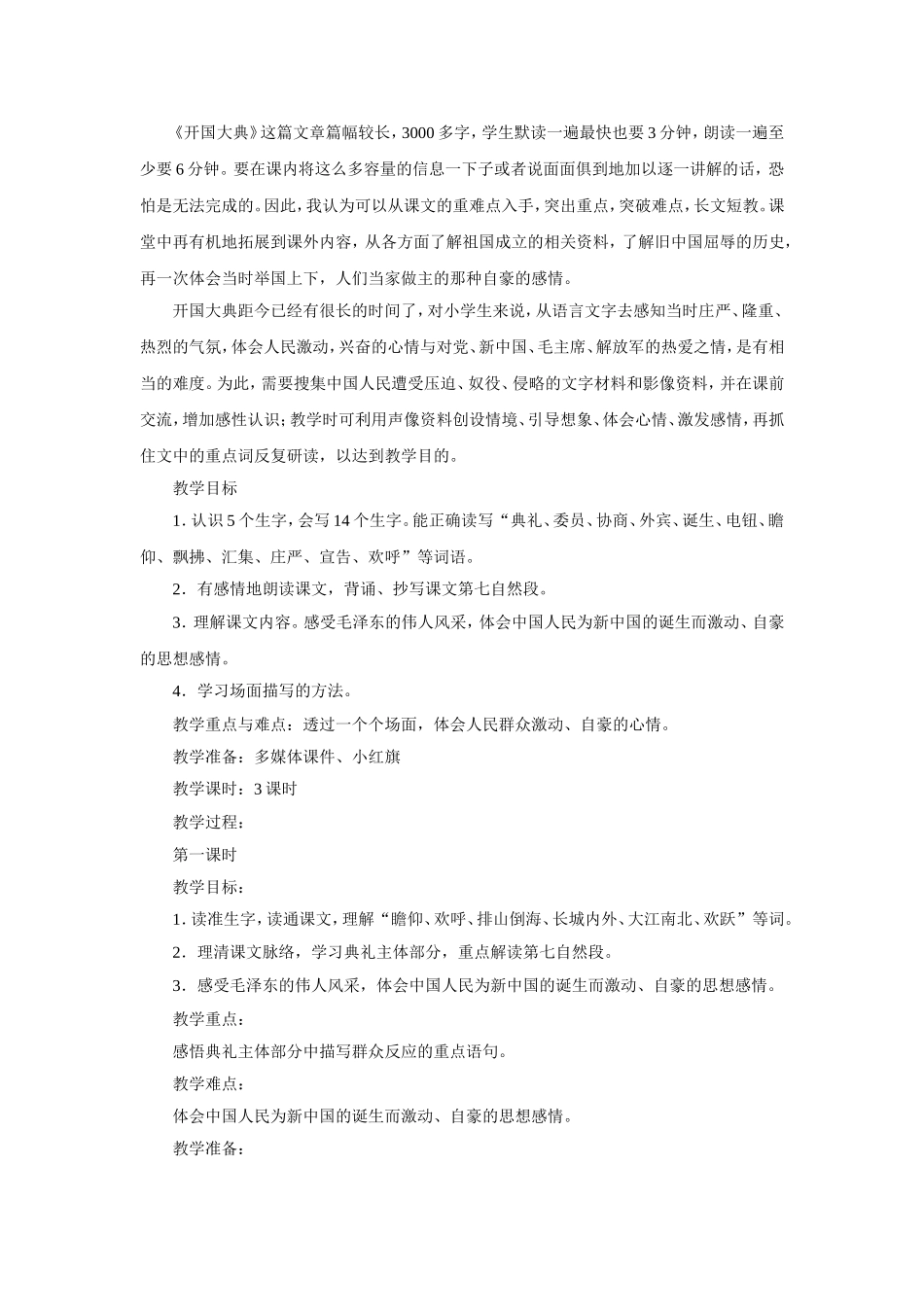 《开国大典》教学设计1教材分析:《开国大典》是沪教版五年级上册的一篇精读课文。本文记叙了1949年10月1日在首都北京举行开国大典的盛况,表达了中国人民对新中国的诞生无比自豪、激动的感情,展现了中华人民共和国的缔造者们特别是毛泽东的领袖风采。课文按照开国大典进行的顺序叙述。先讲大会开始前会场上的情况;然后讲典礼的主体部分——毛泽东宣布中华人民共和国中央人民政府成立、升国旗、宣读中央人民政府公告;接着讲阅兵式的盛况;最后讲群众游行。本课重在表现中国人民对新中国的成立感到无比自豪、激动的心情,展现毛泽东的领袖风采。而要体会到这一点,对今天的学生来说,又是一个难点。在记叙大会开会前这一部分,课文先交代了举行开国大典的时间、地点和参加典礼的人员和人数,然后描述了会场的布置和群众队伍的场面。虽然典礼还没开始,但我们从参加会议的人员、人数,主席台的布置,会场上群众队伍的场面,分明感受到了这个典礼的盛大和隆重,也感受到了参加典礼的人们那种激动、兴奋的心情。那些从“老远”的长辛店等地坐火车清早到了北京站,一下火车就“直奔”会场的铁路工人,那些五更天摸着黑起床,步行四五十里“赶”来的郊区农民,显然就是参加典礼的三十万人的缩影。就是会场上“挺立”的电动旗杆,似乎也是站起来了的中国人民屹立在世界东方的象征。从记叙大会开始,这种激动、兴奋、自豪的感情表达得更加强烈。当毛泽东出现在主席台上时,会场上“爆发出一阵排山倒海的掌声”,三十万人的目光“一齐投向主席台”,这显然表达了对领袖的无限热爱,对新中国的无限热爱。当毛泽东宣布“中华人民共和国中央人民政府在今天成立了”之后,课文用了“这庄严的宣告,这雄壮的声音……”这样两个长句子,表达了全场三十万人以及全中国人民为新中国的诞生而欢欣鼓舞的心情。当升起第一面五星红旗的时候,三十万人“一齐”脱帽肃立,“一齐”抬起头,瞻仰五星红旗,“五星红旗升起来了,表明中国人民从此站起来了”,激动、自豪的感情溢于言表。如果说,叙述典礼的部分主要表达的是热爱新中国,为新中国的诞生而激动、兴奋的心情的话,那么,记叙阅兵式的部分,除表达这种激动、兴奋的心情外,更侧重于表达为人民军队的出色表演而感到自豪的感情。学情分析:《开国大典》这篇文章篇幅较长,3000多字,学生默读一遍最快也要3分钟,朗读一遍至少要6分钟。要在课内将这么多容量的信息一下子或者说面面俱到地加以逐一讲解的话,恐怕是无法完成的。因此,我认为可以从课文的重难点入手,突出重点,突破难点,长文短教。课堂中再有机地拓展到课外内容,从各方面了解祖国成立的相关资料,了解旧中国屈辱的历史,再一次体会当时举国上下,人们当家做主的那种自豪的感情。开国大典距今已经有很长的时间了,对小学生来说,从语言文字去感知当时庄严、隆重、热烈的气氛,体会人民激动,兴奋的心情与对党、新中国、毛主席、解放军的热爱之情,是有相当的难度。为此,需要搜集中国人民遭受压迫、奴役、侵略的文字材料和影像资料,并在课前交流,增加感性认识;教学时可利用声像资料创设情境、引导想象、体会心情、激发感情,再抓住文中的重点词反复研读,以达到教学目的。教学目标1.认识5个生字,会写14个生字。能正确读写“典礼、委员、协商、外宾、诞生、电钮、瞻仰、飘拂、汇集、庄严、宣告、欢呼”等词语。2.有感情地朗读课文,背诵、抄写课文第七自然段。3.理解课文内容。感受毛泽东的伟人风采,体会中国人民为新中国的诞生而激动、自豪的思想感情。4.学习场面描写的方法。教学重点与难点:透过一个个场面,体会人民群众激动、自豪的心情。教学准备:多媒体课件、小红旗教学课时:3课时教学过程:第一课时教学目标:1.读准生字,读通课文,理解“瞻仰、欢呼、排山倒海、长城内外、大江南北、欢跃”等词。2.理清课文脉络,学习典礼主体部分,重点解读第七自然段。3.感受毛泽东的伟人风采,体会中国人民为新中国的诞生而激动、自豪的思想感情。教学重点:感悟典礼主体部分中描写群众反应的重点语句。教学难点:体会中国人民为新中国的诞生而激动、自豪的思想感情。教...