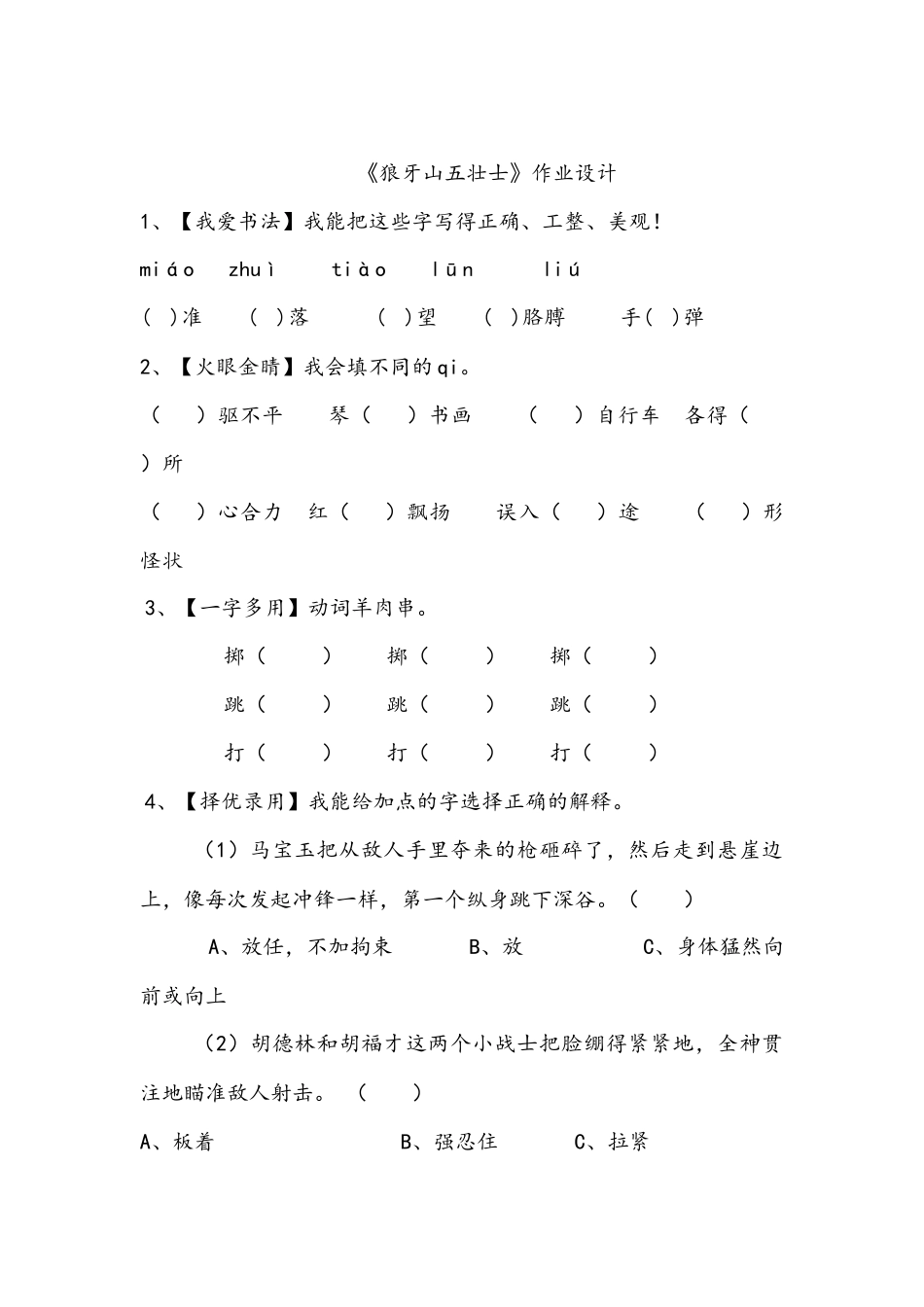 《狼牙山五壮士》作业设计1、【我爱书法】我能把这些字写得正确、工整、美观!miáozhuìtiàolūnliú()准()落()望()胳膊手()弹2、【火眼金睛】我会填不同的qi。()驱不平琴()书画()自行车各得()所()心合力红()飘扬误入()途()形怪状3、【一字多用】动词羊肉串。掷()掷()掷()跳()跳()跳()打()打()打()4、【择优录用】我能给加点的字选择正确的解释。(1)马宝玉把从敌人手里夺来的枪砸碎了,然后走到悬崖边上,像每次发起冲锋一样,第一个纵身跳下深谷。()A、放任,不加拘束B、放C、身体猛然向前或向上(2)胡德林和胡福才这两个小战士把脸绷得紧紧地,全神贯注地瞄准敌人射击。()A、板着B、强忍住C、拉紧5、【积累运用】认真填写,再仔细读一读。(1)“横七竖八”指的是_________,带有“七、八”的成语有_______。(2)“惊天动地”是指声音_________,表示声音的词语有________。(3)“眺望”是指_________看,表示看的词语有__________。6、【我会用词】我能在括号里添上适当的词语。()的地形()的怒火()的口号()地打击()地指挥()地瞄准7、【综合提高】按要求做。(可选做)(1)把下面的词语补充完整。()钉()铁()()山河()高()下昂首()()(2)用直线把意思相近的成语连起来。不屈不挠全神贯注聚精会神励精图治奋发图强坚强不屈(3)照样子各写2个词语。例:声东击西、________、_________。例:再接再厉、________、_________。8、【课文回味】结合课文内容。(1)想想课文的叙述顺序,并填空。接受任务→()→()→()→跳下悬崖。(2)人民不会忘记英雄,五位壮士的名字是:()。(3)五壮士用气壮山河的英雄壮举向日寇、向所有的侵略者证明:()(4)为了不让敌人发现群众和连队主力,班长马宝玉斩钉截铁地说了一声“走!”带头向棋盘陀走去。从“走”这个字中我体会到:()。(5)“顿时,石头像雹子一样,带着五壮士的决心,带着中国人民的仇恨,向敌人头上砸去。”是()句,把()比作()。说明()。这充分体现出()。请你仿写这个句子:()。石头“带着中国人民的仇恨”,你知道日寇对中国人民犯下了哪些罪恶滔天的事吗?列举几个。