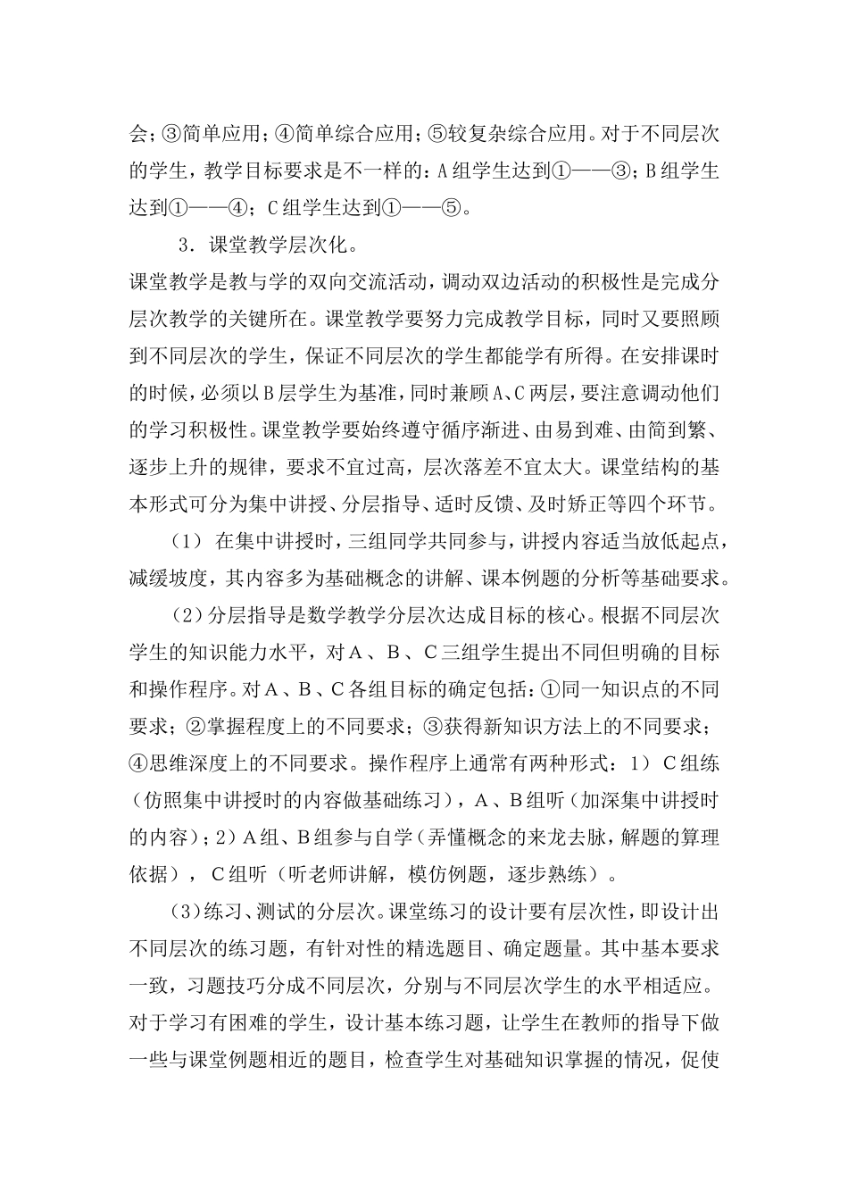 初中数学分层次教学的实践与反思张洪敏内容摘要:1.更新观念,提高对初中数学分层次教学的认识。2.初中数学分层次教学的实践:学生层次的划分;教学目标层次的划分;课堂教学层次化;布置作业层次化;课外辅导层次化。3.实践后的反思:教师必须具有强烈的事业心和高度的责任感;注重成绩水平,轻视能力培养;学生层次分明,教师教法单一;缺乏思想引导,学生心理负担过重;建立评价目标多元、评价方法多样的评价体系。关键词:数学分层次教学实践反思一、更新观念,提高对初中数学分层次教学的认识。1.《义务教育国家数学课程标准》(实验稿)指出:“人人学有价值的数学;人人都能获得必需的数学;不同的人在数学上得到不同的发展。”这一提法反映了义务教育阶段面向全体学生,体现基础性、普及性和发展性的基本精神,代表着一种新的数学课程理念和实践体系。其中“不同的人在数学上得到不同的发展”是指数学课程要面对每一个有差异的个体,适应每一个学生的不同发展需要。2.通过调查发现,在我校初中数学教学中,普遍存在着学生学习成绩两极分化严重,差生面广,多数学生学习习惯不好,对学数学信心不足,学习兴趣不浓等问题。究其原因,主要是实施义务教育后,学生没有筛选,所有不同学习水平的小学毕业生都进了中学,而且由于学校所处地理位置的特殊性,流动人口的子女入学比例逐年增长。在一个班内,学生的学习水平参差不齐,学习兴趣、学习习惯有很大差别,这就迫切需要我们更新观念,探索出既能面向全体又能充分发展学生个性和学习潜能的数学教学模式,最大限度地调动学生的学习积极性,提高学习水平,全面提高教学质量。而分层次教学正是适应了这种新的需要,符合因材施教的原则,能使每一位学生都能在原有基础上得到较大的提高。二、初中数学分层次教学的实践。1.学生层次的划分。2013—2014学年我在初二(2)班进行初中数学分层次教学的实验研究。该实验的指导思想是:保持原班级组织和学生原区域分布(即各层次的座位不变),调整课堂教学与课内、课外指导方法,实现面向全体、分层达标的目的。为了落实分层教学,最大限度地调动学生的积极性,在做细、做好思想工作的基础上,采用让学生自我评价、自愿报名,教师稍加调整的办法,将全班学生分成A、B、C三组。A组为学习有困难、较差层次的学生,B组为中等层次的学生,C组为学有余力、优秀层次的学生。由于学习是一个循序渐进的漫长过程,学生的智力、能力发展会出现一些变化,所以我鼓励学生向高一层次跃进,也同意个别学生进入低一层次,目的是让所有学生随时都处于最佳学习状态。2.教学目标层次的划分。初中数学的教学目的是:使学生学好当代社会中每一个公民适应日常生活、参加生产和进一步学习所必需的代数、几何的基础知识与基本技能,进一步培养运算能力,发展思维能力和空间观念,使他们能够运用所学知识解决简单的实际问题,并逐步形成数学创新意识。培养学生良好的个性品质和初步的辩证唯物主义的观点。分清学生层次后,要以“面向全体,兼顾两头”为原则,以教学大纲、考试说明为依据,根据教材的知识结构和学生的认识能力,将知识、能力和思想方法融为一体,合理地制定各层次学生的教学目标,并将层次目标贯穿于教学的各个环节。对于教学目标,可分为五个层次:①识记;②领会;③简单应用;④简单综合应用;⑤较复杂综合应用。对于不同层次的学生,教学目标要求是不一样的:A组学生达到①——③;B组学生达到①——④;C组学生达到①——⑤。3.课堂教学层次化。课堂教学是教与学的双向交流活动,调动双边活动的积极性是完成分层次教学的关键所在。课堂教学要努力完成教学目标,同时又要照顾到不同层次的学生,保证不同层次的学生都能学有所得。在安排课时的时候,必须以B层学生为基准,同时兼顾A、C两层,要注意调动他们的学习积极性。课堂教学要始终遵守循序渐进、由易到难、由简到繁、逐步上升的规律,要求不宜过高,层次落差不宜太大。课堂结构的基本形式可分为集中讲授、分层指导、适时反馈、及时矫正等四个环节。(1)在集中讲授时,三组同学共同参与,讲授内容适当放低起点,减缓坡度,其内容...