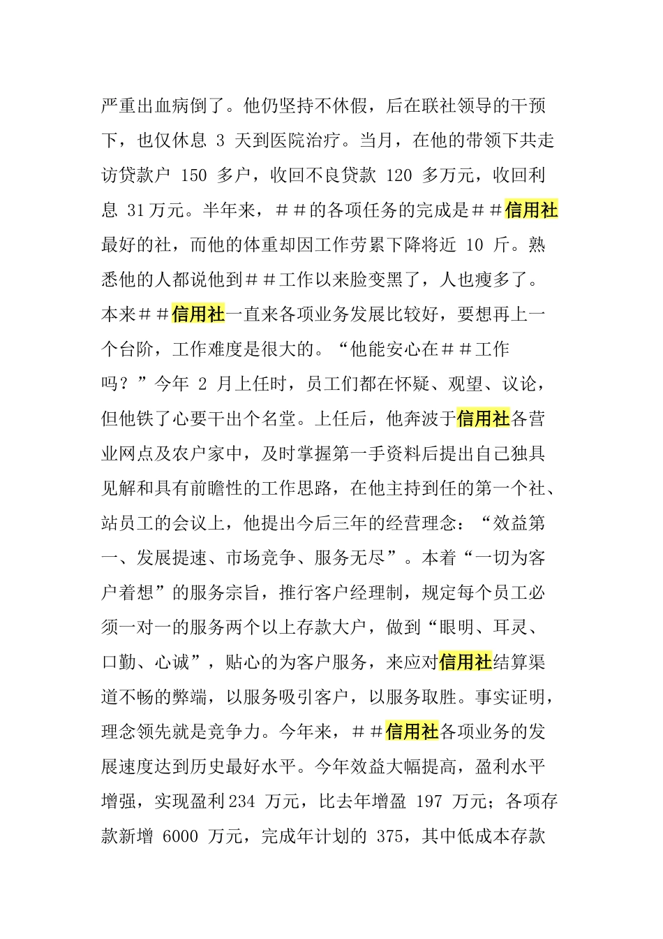 ##信用社(银行)十大杰出青年岗位能手”先进事迹材料##年12月8日,##省##市##农村信用社主任##在从浙江萧山收贷回来的路上接到通知,他被评为“##市十大杰出青年岗位能手”。12月9日,他拖着疲惫的身子走下火车走进表彰会场,接受市委副书记##为他颁发的“十大杰出青年岗位能手”的牌匾和证书。浙江萧山之行,往返不到四天的时间,##和信用社的另一名同志一路风尘仆仆,克服重重困难,终于收回一笔1994年的陈欠贷款本金5万元,利息24192元。象这样“蚂蚁啃骨头”式到外面盘活老贷款的还有今年4月18日,他随身携带药物,同信用社员工到贵州六盘水盘活一笔多年未清利息的贷款19万元,几经寻找,几经周旋,共收回该户贷款本金1万元,利息5.3万元。“做一把手就得有牺牲精神,干工作就要舍小家,为大家。”##是这么说的,也是这么做的。今年2月,他从##联社机关办公室主任岗位交流到##信用社任主任,当时,由于去年年底因右肾肿瘤刚做完手术,身体正处于恢复时期,加之他父母、妻子都在##城区,儿子在##一中上学。父母、妻儿担心他身体吃不消,强烈反对他到基层工作,但他义无反顾,服从组织的安排,自己独自到##任职,过着单身生活,边付药边工作。作为信用社主任外出收贷、办事,到##汇报是常有的事,本来顺便回家看父母、妻儿是人之常情。但是他常常却过门而不入。11月19日,邱主任从早晨8点在##出发,到##法院办理一笔贷款诉讼手续后回到##,上午10点多钟一位黄金客户送来一张300万元的银行票汇要求帮他进账,当时信用社其他同志都出去了,于是他马上搭车到##建行为客户代办进账手续后直接回到##。下午他又接到税务部门的通知,要去办理税务登记证的变更手续,于是他马不停蹄的赶到杨家滩国税所,再到##国税局,办好变更手续后再送到杨家滩国税所,在杨家滩又找到一个贷款户,落实好还款计划,回到##已是晚上8点多钟了。这天他3次经过家门口,但因赶时间,硬是没回家和父母、妻儿说上一句话。到##上任以来,他很少休个大礼拜,最多每个星期休一天假,和以前在办公室工作一样,近三年累计加班2000多个小时。邱主任是个工作狂,白天黑夜都在忙。他深知“旧贷不盘活,经营难搞活,要想旧贷活,务必不重药。”##地域广,贷款分布散,催收难度大。今年6月,天气炎热,酷暑难当,但为了摸清各网点半年来各项业务情况及澄清老贷款底细,便于加大清收力度,他带领外勤人员深入各站、村组逐户逐笔清老贷,没分日夜地忙碌,他因右肾肿瘤作了切除手术,人容易疲劳,有时甚至差点累倒在工作岗位上。一天,在下乡回来的路上,他双腿如灌沿一般难以挪步,豆大的汗珠顺额滴嗒在干裂的土地上,终因痔疮严重出血病倒了。他仍坚持不休假,后在联社领导的干预下,也仅休息3天到医院治疗。当月,在他的带领下共走访贷款户150多户,收回不良贷款120多万元,收回利息31万元。半年来,##的各项任务的完成是##信用社最好的社,而他的体重却因工作劳累下降将近10斤。熟悉他的人都说他到##工作以来脸变黑了,人也瘦多了。本来##信用社一直来各项业务发展比较好,要想再上一个台阶,工作难度是很大的。“他能安心在##工作吗?”今年2月上任时,员工们都在怀疑、观望、议论,但他铁了心要干出个名堂。上任后,他奔波于信用社各营业网点及农户家中,及时掌握第一手资料后提出自己独具见解和具有前瞻性的工作思路,在他主持到任的第一个社、站员工的会议上,他提出今后三年的经营理念:“效益第一、发展提速、市场竞争、服务无尽”。本着“一切为客户着想”的服务宗旨,推行客户经理制,规定每个员工必须一对一的服务两个以上存款大户,做到“眼明、耳灵、口勤、心诚”,贴心的为客户服务,来应对信用社结算渠道不畅的弊端,以服务吸引客户,以服务取胜。事实证明,理念领先就是竞争力。今年来,##信用社各项业务的发展速度达到历史最好水平。今年效益大幅提高,盈利水平增强,实现盈利234万元,比去年增盈197万元;各项存款新增6000万元,完成年计划的375,其中低成本存款新增近5000万元,各项存款余额超过2亿元,各项存款的的增量、增幅,低成...