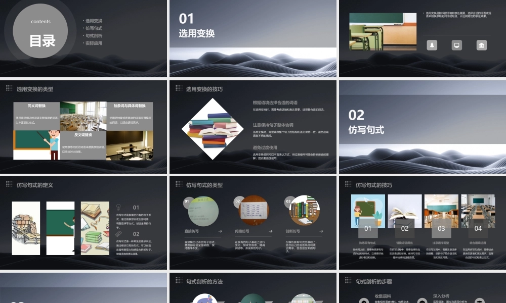 选用变换和仿写句式剖析课件目录contents• 选用变换• 仿写句式• 句式剖析• 实际应用选用变换01• 选用变换是指根据语境和表达需要,选择合适的词语或短语来替换原始的词语或短语,以达到特定的表达效果。选用变换的定义 选用变换的类型同义词替换使用意思相近的词语来替换原始词语,以丰富表达方式。反义词替换使用意思相反的词语来替换原始词语,以突出对比效果。抽象词与具体词替换使用更抽象或更具体的词语来替换原始词语,以适应语境需求。注意保持句子整体协调选用变换时,需要确保整个句子的结构和语义保持一致,避免出现语意不明的情况。避免过度使用选用变换虽然可以丰富表达方式,但过度使用可能会影响读者的理解,因此要适度使用。根据语境选择合适的词语在选用变换时,需要考虑语境和表达需要,选择最合适的词语。选用变换的技巧仿写句式020102仿写句式的定义仿写句式是一种常见的修辞手法,通过模仿已有的句式,可以创造出富有表现力和感染力的新句子,增强语言的表达效果。仿写句式是指模仿已有的句子形式,通过替换部分或全部词语、调整语序等方式,创造出新的句子。直接模仿已有的句子形式,替换部分或全部词语,保持语序不变。直接仿写间接仿写创新仿写在原有的句子基础上进行变化,如改变语序、增减词语等,形成新的句子。在模仿原有句式的基础上,结合自己的语言风格和表达需求,创造出全新的句子。030201仿写句式的类型熟悉原有句式替换词语得当注意语序调整结合语境运用仿写句式的技巧01020304在仿写之前,需要熟悉原有句式的结构和特点,以便更好地进行模仿和创新。在仿写过程中,需要选择恰当的词语进行替换,保持句子的整体协调和语意连贯。在仿写过程中,需要注意语序的调整,使新句子符合语法规范和表达习惯。在运用仿写句式时,需要结合具体的语境和表达需求,选择合适的句式和表达方式。句式剖析03通过分析句子的结构、词性、时态等语言要素,理解句子的语法关系和语义逻辑。语法分析探究句子所表达的概念、意义和逻辑关系,理解句子在特定语境中的具体含义。语义分析研究句子在特定语境中的使用方式和功能,包括言外之意、语气和态度等方面的分析。语用分析句式剖析的方法得出结论总结分析结果,得出关于句子结构和意义的结论。深入分析运用语法、语义和语用分析方法,深入探究句子的内在关系和意义。初步分析对收集的语料进行初步的观察和分析,了解句子的基本结构和特点。确定分析目标明确要解决的问题或...