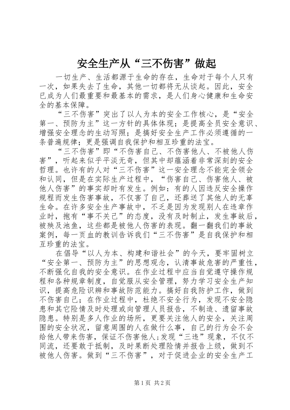 安全生产从“三不伤害”做起一切生产、生活都源于生命的存在,生命对于每个人只有一次,如果失去了生命,其他一切都将无从谈起。因此,安全已成为人们最重要和最基本的需求,是人们身心健康和生命安全的基本保障。“三不伤害”突出了以人为本的安全工作核心,是“安全第一、预防为主”这一方针的具体体现;是提高全员安全意识、增强安全理念的生动写照;是搞好安全生产工作必须遵循的一条普遍规律;更是强调自我保护和相互珍重的法宝。“三不伤害”即“不伤害自己、不伤害他人、不被他人伤害”,听起来似乎平淡无奇,但其中却蕴涵着非常深刻的安全哲理。也许有的人对“三不伤害”这一安全理念不能完全领会和认同,但是在实际生产过程中,“伤害自己、伤害他人、被他人伤害”的事实却时有发生。例如:有的人因违反安全操作规程而发生伤害事故,不仅害了自己,还葬送了其他人的无辜生命。在许多安全生产事故中,不乏是因为发现别人在违章作业时,抱有“事不关己”的态度,没有及时制止,发生事故后,被殃及池鱼,这些都是被他人伤害的表现。翻一翻我们的事故案例,每一页血的教训告诉我们“三不伤害”是自我保护和相互珍重的法宝。在倡导“以人为本、构建和谐社会”的今天,要牢固树立“安全第一、预防为主”的思想观念,认清事故危害的严重性,不断强化自我的安全意识。在作业过程中应当自觉遵守操作规程和各种规章制度,自觉服从安全管理,努力学习安全生产知识,提高危险识辨和事故防范能力。搞好自我防护工作,做到不伤害自己;在作业过程中,杜绝不安全行为,发现不安全隐患和其它险情及时处理或向管理人员报告,不制造、遗留事故隐患。特别是多人作业的场所,更要关注他人的安全,关注周围的安全状况,留意周围的人在做什么事,自己的行为会不会给他人带来伤害,保证不伤害他人;发现“三违”现象,不仅不同流,还要敢于抵制,及时果断处理险情并报告上级,做到不被他人伤害。做到“三不伤害”,对于促进企业的安全生产工第1页共2页作,保护自我和他人身体健康有着重大的意义。因此,安全生产应从“三不伤害”做起。第2页共2页