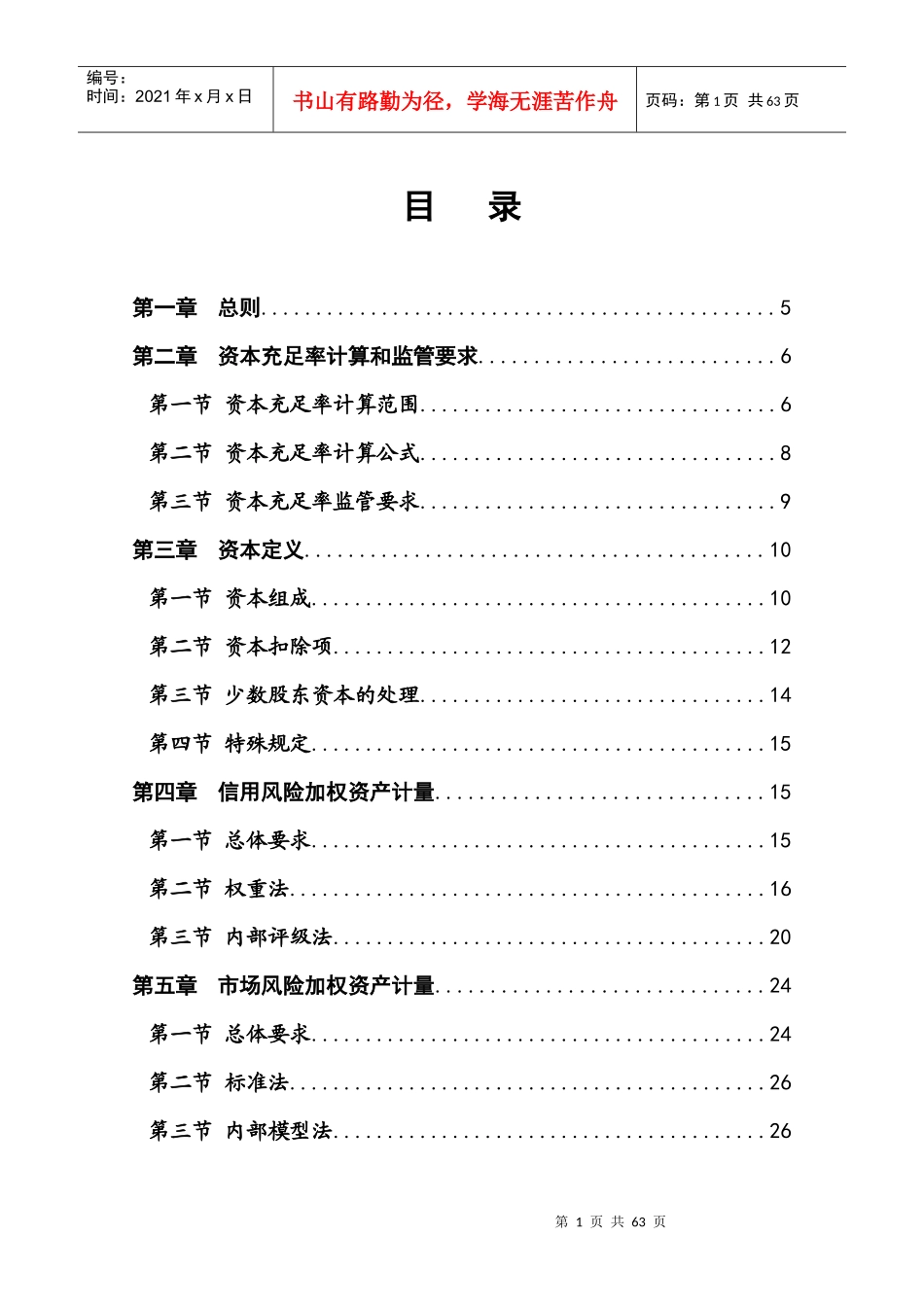 第0页共63页编号:时间:2021年x月x日书山有路勤为径,学海无涯苦作舟页码:第0页共63页商业银行资本管理办法(征求意见稿)二○一一年八月十二日第1页共63页第0页共63页编号:时间:2021年x月x日书山有路勤为径,学海无涯苦作舟页码:第1页共63页目录第一章总则...............................................5第二章资本充足率计算和监管要求...........................6第一节资本充足率计算范围.................................6第二节资本充足率计算公式.................................8第三节资本充足率监管要求.................................9第三章资本定义..........................................10第一节资本组成..........................................10第二节资本扣除项........................................12第三节少数股东资本的处理................................14第四节特殊规定..........................................15第四章信用风险加权资产计量..............................15第一节总体要求..........................................15第二节权重法............................................16第三节内部评级法........................................20第五章市场风险加权资产计量..............................24第一节总体要求..........................................24第二节标准法............................................26第三节内部模型法........................................26第2页共63页第1页共63页编号:时间:2021年x月x日书山有路勤为径,学海无涯苦作舟页码:第2页共63页第六章操作风险加权资产计量..............................27第一节总体要求..........................................27第二节基本指标法........................................28第三节标准法............................................29第四节高级计量法........................................30第七章商业银行内部资本充足评估程序......................30第一节总体要求..........................................30第二节治理结构..........................................31第三节风险评估..........................................35第四节资本规划..........................................36第五节监测和报告........................................37第八章监督检查..........................................39第一节监督检查内容......................................39第二节监督检查程序......................................40第三节第二支柱资本要求..................................42第四节监管措施..........................................43第九章信息披露..........................................46第十章附则..............................................48第3页共63页第2页共63页编号:时间:2021年x月x日书山有路勤为径,学海无涯苦作舟页码:第3页共63页附件1资本工具合格标准附件2信用风险权重法表内资产风险权重、表外项目信用转换系数及合格信用风险缓释工具附件3信用风险内部评级法风险暴露分类标准附件4信用风险内部评级体系监管要求附件5信用风险内部评级法风险缓释监管要求附件6专业贷款风险加权资产计量规则附件7交易对手信用风险加权资产计量规则附件8资产证券化风险加权资产计量规则附件9市场风险标准法计量规则附件10市场风险内部模型法监管要求附件11操作风险资本计量监管要求附件12外部评级使用规范附件13资本计量高级方法验证要求附件14商业银行风险评估标准附件15资本计量高级方法监督检查附件16信息披露要求第4页共63页第3页共63页编号:时间:2021年x月x日书山有路勤为径,学海无涯苦作舟页码:第4页共63页商业银行资本管理办法第一章总则第一条为加强对商业银行资本监管,促进商业银行安全、稳健运行,根据《中华人民共和国银行业监督管理法》、《中华人民共和国商业银行法》、《中华人民共和国外资银行管理条例》等法...