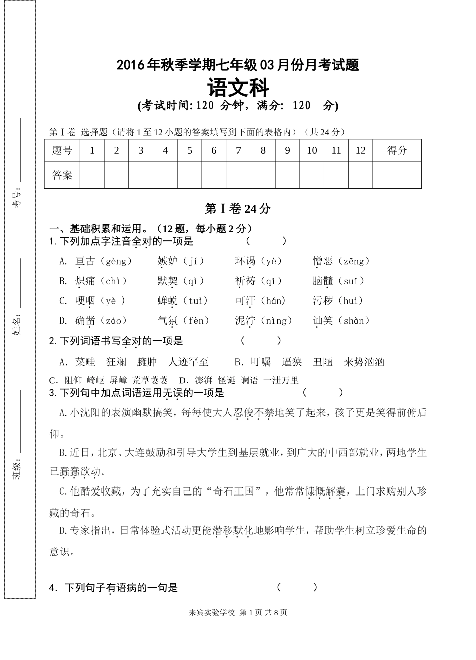 2016年秋季学期七年级03月份月考试题语文科(考试时间:120分钟,满分:120分)第Ⅰ卷选择题(请将1至12小题的答案填写到下面的表格内)(共24分)题号123456789101112得分答案第Ⅰ卷24分一、基础积累和运用。(12题,每小题2分)1.下列加点字注音全对的一项是()A.亘古(gèng)嫉妒(jí)环谒(yè)憎恶(zēng)B.炽痛(chì)默契(qì)祈祷(qǐ)脑髓(suǐ)C.哽咽(yè)蝉蜕(tuì)可汗(hán)污秽(huì)D.确凿(záo)气氛(fèn)泥泞(nìng)讪笑(shàn)2.下列词语书写全对的一项是()A.菜畦狂斓臃肿人迹罕至B.叮嘱逼狭丑陋来势汹汹C.阻仰崎岖屏嶂荒草萋萋D.澎湃怪诞谰语一泄万里3.下列句中加点词语运用无误的一项是()A.小沈阳的表演幽默搞笑,每每使大人忍俊不禁地笑了起来,孩子更是笑得前俯后仰。B.近日,北京、大连鼓励和引导大学生到基层就业,到广大的中西部就业,两地学生已蠢蠢欲动。C.他酷爱收藏,为了充实自己的“奇石王国”,他常常慷慨解囊,上门求购别人珍藏的奇石。D.专家指出,日常体验式活动更能潜移默化地影响学生,帮助学生树立珍爱生命的意识。4.下列句子有语病的一句是()来宾实验学校第1页共8页班级:姓名:考号:A.在建设机场的过程中,无论工人们遇到什么样的困难,他们却能披荆斩棘,一往无前。B.在列车长粗暴的干涉下,使爱迪生在火车上边卖报边做实验的愿望破灭了。C.中国残疾人艺术团在香港演出大型音乐舞蹈《我的梦》,受到观众的热烈欢迎。D.实践证明,一个人知识的多寡,成就的大小,关键在于勤的程度。5.请选出下列说法错误的一项()A.《从百草园到三味书屋》选自鲁迅的《朝花夕拾》,文章通过对百草园和三味书屋的回忆,表现作者儿童时代对自然的热爱,对知识的追求,以及天真、幼稚、欢乐的心理。B.《最后一课》是德国作家都德创作的短篇小说,主人公韩麦尔先生是一位恪尽职守、道德高尚的教师形象和感人至深的爱国志士形象。C.《木兰诗》选自宋朝郭茂倩编辑的《乐府民歌》,是南北朝时北方的一首乐府民歌。D.安徒生笔下的“丑小鸭”一出生就伴随着别人的嘲弄和歧视,但它向往美、不懈地追求美,在经历过种种挫折和打击之后,终于变成了一只美丽的天鹅。6、下列各项中说话得体的一项是()A、医院口号:愿君身无病,哪怕药生虫。B、监狱门口的标语:谢谢您的合作,欢迎您再来。C、昨天是小明的十四岁寿辰。D、教师对小明说:“这个道理很简单,是人就懂,你怎么不会?”7、下列一段话,语序排列正确的是()①这个时候,它浑身无力,精神不振。②很快就把一冬天积存在肠胃里的食物残渣排泄出来。③美洲的大黑熊冬眠醒来以后,懒洋洋地爬出了窝。④于是,它就去寻找一些有轻泻作用的野浆果饱餐一顿。⑤从此黑熊振作了精神,开始了新一年的生活。A.①③②⑤④B.③④②①⑤C.③②①④⑤D.③①④②⑤8、下列句中加点字用法不相同的一项是()A.出门看火伴B.对镜帖花黄C.赏赐百千强D.日扳仲永环谒于邑人9、下列句子加点词语意思和用法相同的一项是()来宾实验学校第2页共8页A、东市买骏马西市买鞍鞯B、军书十二卷即诗书四句C、昨夜见军帖对镜帖花黄D、不闻机杼声万里赴戎机10、下列加点的词语解释正确的一项()A、万里赴戎机(军机)B、旦辞爷娘去(元旦)C、惟闻女叹息(听说)D、木兰当户织(对着)二、阅读文言文,然后做题《伤仲永》(节选)①金溪民方仲永,世隶耕。仲永生五年,未尝识书具,忽啼求之。父异焉,借旁近与之,即书诗四句,并自为其名。其诗以养父母、收族为意,传一乡秀才观之。自是指物作诗立就,其文理皆有可观者。邑人奇之,稍稍宾客其父,或以钱币乞之。父利其然也,日扳仲永环谒于邑人,不使学。②余闻之也久。明道中,从先人还家,于舅家见之,十二三矣。令作诗,不能称前时之闻。又七年,还自扬州,复到舅家问焉,曰:“泯然众人矣。”11、下列加点字用法不同的一项是()A.忽啼求之B.邑人奇之C.不能称前时之闻D.于舅家见之12、下列对本文的理解和分析有误的一项()A、仲永幼年天资过人最“终泯然众人”,告诉我们后天教育的重要性。B、文章主要通过材人和众人的对比,突出了不受之...