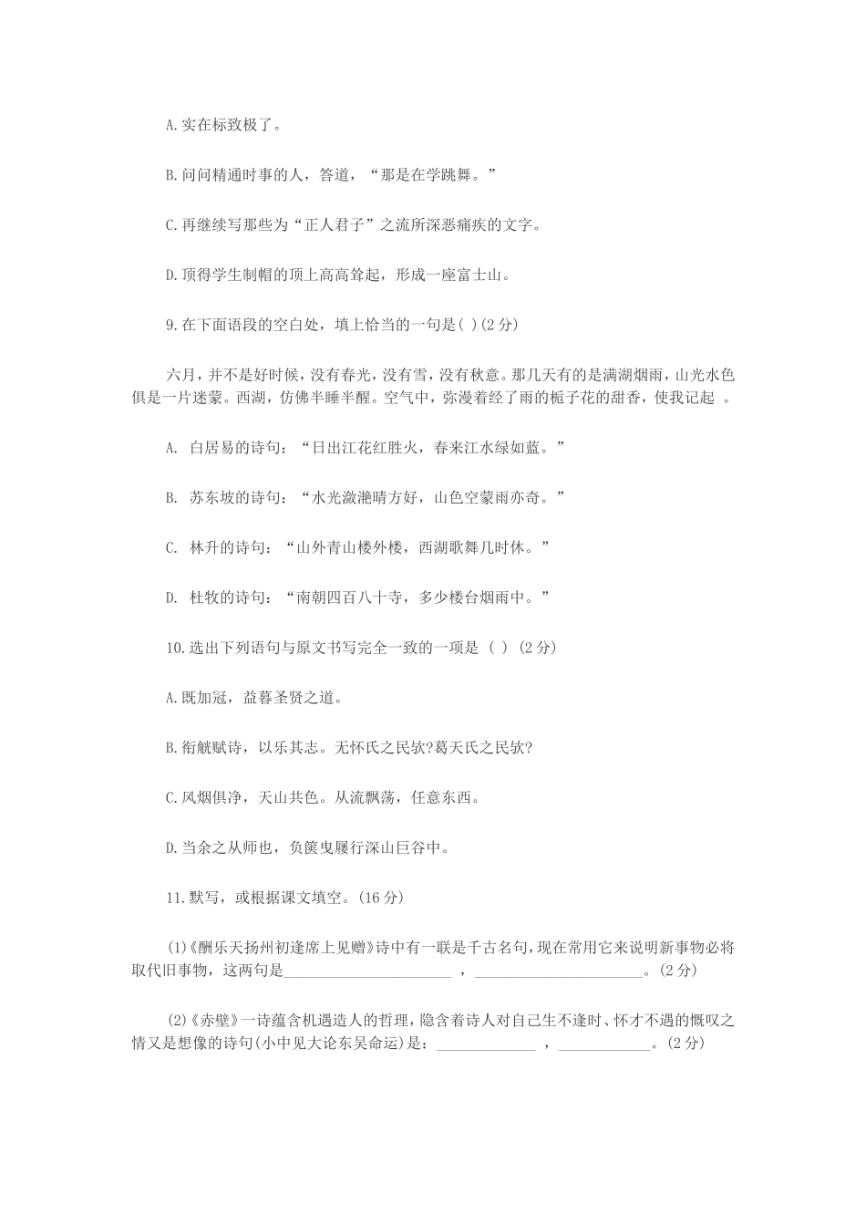 2013年八年级语文下册3月份月考检测试题(含答案)一、基础知识积累与运用(40分)1.选出下面加点字注音全都正确的一组()(2分)A.绯红(fēi)匿名(lì)杳无消息(yăo)汗流浃背(jiā)B.磨蹭(mó)掺和(chàn)文绉绉(zhōu)哄堂大笑(hōng)C.胡髭(zī)黝黑(yŏu)藏污纳垢(gòu)广袤无垠(mào)D.小憩(qì)绚丽(xuàn)冥(míng)思遐(xiá)想鸢(yuān)飞戾(lǐ)天2.下列词语中有两个错别字的一项是()(2分)A.高谈阔论坛花一现迫不及待窃窃私语B.神采奕奕彬彬有礼破镜重圆月白风清C.世外桃园晓风残月顺藤摸瓜事半功倍D.四面楚歌挺而走险厚此薄彼貌和神离3.选出解释有错的一项()(2分)A.鹤立鸡群:比喻一个人的才能或仪表在一群人里头显得很突出。B.正襟危坐:形容严肃庄重的样子。C.诚惶诚恐:惶恐不安。D.颔首低眉:一会抬起头,一会儿又显得很恭顺的样子。4.下列各句中加点的成语使用不恰当的一句是()(2分)A.其他队员们撤回到8100米的营地,养精蓄锐,以便在需要的时候为突击顶峰的队员提供各种支援。B.这对眼睛不会放过微不足道的细节,同样也能全面揭示广袤无垠的宇宙。C.我感到一种不言而喻的恐惧,一种同亲人隔绝、同大地分离的孤独感油然而生。D.做一个人,我们要行使自己的权利;做一个公民,我们要恪尽职守。5.下列句子中没有语病的一项是()(2分)A.北京市将努力改善生态环境,保证“绿色奥运”对北京环境质量的要求。B.南通的蓝印花布不仅闻名全国,而且享誉世界。C.通过中国男子足球队的表现,使我们认识到具有良好的心态是非常重要的。D.我们的报刊、电视、网络和宣传媒体,更有责任做是表率,杜绝用字不规范现象。6.下面句中标点符号使用完全正确的一项是()(2分)A.亲爱的宝贝已在腹中8个月了,是个美丽的姑娘呢?还是个漂亮的小伙?B.“没有老师来批评我的。”他微微一笑,又说,“只有这些树叶、小草,还有那朵紫豆角花,好像在批评我,说我以前太粗心大意,太不了解它们了。”C.在这横跨中国南部的“户外采风”中,东方遭遇了意想不到的困难:酷暑、严寒、狂风、暴雨、沙尘等……越向西就越是人烟稀少。东方不得不经常风餐露宿。D.种菜是我在狱中少有的能自主管理的事情。播下种子、观察生长、悉心照料、然后收获。成为这一方天地主人的感觉让我体会到一丝自由的滋味。7.填入横线的语句,与上下文衔接最恰当的一项是()(2分)雁阵之美,在于它能给现实生活提供哲思。有研究表明,雁阵飞行的速度能比单雁提高22%,因为飞行中雁的两翼可形成一个相对的真空状态;头雁没有真空,无法讨巧,但却是不停轮换的。,这确实值得作为思想群体的人类深思。A.为了团队共同的目标勇于牺牲自我B.雁阵里每一个成员能配合得如此之好C.人类与我们的大自然应怎样和谐相处D.任何团队总有一个精明的领导者8.选出修辞与其他三项不同的一项()(2分)A.实在标致极了。B.问问精通时事的人,答道,“那是在学跳舞。”C.再继续写那些为“正人君子”之流所深恶痛疾的文字。D.顶得学生制帽的顶上高高耸起,形成一座富士山。9.在下面语段的空白处,填上恰当的一句是()(2分)六月,并不是好时候,没有春光,没有雪,没有秋意。那几天有的是满湖烟雨,山光水色俱是一片迷蒙。西湖,仿佛半睡半醒。空气中,弥漫着经了雨的栀子花的甜香,使我记起。A.白居易的诗句:“日出江花红胜火,春来江水绿如蓝。”B.苏东坡的诗句:“水光潋滟晴方好,山色空蒙雨亦奇。”C.林升的诗句:“山外青山楼外楼,西湖歌舞几时休。”D.杜牧的诗句:“南朝四百八十寺,多少楼台烟雨中。”10.选出下列语句与原文书写完全一致的一项是()(2分)A.既加冠,益暮圣贤之道。B.衔觥赋诗,以乐其志。无怀氏之民欤?葛天氏之民欤?C.风烟俱净,天山共色。从流飘荡,任意东西。D.当余之从师也,负箧曳屦行深山巨谷中。11.默写,或根据课文填空。(16分)(1)《酬乐天扬州初逢席上见赠》诗中有一联是千古名句,现在常用它来说明新事物必将取代旧事物,这两句是______________________,______________________。(2分)(2)《赤壁》一诗蕴含机遇造人的哲理,隐含着诗人对自己生不逢时、怀才不遇的慨叹之情又是想像的诗句(小中见大论东吴命运)是:_____________,_________...