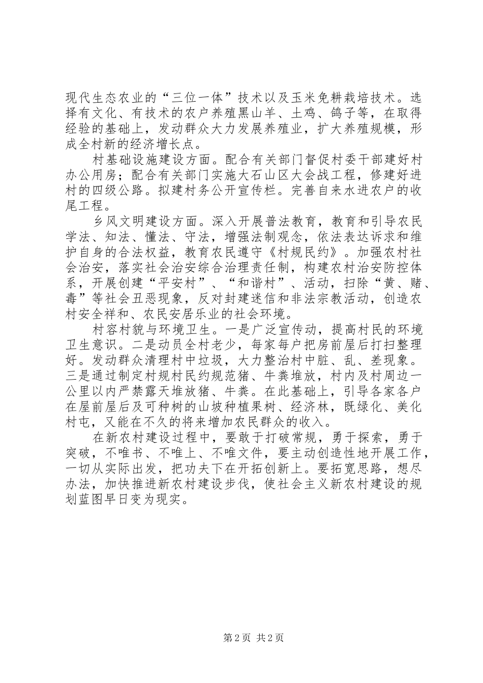新农村建设指导员工作计划 为扎实推进xx村新农村建设工作,促进全村经济、社会、文化等各项事业的全面发展,经与村党支部、村委干部讨论研究,并征求部分村民的意见,xx村 20*年新农村建设主要开展以下几项工作。 一、新农村建设指导思想: 以邓小平理论、“*”重要思想和党的*届五中全会精神为指导,认真贯彻落实科学发展观和中央《关于推进农村全面小康建设的诺干意见》精神,充分调动全村农民的积极性、主动性和创造性,以发展农村经济为中心,以增加农民收入和改善农民生产生活条件为重点,以解决农民群众最关心、最直接、最现实利益问题为切入点,深化农村改革,激活发展动力,加大投入力度,强化基础建设,发展社会事业,推进民主政治和精神文明建设,积极改善生活条件,构建繁荣、富裕、民主、和谐的社会主义新农村。 二、xx村 20*年新农村建设工作计划 按照“政府主导,农民主体,尊重民意,积极引导,先易后难,注重实效”的原则,年内开展的工作有: 制定新农村建设规划。在通过大量的调查研究的基础上,结合本村的实际,与村党支部、村委及群众一起制定出符合本村发展的社会主义新农村建设规划。 发展教育方面。“两基”迎国检是当前我市教育工作的一项重要工作,我市各级政府及各部门正在努力抓紧抓好此项工作。xx村小学在软、硬件方面都存在很多不足,当前学校的档案资料不齐全、不规范,学校的图书、教学仪器、体育器材都严重不足,学校没有铁门,没有文化宣传栏。近期内我将把主要精力放在帮助学校完善档案材料、查漏补缺、绿化美化校园等方面。发动有关部门及爱心人士给xx小学捐赠钱物,改善学校的办学条件。 发展生产方面。到农业科研部门引进二、三个优质、高产的品种到当地进行试验,在试验取得成功的基础上再进行推广。年内组织二期农业科技培训,提高群众的种养技术水平。推广第 1 页 共 2 页现代生态农业的“三位一体”技术以及玉米免耕栽培技术。选择有文化、有技术的农户养殖黑山羊、土鸡、鸽子等,在取得经验的基础上,发动群众大力发展养殖业,扩大养殖规模,形成全村新的经济增长点。 村基础设施建设方面。配合有关部门督促村委干部建好村办公用房;配合有关部门实施大石山区大会战工程,修建好进村的四级公路。拟建村务公开宣传栏。完善自来水进农户的收尾工程。 乡风文明建设方面。深入开展普法教育,教育和引导农民学法、知法、懂法、守法,增强法制观念,依法表达诉求和维护自身的合法...