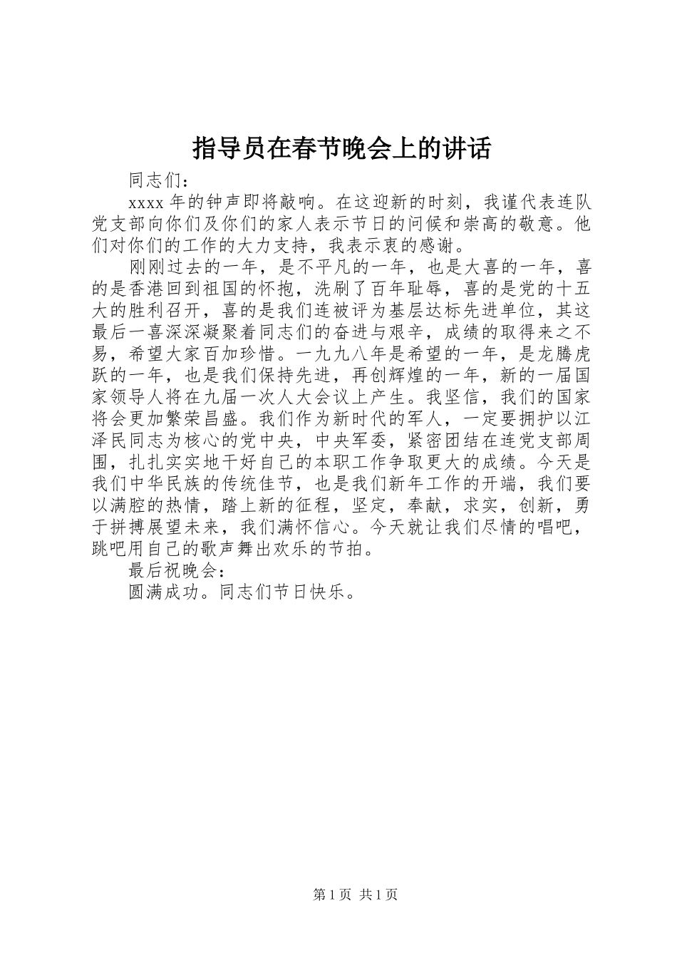 指导员在春节晚会上的讲话 同志们: xxxx 年的钟声即将敲响。在这迎新的时刻,我谨代表连队党支部向你们及你们的家人表示节日的问候和崇高的敬意。他们对你们的工作的大力支持,我表示衷的感谢。 刚刚过去的一年,是不平凡的一年,也是大喜的一年,喜的是香港回到祖国的怀抱,洗刷了百年耻辱,喜的是党的十五大的胜利召开,喜的是我们连被评为基层达标先进单位,其这最后一喜深深凝聚着同志们的奋进与艰辛,成绩的取得来之不易,希望大家百加珍惜。一九九八年是希望的一年,是龙腾虎跃的一年,也是我们保持先进,再创辉煌的一年,新的一届国家领导人将在九届一次人大会议上产生。我坚信,我们的国家将会更加繁荣昌盛。我们作为新时代的军人,一定要拥护以江泽民同志为核心的党中央,中央军委,紧密团结在连党支部周围,扎扎实实地干好自己的本职工作争取更大的成绩。今天是我们中华民族的传统佳节,也是我们新年工作的开端,我们要以满腔的热情,踏上新的征程,坚定,奉献,求实,创新,勇于拼搏展望未来,我们满怀信心。今天就让我们尽情的唱吧,跳吧用自己的歌声舞出欢乐的节拍。 最后祝晚会: 圆满成功。同志们节日快乐。第 1 页 共 1 页